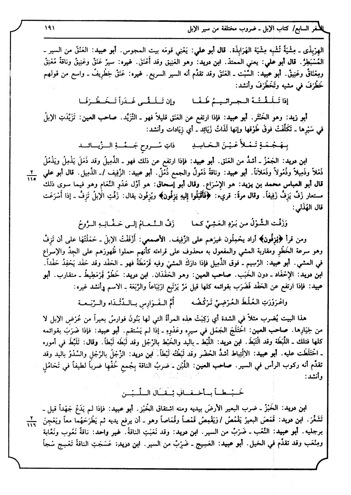 _ ابْن دُرَيْد الخَبْزُ ضرب الْبَعِير الأرضَ بيدَيْهِ وَمِنْه اشتقاق الخُبْز أَبُو عبيد فَإِذا لم َيَدعْ جَهْدًا قيل تَشَغَّرَ ابْن دُرَيْد قَمَصَ البعيرُ يَقْمُصُ وَيْقِمُص قَمْصًا وقُمَاصًا وَهُوَ أَن يرفع يَدَيْهِ ثمَّ يَطْرَحُهماً مَعًا ويَعْجِنَ برجليه أبوعبيد النَّعْب ضَرْبٌ من السّير ابْن دُرَيْد وَقد نَعَبَتِ الناقةُ غير وَاحِد ناقةٌ نَعُوب ونَعَّابة ومِنْعَب وَقد تقدَّم فِي الْخَيل أَبُو عبيد العَسِيج ضَرْبٌ من السّير ابْن دُرَيْد عَسَجَتِ الناقةُ تَعْسِج سْجًا