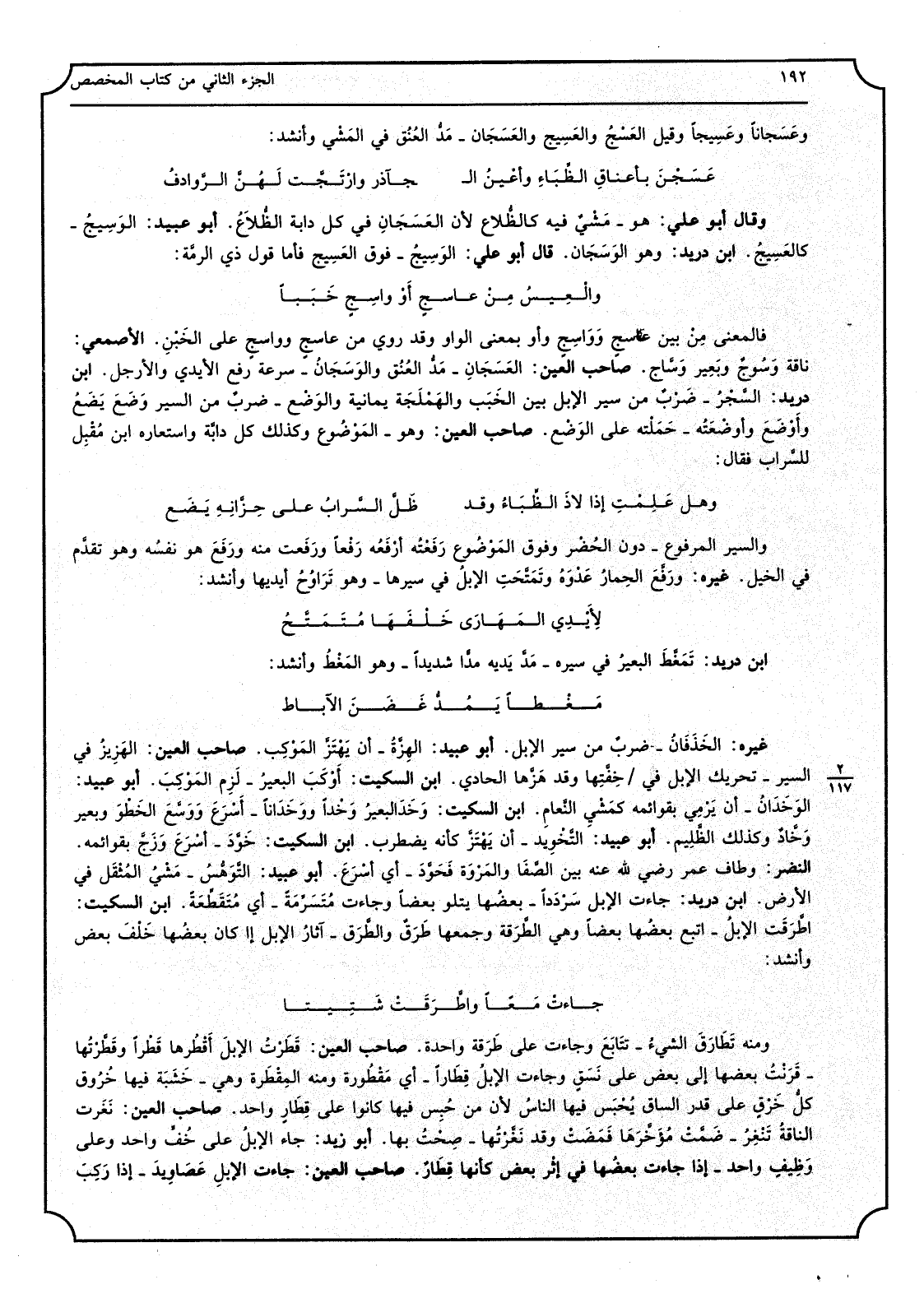 _ غَيره الخَذَفَانُ ضربٌ من سير الْإِبِل أَبُو عبيد الهِزَّةُ أَن يَهْتَزَّ المَوْكِب صَاحب الْعين الهَزِيزُ فِي السّير تَحْرِيك الْإِبِل فِي خِفَّتِها وَقد هَزَّها الْحَادِي ابْن السّكيت أَوْكَبَ البعيرُ لَزِم المَرْكِبَ أبوعبيد الوَخَدَانُ أَن يَرْمِي قوائمه كَمَشْي النَّعامِ ابْن السّكيت وخَدَ البعيرُ وَخْدًا ووَخَدَانًا أَسْرعَ وَوَسَّعَ الخَطْوَ وبعير وَخَّادٌ وَكَذَلِكَ الظَّليِم أبوعبيد التَّخْوِيد أَن يَهْتَزَّ كَأَنَّهُ يضطرب ابْن السّكيت خَوَّدَ أسْرَعَ وَزَجَّ بقوائمه النَّضر وَطَاف عمر رَضِي الله عَنهُ بَين الصَّفَا والمَرْوَة فَحَوَّدَ أَي أسْرَعَ أبوعبيد التَّوَهُّسُ مَشْيُ المُثْقَل فِي الأَرْض ابْن دُرَيْد جَاءَت الْإِبِل سَرْدَداً بعضُها يَتْلُو بَعْضًا وَجَاءَت مُتَسَرِّمَةٌ أَي مُتَقَطِّعَةٌ ابْن السّكيت اطَّرَقَت الإبلُ اتبع بعضُها بَعْضًا وَهِي الطَّرَقة وَجَمعهَا طَرَقٌ والطَّرَق آثارُ الْإِبِل إِذا كَانَ بعضُها خَلْفَ بعض وَأنْشد