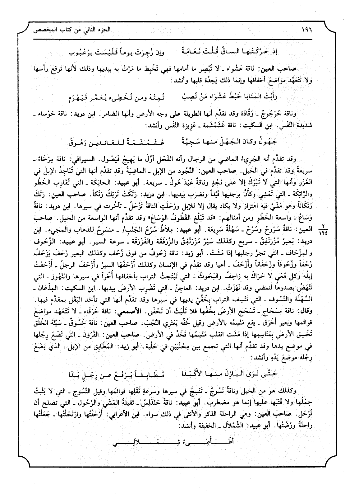 _ وَقد تقدَّم أَنه الجَرِيءُ الْمَاضِي من الرِّجَال وَأَنه الفَحْل أوَّلَ مَا يَهِيجُ فَيْصُول السيرافي نَاقَة مِرْخَاءٌ سريعةٌ وَقد تقدَّم فِي الْخَيل صَاحب الْعين النَّجُود من الْإِبِل الماضِيَةُ وَقد تقدَّم أَنَّهَا الَّتِي تُنَاجِدُ الإبلَ فِي الغَزْر وَأَنَّهَا الَّتِي لَا تَبْرُكُ إِلَّا على نَجْدٍ وناقةٌ عَيْدَ هُولٌ سريعة أبوعبيد الحانِكَة الَّتِي تُقَارِب الخَطْو والرَّاتِكة الَّتِي تَمْشِي وكأَنَّ برجليها قيْداً وتضرب بِيَدَيْهَا ابْن دُرَيْد رتَكَتْ تَرْْتِكُ رَتْكاً صَاحب الْعين رَتَّكَ رَتَكَاناً وَهُوَ مَشْيٌ فِيهِ اهتزاز وَلَا يكَاد يُقَال إِلَّا لِلْإِبِلِ وزَحَلَتِ الناقةُ تَزْحَلُ تأخَّرت فِي سَيرهَا ابْن دُرَيْد ناقةٌ وَسَاعٌ وَاسِعَة الخَطْوِ وَمن أمثالهم // (قد تَبْلُغ القُطُوفُ الوَسَاعَ) // وَقد تقدَّم أَنَّهَا الواسعة من الْخَيل صَاحب الْعين ناقةٌ سَرُوحٌ وسُرُحٌ سَهْلةٌ سَرِيَعَة أَبُو عبيد مِلاَطٌ سُرُوحُ الجَنْبِ منَسرِحٌ للذهاب والمجيء ابْن دُرَيْد بَعيرٌ مُزْرَنْفِقٌ سريع وَكَذَلِكَ سيْرٌ مُزْرَنْفِقٌ والزَّرْفَقَة والفَزْرَقَة سرعَة السّير أَبُو عبيد الزَّحُوف والمِزْحَاف الَّتِي تجرُّ رِجْلَيْهَا إِذا مَشَتْ أَبُو زيد نَاقَة زَحُوفٌ من فَوق زُحُف وَكَذَلِكَ الْبَعِير زَحَفَ يَزْحَفُ زَحْفاً وزُحُوفاً وزَحَفَاناً وأَزْحَفَ أعيا وَقد تقدَّم فِي الْإِنْسَان وَكَذَلِكَ أَزْحَفَها السيرُ وأزْحَفَ الرجلُ أَزْحَفَتْ إبلُه وكل مُعْيِ لَا حَرَاكَ بِهِ زاحِفٌ والبَحُوثُ الَّتِي تبْتَحِثُ التُّرَاب بأخفافها أُخُراً فِي سَيرهَا والنَّهُوزُ الَّتِي تَنْهَضُ بصدرها لتمضي وَقد نَهَرزَتْ ابْن دُرَيْد العاجِنُ الَّتِي تَضْرِب الأرضَ بِيَدَيْهَا ابْن السّكيت المِذْعَان السَّهْلَة والنَّسُوف الَّتِي تَنْسِف التُّرَاب بخُفَّيْ يَديهَا فِي سَيرهَا وَقد تقدَّم أَنَّهَا الَّتِي تَأْخُذ البَقْل بمقدَّم فِيهَا وَقَالَ نَاقَة مِسْحَاج تَسْحَج الأَرْض بخُفِّها فَلَا تَلْبَثَ أَن تَحْفَى الْأَصْمَعِي نَاقَة خَرْقاء ابْن دُرَيْد لَا تَتَعَهَّد مواضعَ قَوَائِمهَا وبعير أَخْرَقَ يَقع مَنْسِمُه بِالْأَرْضِ وَقيل خُفِّه يَعْتَرِي النُّجُبَ صَاحب الْعين نَاقَة خَسُوقٌ سَيِّئَة الخُلُق تَخْسِق الأرضَ بِمَنَاسِمِها إِذا مشَت انْقَلب مَنْسِمُها فَخَدَّ فِي الأَرْض صَاحب الْعين القَرُون الَّتِي تَضَعَ رِجْلها فِي مَوضِع يَدهَا وَقد تقدَّم أَنَّهَا الَّتِي تجمع بَين مِحْلَبَيْنِ فِي حَلْبة أَبُو زيد المُطَابِق من الْإِبِل الَّذِي يَضَعُ رِجْله موضعَ يَدْهِ وَأنْشد
