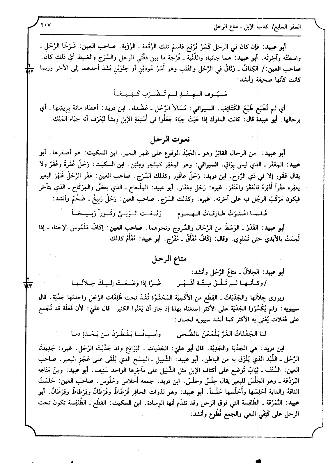 3 - أَبُو عبيد من الرّحال القاتِرُ وَهُوَ الجَيِّدُ الْوُقُوع على ظهر الْبَعِير ابْن السّكيت هُوَ أصغرها أَبُو عبيد المِعْقَر الَّذِي لَيْسَ بِوَاقِ السيرافي وَهُوَ المِعْقِر كمِنْخِر ومِنْتِن ابْن السّكيت رَحْلٌ عُقَرةٌ وعُقَرٌ وَلَا يُقَال عَقُور إِلَّا فِي ذِي الرُّوح ابْن دُرَيْد رَحْلٌ عاقُور وَكَذَلِكَ السَّرْج صَاحب الْعين عَقَر الرَّحْلُ ظَهْرَ الْبَعِير يعقِره عَقْرًا أدْبَرَهُ فانْعَقَرَ واعْتَقَرَ غَيره رَحْل مِعْقَار أَبُو عبيد المِلْحاح الَّذِي يَعَضُّ والمِرْكَاح الَّذِي يتَأَخَّر فَيكون مَرْكَبُ الرجُل فِيهِ على آخرته غَيره وَكَذَلِكَ السَّرْج صَاحب رَحْلٌ رَبِيخٌ ضَخْمٌ وَأنْشد