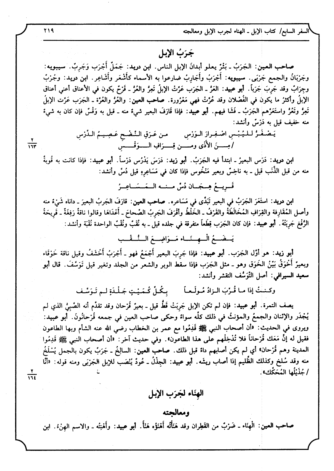 3 - صَاحب الْعين الجَرَبُ بَثْرٌ يَعْلُو أبدانَ الْإِبِل النَّاس ابْن دُرَيْد جَمَلٌ أَجْرَب وَجَرِبٌ سِيبَوَيْهٍ وجَرْبَانُ وَالْجمع جَرْبَى سِيبَوَيْهٍ أَجْرَبُ وأَجَارِبُ ضارعوا بِهِ الْأَسْمَاء كأَشْعَر وأَشَاعِر ابْن دُرَيْد وجُرْبٌ وجِرَاٌب وَقد جَرِبَ جَرَبًا أَبُو عبيد العَرُّ الجَرَب عَرَّتْ الإبلُ تَعِرُّ والعُرُّ قَرْحٌ يكون فِي الْأَعْنَاق أَعنِي أَعْنَاق الإبلُ وأكثرُ مَا يكون فِي الفُصْلان وَقد عُرَّتْ فَهِيَ مَعْرُورة صَاحب الْعين والعُرُّ والعُرَّة الجَرَب عَرّت الإبلُ تَعِرُّ وتَعَرُّ واسْتَعَرَّهم الجَرَبُ فَشَا فيهم أَبُو عبيد فَإِذا قَارَفَ الْبَعِير شيءٌ مِنْهُ قيل بِهِ وَقْسٌ فَإِن كَانَ بِهِ شيءٌ مِنْهُ خَفِيف قيل بِهِ دَرْسٌ وَأنْشد
