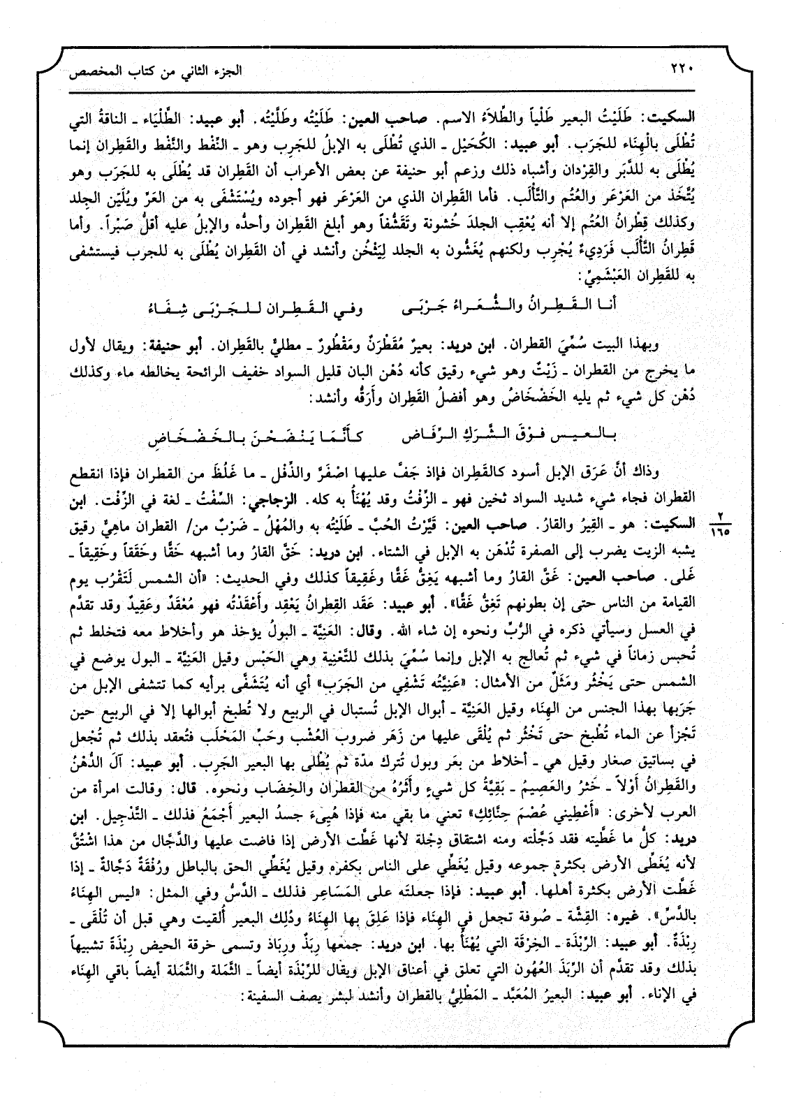أَبُو عبيد عَقَد القِطرانُ يَعْقِد وأَعْقَدْتُه فَهُوَ مُعْقَدٌ وعَقِيدٌ وَقد تقدَّم فِي الْعَسَل وَسَيَأْتِي ذكره فِي الرُّبِّ وَنَحْوه إِن شَاءَ الله وَقَالَ العَنِيَّة البولُ يُؤْخَذ هُوَ وأخلاط مَعَه فتخلط ثمَّ تُحبس زَمَانا فِي شَيْء ثمَّ تُعالج بِهِ الْإِبِل وَإِنَّمَا سُمِّيَ بذلك للتَّعْنِية وَهِي الحَبْس وَقيل العَنِيَّة الْبَوْل يوضع فِي الشَّمْس حَتَّى يَخْثُر ومَثَلٌ من الْأَمْثَال // (عَنِيَّتُه تَشْفِي من الجَرَب) // أَي أَنه يُتَشَفَّى بِرَأْيهِ كَمَا تتشفى الْإِبِل من جَرَبها بِهَذَا الْجِنْس من الهِنَاء وَقيل العَنِيَّة أَبْوَال الْإِبِل تُستبال فِي الرّبيع وَلَا تُطبخ أبوالها إِلَّا فِي الرّبيع حِين تَجْزأ عَن المَاء تُطْبخ حَتَّى تَخْثُر ثمَّ يُلْقَى عَلَيْهَا من زَهَر ضروب العُشْب وحَبِّ المَحْلَب فتُعقد بذلك ثمَّ تُجْعل فِي بساتيق صغَار وَقيل هِيَ أخلاط من بعَر وَبَوْل تُترك مدّة ثمَّ يُطْلى بهَا الْبَعِير الجَرِب أَبُو عبيد آلَ الدُّهْنُ والقَطِرانُ أَوْلاً خَثرُ والعَصِيمُ بَقِيَّةُ كل شيءٍ وأَثَرُهُ من القطران والخِضَاب وَنَحْوه قَالَ وَقَالَت امْرَأَة من الْعَرَب لأخرى // (أَعْطِيني عُصْمَ حِنَّائِكِ) // تَعْنِي مَا بَقِي مِنْهُ فَإِذا هُيِئَ جسدُ الْبَعِير أَجْمَعُ فَذَلِك التَّدْجِيل ابْن دُرَيْد كلُّ مَا غَطَّيته فقد دَجَّلْته وَمِنْه اشتقاق دِجْلة لِأَنَّهَا غَطَّت الأَرْض إِذا فاضت عَلَيْهَا والدَّجَّال من هَذَا اشْتُقَّ لِأَنَّهُ يُغَطِّى الأَرْض بكثر جموعه وَقيل يُغَطِّي على النَّاس بِكُفْرِهِ وَقيل يُغَطِّي الْحق بِالْبَاطِلِ ورُفْقَةٌ دَجَّالةٌ إِذا غَطَّت الأَرْض بِكَثْرَة أَهلهَا أَبُو عبيد فَإِذا جعلتَه على المَسَاعِر فَذَلِك الدَّسُّ وَفِي الْمثل // (لَيْسَ الهِنَاءُ بالدَّسِّ) // غَيره القِشَّة صُوفة تجْعَل فِي الهِنَاءُ فَإِذا عَلِق بهَا الهِنَاءُ وُدِلك الْبَعِير ألُقيت وَهِي قبل أَن أَن تُلْقَى رِبْذَةٌ أَبُو عبيد الرِّبْذَة الخِرْقَة الَّتِي يُهْنَأُ بهَا ابْن دُرَيْد جمعهَا رِبَذٌ ورِبَاذ وَتسَمى خرقَة الْحيض رِبْذَة تَشْبِيها بذ 1 لَك وَقد تقدَّم أَن الرَّبَذَ العُهُون الَّتِي تعلق فِي أَعْنَاق الْإِبِل وَيُقَال للرِّبْذَة أَيْضا الثَّمَلة والثَّمَلة أَيْضا بَاقِي الهِنَاء فِي الْإِنَاء أَبُو عبيد البعيرُ المُعَبَّد المَطْلِيُّ بالقطران وَأنْشد لبشر يصف السَّفِينَة