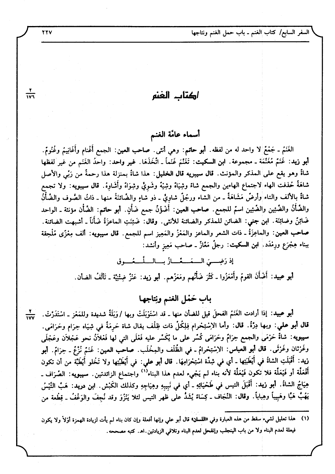 2 - الغَنَمُ جَمْعٌ لَا وَاحِد لَهُ من لَفظه أَبُو حَاتِم وَهِي أُنْثَى صَاحب الْعين الْجمع أغْنام وأَغَانِيمُ وغُنُومٌ أَبُو زيد غَنَمٌ مُغَنَّمَة مَجْمُوعَة ابْن السّكيت تَغَنَّمَ غَنَماً اتَّخَذّها غير وَاحِد واحدُ الغَنَم من غير لَفظهَا شاةٌ وَهُوَ يَقع على الْمُذكر والمؤنث قَالَ سِيبَوَيْهٍ قالالخليل هَذَا شاةٌ بِمَنْزِلَة هـ 1 ارحمةٌ منرَبِّي وَالْأَصْل شاهَةٌ حُذفت الْهَاء لِاجْتِمَاع الهاءين وَالْجمع شاءٌ وشِيَاهٌ وشِيْهٌ وشَوِيٌّ وشِوَاهٌ وأَشَاوِهُ قَالَ سِيبَوَيْهٍ وَلَا تجمع شاةٌ بِالْألف وأرضٌ مَشَاهَةٌ من الشَّاء ورجُلٌ شاوِيٌّ ذُو شاءٍ والضَّائنَةُ مِنْهَا ذاتُ الصُّوف والضَّأْنُ الضَّأْنُ والضَّئِين والضَّئِين اسمٌ للْجمع صَاحب الْعين أَضْؤُنٌ جمع ضَأْنٍ أَبُو حَاتِم الضَّأْن مُؤَنّثَة الْوَاحِد ضَائِنٌ وضائِنَة ابْن جني الضائن للمذكر والضائنة للْأُنْثَى وَقَالَ ضَئِنَتِ الماعزَةُ ضَأَناً أشهبت الضائنة صَاحب الْعين والماعِزَةُ ذَات الشّعْر والماعز والمَعْزُ والمَعِيز اسْم للْجمع قَالَ سِيبَوَيْهٍ ألف مِعْزّى مُلْحِقة بِبِنَاء هِجْرَع ورِمْدَد ابْن السّكيت رجلٌ مَعَّازٌ صَاحب مَعِيزٍ وَأنْشد