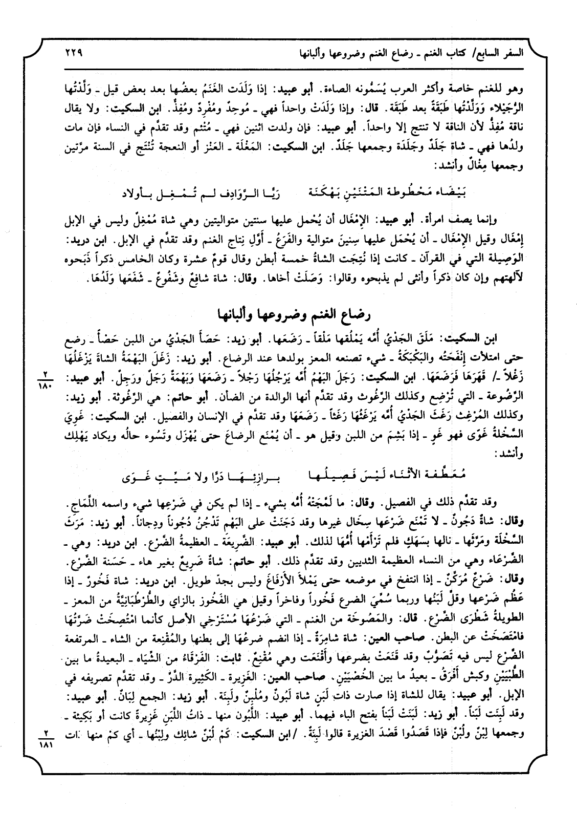 3 - ابْن السّكيت ? َلَقَ الجَدْيُ ? ُمَّه ? َمْلُقها ? َلْقًا ? َضَعَها أَبُو زيد ? َصَأَ الجَدْيُ من اللَّبن ? َصْاَ رضع حَتَّى امتلات إنْفَحَتُه والبَكْبَكَةُ شَيْء تَصنعهُ الْمعز بِوَلَدِهَا عِنْد الرَّضَاع أَبُو زيد ? َغَلَ البَهْمَةُ الشاةَ ? َزْغَلُهَا ? َغْلاَ ? َهَرَهَا ? َرَضَعَهَا ابْن السّكيت ? َجَلَ البَهْمُ ? ُمَّه ? َرْحُلُهَا ? َجْلاً ? َضَعَهَا ? َبَهْمَةٌ ? َجَلٌ ورَجِلٌ أبوعبيد الرَّضُوعة الَّتِي ? ُرْضِع وَكَذَلِكَ الرَّغُوث وَقد تقدَّم أَنَّهَا الوالدة من الضَّأْن أَبُو حَاتِم هِيَ الرَّغُوثة أَبُو زيد وَكَذَلِكَ المُرْغِث ? َغَثَ الجَدْيُ أُمَّه ? َرْغَثُهَا ? َغَثًا ? َضَعَهَا وَقد تقدَّم فِي الانسان والفصيل ابْن السّكيت ? َوِيَ السَّخْلةُ ? َوّى فهوغَوٍ إِذا ? َشِمَ من ? للبن وَقيل هُوَ ان ? ُمْنَع الرضاعَ حَتَّى ? ُهْزَل وتَسُوء حالُه ويكاد ? َهْلِك وَأنْشد