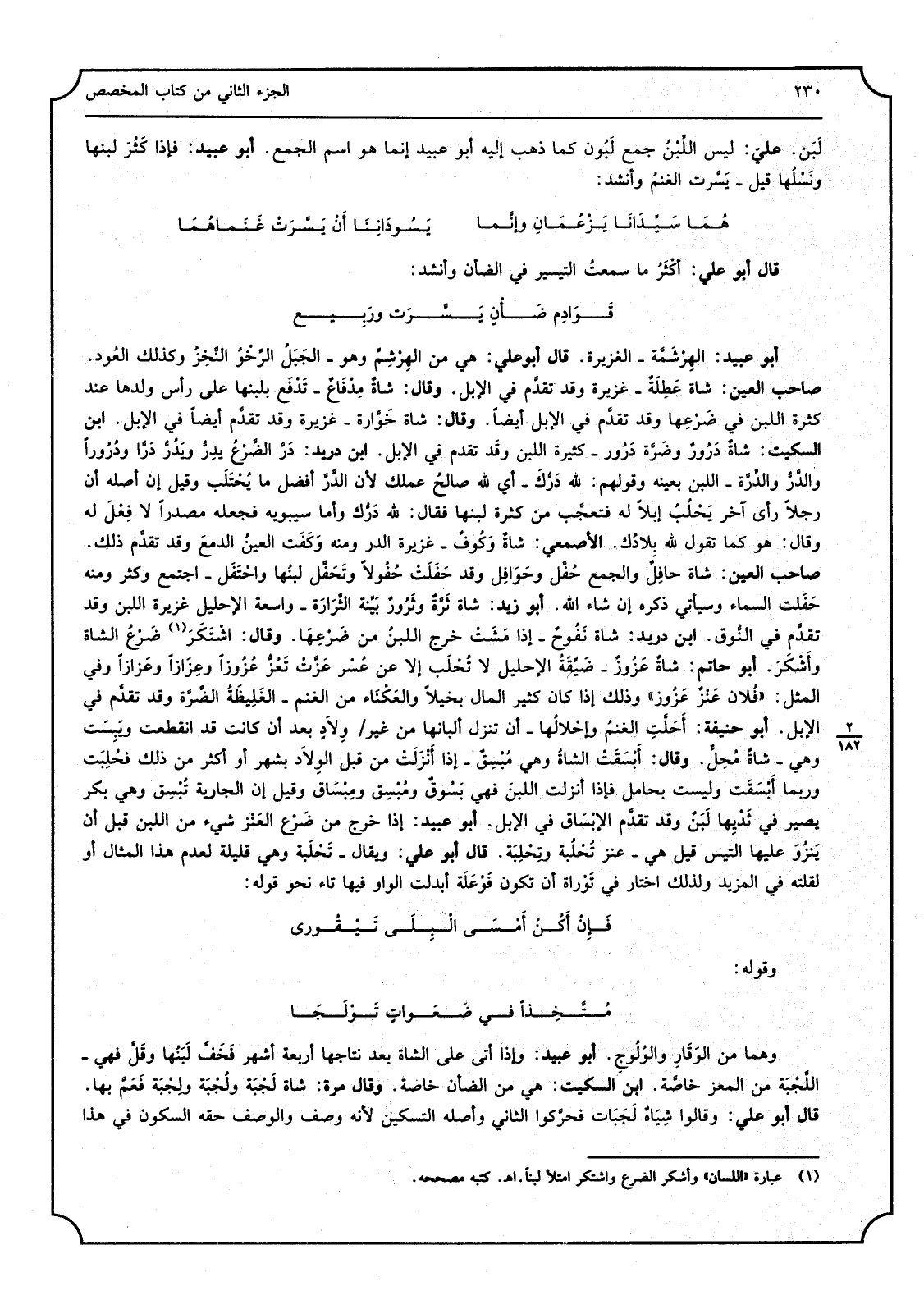 _ أَبُو عبيد الِهْرشَمَّة الغزيزة قَالَ أَبُو عَليّ هِيَ من الِهْرشِمٌ وَهُوَ الجَبَلُ الرَّخْوُ النَّخِرُ وَكَذَلِكَ العُود صَاحب الْعين شَاة ? َطِلَةٌ غزيرة وَقد تقدَّم فِي الابل وَقَالَ شاةٌ ? ِدْفَاعٌ ? َدْفَع بلبنها على رَأس وَلَدهَا عِنْد كَثْرَة اللَّبن فِي ? َرْعها وَقد تقدَّم فِي الابل أَيْضا وَقَالَ شاةٌ ? َوَّارة غزيرة وَقد تقدَّم أَيْضا فِي الابل ابْن السّكيت شاةٌ ? َرُورٌ وضَرَّة ? َرُور كَثِيرَة اللَّبن وَقد تقدم فِي الابل ابْن دُرَيْد ? َرَّ الضَّرْع يدِرُُّ ويَدُرُّ ? َرًّا ودُرُورًا والدَّرُّ والدِّرَّة اللَّبن بِعَيْنِه وَقَوْلهمْ لله ? َرُّك أَي لله صالحُ عَمَلك لَان الدَّرَّ أفضل مَا ? ُحْتَلَب وَقيل ان أَصله أَن رجلا رأى آخر ? َحْلُبُ إبِلا لَهُ ? َتَعَجَّبَ من كَثْرَة لَبنهَا فَقَالَ لله ? َرَّك وَأما سِيبَوَيْهٍ ? َجَعَله مصدرا لَا ? ِعْلَ لَهُ وَقَالَ هُوَ كَمَا تَقول لله ? ِلادُك الْأَصْمَعِي شاةٌ ? َكُوفٌ غزيرة الدّرّ وَمِنْه ? َكَفَت العيُن الدمعَ وَقد تقدَّم ذَلِك صَاحب الْعين شَاة حافِلٌ وَالْجمع ? ُفَّل وحَوَافِل وَقد ? َفَلَتْ ? ُفُولاً وتَحَفَّل لَبنهَا واحْتفَل اجْتمع وَكثر وَمِنْه ? َفَلت السَّمَاء وَسَيَأْتِي ذكره ان شَاءَ الله أَبُو زيد شَاة ? َرَّةٌ وثَرُورٌ ? َيِّنة الثَّرَارَة وَاسِعَة الاحليل غزيرة اللَّبن وَقد تقدَّم فِي النُّوق ابْن دُرَيْد شَاة ? َفُوحٌ إِذا ? َشَتْ خرج ? للبُن من ? َرْعِهَا وَقَالَ اشْتَكَرَ ? َرْعُ الشَّاة ? أَشْكَرَ أَبُو حَاتِم شاةٌ ? َزُوزٌ ? َيِّقَةُ ? لإحليل لَا ? ُحْلَب إِلَّا عَن ? ُسْر ? َزَّتْ ? َعُزُّ ? ُزُوزًا وعِزَازًا وعَزَازًا وَفِي الْمثل // (? ُلان ? َنْزٌ ? َزُوز) // وَذَلِكَ إِذا كَانَ كثير المَال بَخِيلًا والعنَكْناء من الْغنم الغَلِيظَةُ الضَّرَّة وَقد تقدَّم فِي ? لإبل أَبُو حنيفَة ? َحَلَّتِ الغنمُ ? إحْلاَلُها أَن تنزل أَلْبَانهَا من غير ? ِلادٍ بعد أَن كَانَت قد انْقَطَعت ويَبِسَت وَهِي شاةٌ ? ُحِلٌّ وَقَالَ ? َبْسَقَتْ الشاةُ وَهِي ? ُبْسِق أذا ? َنْزَلَتْ من قبل الوِلاَد بِشَهْر أَو أَكثر من ذَلِك فحُلِبَت وَرُبمَا ? َبْسقَت وَلَيْسَت بحامل فاذا أنزلت اللَّبنَ فَهِيَ ? َسُوقٌ ومُبْسِق ومِبْسَاق وَقيل ان الْجَارِيَة ? ُبْسِق وَهِي بكر يصير فِي ? َدْيِها ? َبَنٌ وَقد تقدَّم ? لإبْسَاق فِي ? لإبل أَبُو عبيد إِذا خرج من ? َرْع العَنْز شَيْء من ? للبن قيل أَن ? َنُزوَ عَلَيْهَا التيس قيل هِيَ عنز ? ُحْلُبة وتِحْلِبَة قَالَ أَبُو عَليّ وَيُقَال تحلبة وَهِي قَليلَة لعدم هَذَا الْمِثَال أولقلته فِي الْمَزِيد وَلذَلِك اخْتَار فِي ? َوْراة أَن تكون ? َوْعَلَة أبدلت الْوَاو فِيهَا تَاء نَحْو قَوْله