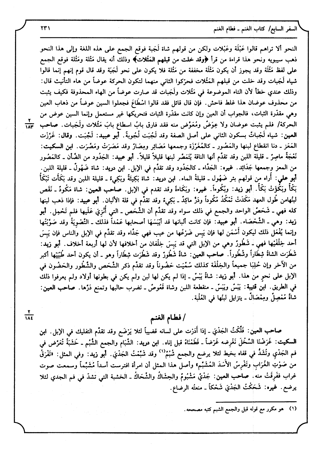 _ النَّحْو أَلا تراهم قَالُوا عَبْلَة وعَبْلات وَلَكِن قَوْلهم شَاة لَحَبة فَوَقع الْجمع على هَذِه اللُّغَة وَإِلَى هَذَا النَّحْو ذهب سِيبَوَيْهٍ وَنَحْو هَذَا قِرَاءَة من قَرَأَ وَقد خلت من قبلهم المَثُلات وَذَلِكَ أَنه يُقَال مَثْله ومَثُله فَوَقع الْجمع على لفظ مَثُلَة وَقد يجوز أَن يكون مَثْلَة مُخَفّفَة من مَثُلَة فَلَا يكون على نَحْو لَجَبَة وَقد قَالَ قوم إِنَّهُم قَالُوا شِيَاه لَجَبات وَقد خلت من قبلهم المَثُلات فحرّكوا الثَّانِي مِنْهُمَا لتَكون الْحَرَكَة عوضا من هَاء التَّأْنِيث قَالَ وَذَلِكَ عِنْدِي خطأ لِأَن التَّاء الْمَوْضُوعَة فِي مَثُلات ولَجَبات قد صَارَت عوضا من الْهَاء المحذوفة فَكيف يثبت من مَحْذُوف عوضان هَذَا غلط فَاحش فَإِن قَالَ قَائِل فقد قَالُوا اسْطَاعَ فَجعلُوا السِّين عوضا من ذهَاب الْعين وَهِي مقدّرة الثَّبَات فَالْجَوَاب أَن الْعين وَإِن كَانَت مقدّرة الثَّبَات فتحريكها غير مُسْتَعْمل وَإِنَّمَا السِّين عوض من الْحَرَكَة فَلم يثبت عوضان وَلَا عِوَضٌ ومُعَوَّض مِنْهُ فقدفارق بابُ اسطاع بابَ مَثُلات ولَجَبات صَاحب الْعين شِيَاه لَجْباتٌ بِسُكُون الثَّانِي على أصل الصّفة وَقد لَجُبَت لُجُوبةٌ أَبُو عبيد لَجَّبَت وَقَالَ غَرَّزَت المَعَز دنا انْقِطَاع لَبنهَا والمَصُور كالمُغَرِّزَة وَجَمعهَا مَصَائِر ومِصَارٌ وَقد مَصَرَتْ ومَصَّرَت ابْن السّكيت نَعْجَةٌ ماصِرٌ قَليلَة اللَّبن وَقد تقدَّم أَنَّهَا النَّاقة يُتَمَصَّرلبنها قَلِيلا أَبُو عبيد الجَدُود من الضَّأن كالمَصُور من الْمعز وَجَمعهَا جَدَائِد غَيره الجَدَّاء كالجَدُود وَقد تقدَّم فِي الْإِبِل ابْن دُرَيْد شَاة ضَهُولٌ قَليلَة اللَّبن أَبُو عَليّ أُراه من قَوْلهم بِئْر ضَهُول قليلةُ المَاء ابْن دُرَيْد شَاة بَطِيئَةٌ وبَكِيءٌ قَليلَة اللَّبن وقدبَكَأَت تَبْكَأُ بَكْأً وبَكُؤَتْ بَكْأً أَبُو زيد وبُكُوءاً غَيره وبَكَاءةٌ وقدتقدم فِي الْإِبِل صَاحب الْعين شَاة مَكُودٌ نَقَص لبُنها من طُول الْعَهْد مَكَدَتْ تَمْكُدُ مُكُوداً ودَرُّ ماكِدٌ بِكِيءٌ وَقد تقدَّم فِي قلَّة الألبان أَبُو عبيد فَإِذا ذهب لَبنهَا كُله فَهِيَ شَحَصٌ الْوَاحِد وَالْجمع فِي ذَلِك سَوَاء وَقد تقدَّم أَن الشَّحَص الَّتِي أُثْرِيَ عَلَيها فَلم تَحْمِل أَبُو زيد وَهِي الشَّحْصَاء أَبُو عبيد فَإِن كَانَت أَلْبَانهَا قد أيْبَسَهَا أَصْحَابهَا عَمْداً فَذَلِك التَّصْوِيةُ وَقد صَوَّبْتُها وَإِنَّمَا يُفْعَل ذَلِك ليَكُون أَسْمَن لَهَا فَإِن يَبِس ضَرْعُها من عيب فَهِيَ جَدَّاء وَقد تقدَّم فِي الْإِبِل وَالنَّاس فَإِن يَبِسَ أحد خِلْفَيْها فَهِيَ شَطُورٌ وَهِي من الْإِبِل الَّتِي قد يَبِسَ خِلْفان من أخلافها لِأَن لَهَا أَرْبَعَة أخلاف أَبُو زيد شَطَرَت الشاةُ شِطَاراً وشُطُوراً صَاحب الْعين شاةٌ شَطُورٌ وَقد شِطُرَت شِطَاراً وَهُوَ أَن يكون أحد طُبْيَيْها أكبر من الآخر وَإِن خُلِبَا جَمِيعًا والخِلْفَة كَذَلِك سًمِّيَت خَضُوناً وَقد تقدَّم ذكر الشَّحَص والشَّطُور والحَضُون فِي الْإِبِل على نحوٍ من هَذَا أَبُو زيد شاةٌ يَبْسٌ إِذا لم يكن لَهَا لبن وَلم يكن فِي بطونها أَوْلَاد وَلم يعرفوا ذَلِك فِي الطَّرِيق ابْن قُتَيْبَة يَبْسٌ ويَبَسٌ مُنْقَطِعَة اللَّبن وشَاة قَعُوسٌ تضرب حالبها وتمنع دَرَّها صَاحب الْعين شاةٌ مُمْصِلٌ ومِمْصَالٌ يتزايل لبنُها فِي العُلْبة.