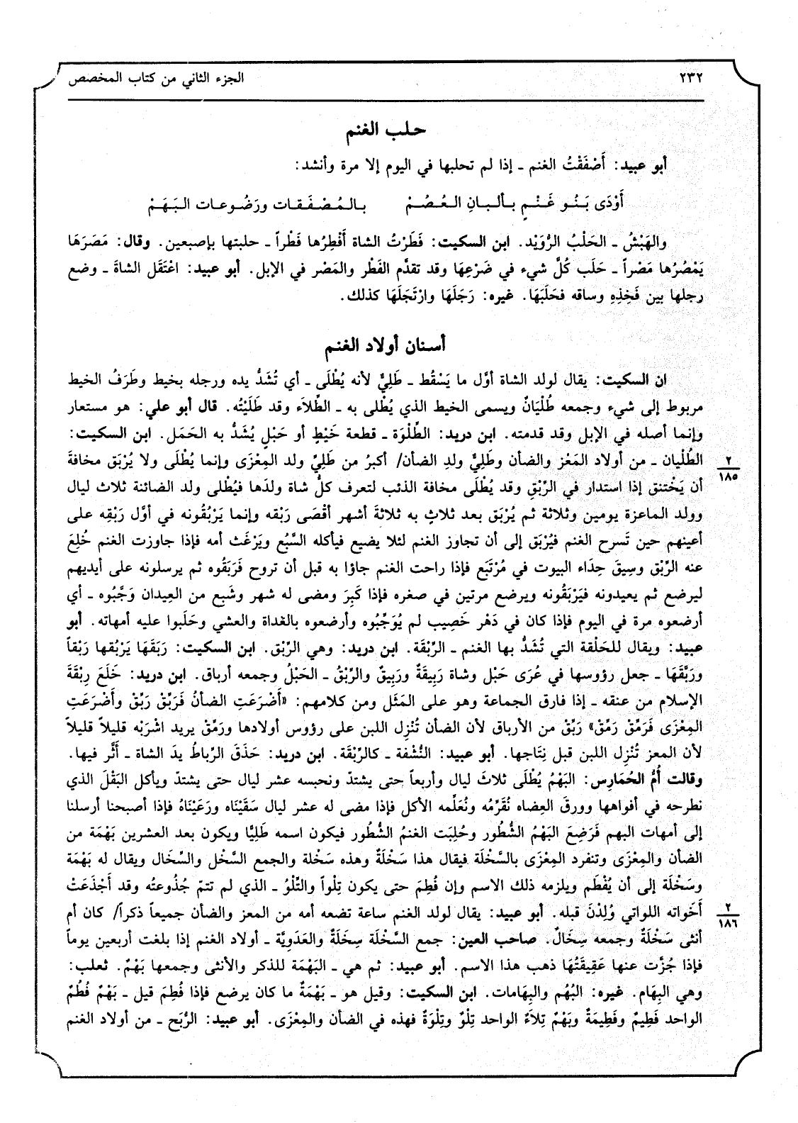 3 - ابْن السّكيت يُقَال لولد الشَّاة أوَّل مَا يَسْقُط طَلِيُّ لِأَنَّهُ يُطْلَى أَي تُشَدُّ يَده وَرجله بخيط وطَرَفُ الْخَيط مربوط إِلَى شَيْء وَجمعه طُلْيَانٌ وَيُسمى الْخَيط الَّذِي يُطْلى بِهِ الطِّلاَء وَقد طَلَبْتُه قَالَ أَبُو عَليّ هُوَ مستعار وَإِنَّمَا أَصله فِي الْإِبِل وَقد قَدمته ابْن دُرَيْد الطُلْوَة قِطْعَة خَيْطِ أَو حَبْلٍ يُشَدُّ بِهِ الحَمَل ابْن السّكيت الطُلْيان من أَوْلَاد المَعْز والضأن وطَلِيِّ ولدِ الضَّأْن أكبرُ من طَلِيِّ المِعْزَى وَإِنَّمَا يُطْلى وَلَا يُرْبَق مخافةَ أَن يَخْتنق إِذا اسْتَدَارَ فِي الرِّبِقِ وَقد يُطْلَى مَخَافَة الذِّئْب لتعرف كلُّ شَاة ولدَها فيُطْلى ولد الضائنة ثَلَاث لَيَال وَولد الماعزة يَوْمَيْنِ وَثَلَاثَة ثمَّ يُرْبَق بعد ثلاثٍ بِهِ ثلاثةَ أشهر أقْصَى رَبْقة وَإِنَّمَا يَرْبُقُونه فِي أوَّل رَبْقِه على أَعينهم حِين تَسرح الْغنم فيُرْبَق إِلَى أَن تجَاوز الْغنم لِئَلَّا يضيع فيأكله السَّبُع ويَرْغَث أمه فَإِذا جَاوَزت الْغنم خُلِعَ عَنهُ الرِّبْق وسِيقَ حِدَاء الْبيُوت فِي مُرْتَبَع فَإِذا راحت الْغنم جاؤا بِهِ قبل أَن تروح فَرَبَقُوه ثمَّ يرسلونه على أَيْديهم ليرضع ثمَّ يعيدونه فَيرَبَقُونه ويرضع مرَّتَيْنِ فِي صغره فَإِذا كَبِرَ مضى لَهُ شهر وشَبع من العِيدان وَجَّبُوه أَي أرضعوه مرّة فِي الْيَوْم فَإِذا كَانَ فِي دَهْر خَصِيب لم يوَجَّبُوه وأرضعوه بِالْغَدَاةِ والعشي وحَلَبوا عَلَيْهِ أمهاته أَبُو عبيد وَيُقَال للحَلْقة الَّتِي تُشَدُّ بهَا الْغنم الرِّبْقَة ابْن دُرَيْد وَهِي الرِّبْق ابْن السّكيت رَبَقَهَا يَرْبُقها رَبْقًا ورَبَّقَهَا جعل رؤوسها فِي عُرَى حَبْل وشَاة رَبِيقَةٌ ورَبِيقٌ والرِّبْقُ الحَبْلُ وَجمعه أرْباق ابْن دُرَيْد خَلَعَ رِبْقَةَ الْإِسْلَام من عُنُقه إِذا فَارق الْجَمَاعَة وَهُوَ على المَثَل وَمن كَلَامهم // (أضْرَعَتِ الضأنُ فَرَبِّقْ رَبِّقْ وأضْرَعَتِ المِعْزَى فَرَمِّقْ رَمِّق) // رَبِّقْ من الأرباق لِأَن الضَّأْن تُنْزِل اللَّبن على على رُؤُوس أَوْلَادهَا ورَمِّقْ يُرِيد اشْرَبْه قَلِيلا قَلِيلا لِأَن الْمعز تُنْزِل اللَّبن قبل نِتَاجها أبوعبيد النُّشْفة كالرِّبْقَة ابْن دُرَيْد حَذَقَ الرِّباطُ يدَ الشَّاة أَثَّر فِيهَا وَقَالَت أُمُّ الحُمَارِس البَهْمُ يُطْلَى ثلاثَ لَيَال وأربعًا حَتَّى يشتدُ ونحبسه عشر لَيَال حَتَّى يشتدُ وَيَأْكُل البَقْلَ الَّذِي نطرحه فِي أفواهها وورقَ العِضاه نُقَرِّمُه ونُعَلِّمه الاكل فَإِذا مضى لَهُ عشر لَيَال سَقَيْنَاه ورَعَيْنَاهُ فَإِذا أَصْبَحْنَا أرسلنَا إِلَى أُمَّهَات البهم فَرَضِعَ البَهْمُ الشُّطُور وحُلِبَت الغنمُ الشُّطُور فَيكون اسْمه طَلِيًّا وَيكون بعد الْعشْرين بَهْمَة من الضَّأْن والمِعْزَى وتنفرد المِعْزَى بالسَّخْلَة فَيُقَال هَذَا سَخْلَةٌ وَهَذِه سَخْلة وَالْجمع السَّخْل والسِّخَال وَيُقَال لَهُ بَهْمَة وسَخْلَة إِلَى أَن يُفْطَم وَيلْزمهُ ذَلِك الِاسْم وَإِن فُطِمَ حَتَّى يكون تِلْوًا والتِّلْوُ الَّذِي لم تتمُ جُذُوعتُه وَقد أجْذَعَتْ أخَواته اللواتي وُلِدْنَ قبله أَبُو عبيد يُقَال لولد الْغنم سَاعَة تضعه أمه انه من الْمعز والضأن جَمِيعًا ذكرأً كَانَ أم أُنْثَى سَخْلَةٌ وَجمعه سِخَالٌ صَاحب الْعين جمع السَّخْلَة سِخَلَةٌ والعَدَوِيَّة أَوْلَاد الْغنم إِذا بلغت أَرْبَعِينَ يومٌا فَإِذا جُزَّت عَنْهَا عَقِيقَتُها ذهب هَذَا الِاسْم أبوعبيد ثمَّ هِيَ البَهْمَة للذّكر وَالْأُنْثَى وَجَمعهَا بَهْمٌ ثَعْلَب