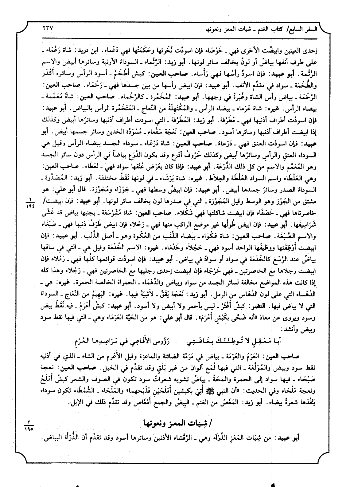 إِحْدَى الْعَينَيْنِ وابيضَّت الْأُخْرَى فَهِيَ خَوْصَاء فَإِن اسودَّت نُخَرتها وحَكَمَتُها فَهِيَ دَغْماء ابْن دُرَيْد شَاة رَغْمَاء على طرف أنفها بياضٌ أولونٌ يُخَالف سَائِر لَوْنهَا. أَبُو زيد: الرثْماء السوداءُ الأرنبة وسائرها أَبيض وَالِاسْم الرُّثْمة أَبُو عبيد فَإِن اسودَّ رأسُها فَهِيَ رَأْساء صَاحب الْعين كَبْش أَطْخَمُ أسود الرَّأْس وسائره أَكْدَر والطُّخْمَة سَواد فِي مقدمَّ الْأنف أَبُو عبيد فَإِن ابيض رَأسهَا من بَين جَسدهَا فَهِيَ رَخْمَاء صَاحب الْعين الرُّخَمَة بَيَاض رَأس الشَّاة وغُبْرةٌ فِي وَجههَا أَبُو عبيد المُخَمَّرة كالرَّخْماء صَاحب الْعين شاةٌ مُعَمَّمة بَيْضَاء الرَّأْس غَيره شَاة عُرْماء بَيْضَاء الرَّأْس والمُكْتَهِلَةُ من النْعاج المُتَخَمُرة الرَّأْس بالبياض أَبُو عبيد فَأن اسودَّت أَطْرَاف أذنيها فَهِيَ مُطَرَّفة أَبُو زيد المُطَرَّفة الَّتِي اسودت أَطْرَاف أذنيها وسائرُها أَبيض وَكَذَلِكَ إِذا ابْيَضَّتْ أَطْرَاف أذنيها وسائها أسود صَاحب الْعين نَعْجَة سَفْعاء مُسْوَدَّة الْخَدين وَسَائِر جسمها أَبيض أَبُو عبيد فَإِن اسودَّت الْعُنُق فَهِيَ دَرْعاءُ صَاحب الْعين شَاة دَرْعَاء سَوْدَاء الْجَسَد بَيْضَاء الرَّأْس وَقيل هِيَ السَّوْدَاء العنقِ وَالرَّأْس وسائرُها أَبيض وَكَذَلِكَ خَرُوفٌ أدْرع وَقد يكون الدَّرَع بَيَاضًا فِي الرَّأْس دون سَائِر الْجَسَد وَهُوَ المُعَمَّم وَالِاسْم من كل ذَلِك الدُّرْعَة أَبُو عبيد فَإِذا كَانَ بعُرْض عُنُقها سَواد فَهِيَ لَغْطَاء صَاحب الْعين وَهِي العَلْطَاء وَاسم السوَاد العُلْطّة والعِلاَط غَيره شَاة بَزشَاء فِي لَوْنهَا نُقَطٌ مُخْتَلفَة أَبُو زيد المُصّدْرة السوداءُ الصَّدْر وسائرُ جَسدهَا أَبيض أَبُو عبيد فَإِن ابيضْ وَسطهَا فَهِيَ جَوْزَاء ومُجَوَّزة قَالَ أَبُو عَليّ هُوَ مُشْتَقّ من الجَوْز وَهُوَ الْوسط وَقيل المُجَوَّزة الَّتِي فِي صدرها لون يُخَالف سَائِر لَوْنهَا أَبُو عبيد فَإِن فَأن ابْيَضَّتْ خاصرتاها فَهِيَ خَصْفَاء فَإِن ابْيَضَّتْ شاكلتها هِيَ شَكْلاء صَاحب الْعين شَاة مُشَرْسَفة يجنبها بَيَاض قد غَشُى شَرَاسِيفَها أَبُو عبيد فَإِن ابيض طولهَا غير مَوضِع الرَّاكِب مِنْهَا فَهِيَ رَحْلاء فَإِن ابيض طََرَفُ ذنبها فَهِيَ صَبْغَاء وَالِاسْم الصُّبْغَة صَاحب الْعين شَاة عَكْوَاء بَيْضَاء الذَّنب من العُكُوة وَهُوَ أصل الذَّنَب أَبُو عبيد فَإِن ابْيَضَّتْ أَوْظِفَتها ووظيفُها الْوَاحِد أسود حَجُلاَء وخَدْماء غَيره الِاسْم الخُدْمَة وَقيل هِيَ الَّتِي فِي سَاقهَا بياضٌ عِنْد الرُّسْغ كالخَدَمَة فِي سَواد أَو سوادٌ فِي بَيَاض أَبُو عبيد فَإِن اسودَّت قَوَائِمهَا كلُّها فَهِيَ رمْلاء فَإِن ابْيَضَّتْ رجلاها مَعَ الخاصرتين فَهِيَ خَرْجَاء فَإِن ابْيَضَّتْ إِحْدَى رِجْلَيْهَا مَعَ الخاصرتين فَهِيَ رَجْلاء وَهَذَا كُله اذا كَانَت هَذِه الْمَوَاضِع مُخَالفَة لسَائِر الْجَسَد من سَواد وَبَيَاض والدَّهْمَاء الحمراءُ الْخَالِصَة الْحمرَة غَيره هِيَ الدَّهْساء الَّتِي على لون الدَّهَاس من الرمل أَبُو زيد نَعْجَة يَقَقٌ لاَ شِيَةَ فِيهَا غَيره البَهِيمُ من النَّعَاج السوداءُ الَّتِي لَا بَيَاض فِيهَا النَّضر كبشٌ أَغْثَرُ لَيْسَ بأحمر وَلَا أَبيض وَلَا أسود أَبُو عبيد كبشٌ أَغرَمُ فِيهِ نُقَطٌ بيض وسود ويروى عَن معَاذ