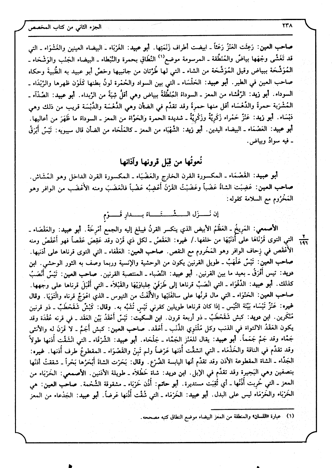 الْأَصْمَعِي المَرِيخُ العَظْمُ الْأَبْيَض الَّذِي ينكسر القرنُ فَيبلغ إِلَيْهِ وَالْجمع أمْرِخَةٌ أَبُو عبيد والعَقْصَاء الَّتِي التوى قَرْنَاهَا على أَذنَيْهَا من خلفهَا غَيره العَقَص لكل ذِي قرْن وَقد عَقِصَ عَقَصاً فَهُوَ أَعْقَصُ وَمِنْه الأَعْقَص فِي زِخاف الوافر وَهُوَ المَخْروم مَعَ النَّقْص صَاحب الْعين العَقْفاء الَّتِي التوى قرناها على أذنيها صَاحب الْعين تَيْسُ عَلْهَبٌ طَوِيل القرنين يكون من الوحشية والإنسية وَرُبمَا وصف بِهِ الثور الوحشي ابْن دُرَيْد تَيْس أَفْرَقُ بعيد مَا بَين القرنين أَبُو عبيد النَّضباء المنتصبة القرنين صَاحب الْعين تَيْسٌ أَنْصَبُ كَذَلِك أَبُو عبيد الدَّفْوَاء الَّتِي انْصَبَّ قرناها إِلَى طَرَفَيْ عِلباوَيْهَا والقَبْلاَء الَّتِي أَقْبَلَ قرناها على وَجههَا صَاحب الْعين الخَنْوَاء الَّتِي مَال قرنُها على سالفَتَيْها والألْفَتُ من التيوس الَّذِي اعْوجَّ قرناه والْتوَيَا وَقَالَ غَيره عَنْزٌ تَيْسَاء بَيَّنَة التَّيْس إِذا كَانَ قرناها طوبلين كقرني تَيْس تُشَبَّه بِهِ وَقَالَ كَبْشٌ شَقَحْطَبٌ ذُو قرنين مُنْكَرين ابْن دُرَيْد كَبْش شَقَحْطَبٌ ذُو أَرْبَعَة قُرُون ابْن السّكيت تَيْسٌ أَعْقَّدُ بيَّن العَقَد فِي قرنه عُقْدَة وَقد يكون العَقَّدُ الالتواءَ فِي الذَّنب وكل مُلْتَوِى الذَّنَب وكل مُلْتَوِي الذَّنَب أعْقَد صَاحب الْعين كَبْش أَجَمُّ لَا قَرْنَ لَهُ وَالْأُنْثَى جَمَّاء وَقد جَمَّ جَمَماًَ أَبُو عبيد يُقَال للعَنْز الجَمَّاء جَلْحَاء أَبُو عبيد الشُرْقَاء الَّتِي انْشَقَّت أُذنها طولا وَقد تقدَّم فِي النَّاقة المخَدْمَاء الَّتِي انشقَّت أُُذنها عَرْضاً وَلم تَبِنْ والقَصْوَاء المقطوعُ طرف أُذّنها غَيره الجَدَّاء الشَّاة المقطوعة الْأذن وَقد تقدَّم أَنَّهَا الْيَابِسَة الضَّرْع وَقَالَ بَحَرْت الشاةَ أَبْحَرُها بَحْراً شققتُ أذنَها بنصفين وَهِي البَحِيرة وَقد تقدمَّ فِي الْإِبِل ابْن دُرَيْد شَاة خَظْلاء طَوِيلَة الْأُذُنَيْنِ الْأَصْمَعِي الخَرْبَاء من الْمعز الَّتِي خُرِبت أُذُنُها أَي ثُقِبَت مستديرة أَبُو حَاتِم أُذُن الخَرْمَاء مشقوقة الشَّحْمة صَاحب الْعين هِيَ الخَزبَاء والخَرْمَاء لَيْسَ على الْبَدَل أَبُو عبيد الُمَاء الَّتِي شُقَّت أُذُنها عَرضاً أَبُو عبيد الجَدْعاء من الْمعز