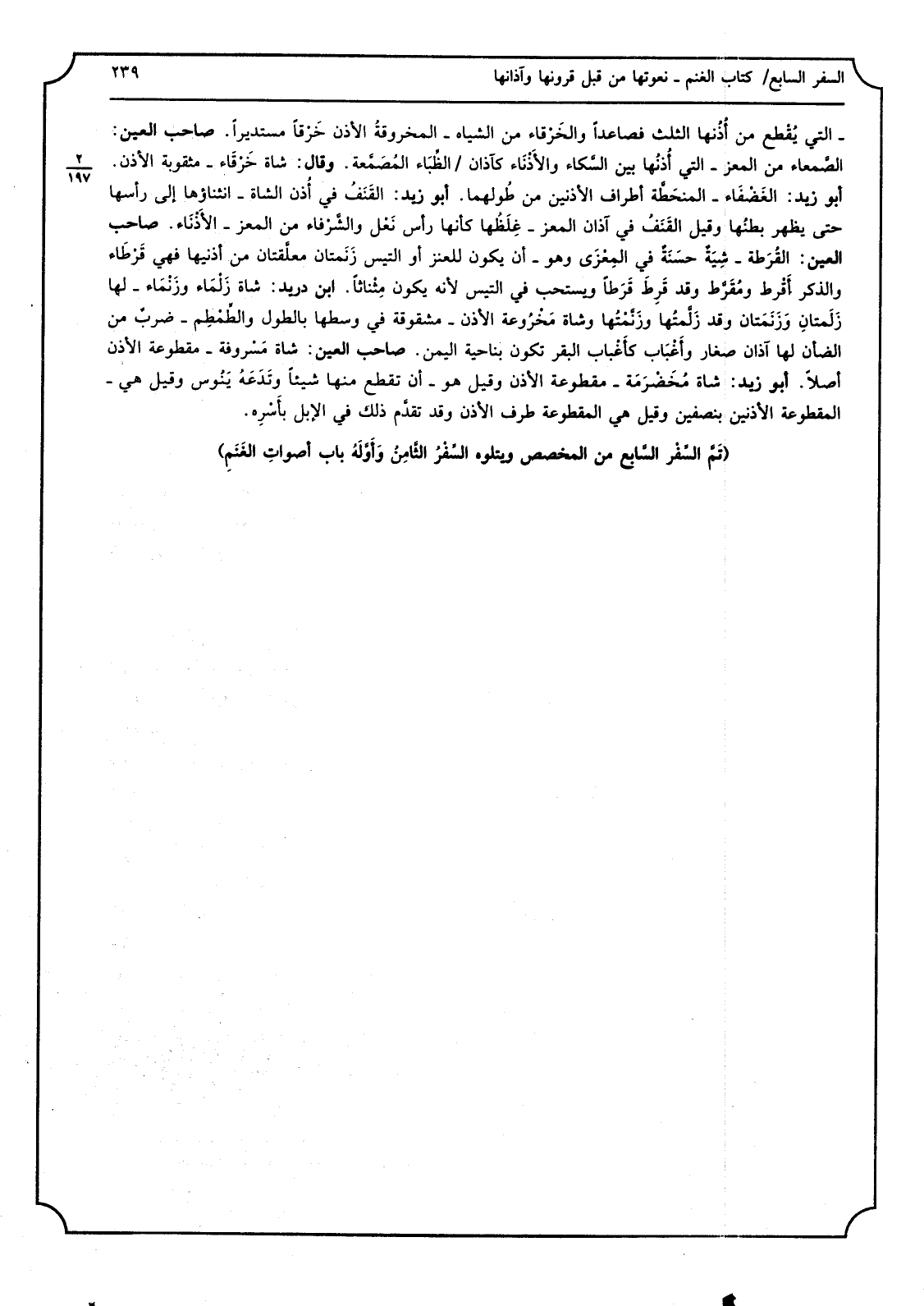 الَّتِي يُقْطع من أُذُنها الثُّلُث فَصَاعِدا والخَرْمَاء من الشياه - المخروقةُ خَرقاً مستديراً صَاحب الْعين الصَّمعاء من الْمعز الَّتِي أُذنُها بَين السَّكاء والأَذناء الظَّبَاء المُصّمَّعة وَقَالَ شَاة خَرْمَاء مثقوبة الْأذن أَبُو زيد الغَضْفَاء المنحَطَّة أَطْرَاف الأذَنين من طُولهما أَبُو زيد القَنَفُ فِي أُذن الشَّاة انثناؤها إِلَى رَأسهَا حَتَّى يظْهر بطنُها وَقيل القَنّفُ فِي آذان الْمعز غلّظُها كَأَنَّهَا رَأس نَعْل والشَّرْفاء من المعزالأّذْنَاء صَاحب الْعين القُرَطة شِيَةٌ حسَنَةٌ فِي المِعْزَى وَهُوَ أَن يكون للعنز أَو التيس زَنَمتان معلْقتان من أذنيها فَهِيَ قَرْطاء وَالذكر أقْرط ومُقَرَّط وَقد قَرِطَ وَيسْتَحب فِي التيس لِأَنَّهُ يكون مِثُناثاً ابْن دُرَيْد شَاة زَلْمَاء وزَنْماء لَهَا زَلَمتانِ وَزَنَمَتان وَقد زلَّمتها وزَنَّمْتُها وشَاة مَخْرُوعة الْأذن مشقوقة فِي وَسطهَا بالطول والطَّمْطِم ضربٌ من الضَّأْن لَهَا آذان صغَار وأغْبَاب كأَغباب الْبَقر تكون بِنَاحِيَة الْيمن صَاحب الْعين شَاة مَسْروقة مَقْطُوعَة الْأذن أصلا أَبُو زيد شَاة مُخَضْرمَة مَقْطُوعَة الْأذن وَقيل هُوَ أَن تقطع مِنْهَا شَيْئا وتَدَعَهُ يَنُوس وَقيل هِيَ المقطوعة الْأُذُنَيْنِ بنصفين وَقيل هِيَ المقطوعة طرف الْأذن وَقد تقدَّم ذَلِك فِي الْإِبِل بأَسْرِه. تَمَّ السَّفر السَّابع من الْمُخَصّص ويتلوه السَّفْرُ الثَّمن وَأَوَّلَهُ بَاب أصواتِ الغَنَمِ)