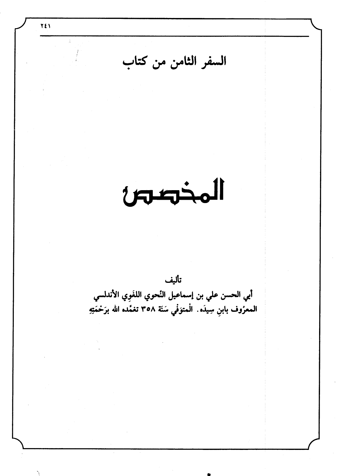 السّفر الثَّامِن من كتاب الْمُخَصّص تأليف أبي الْحسن عَليّ بن إِسْمَاعِيل النَّحوي اللغَوِي الأندلسي المعرُوف بابنِ سِيدَة المْتوَفْي سَنَة 35 تغمَّده الله برَحْمَتِهِ