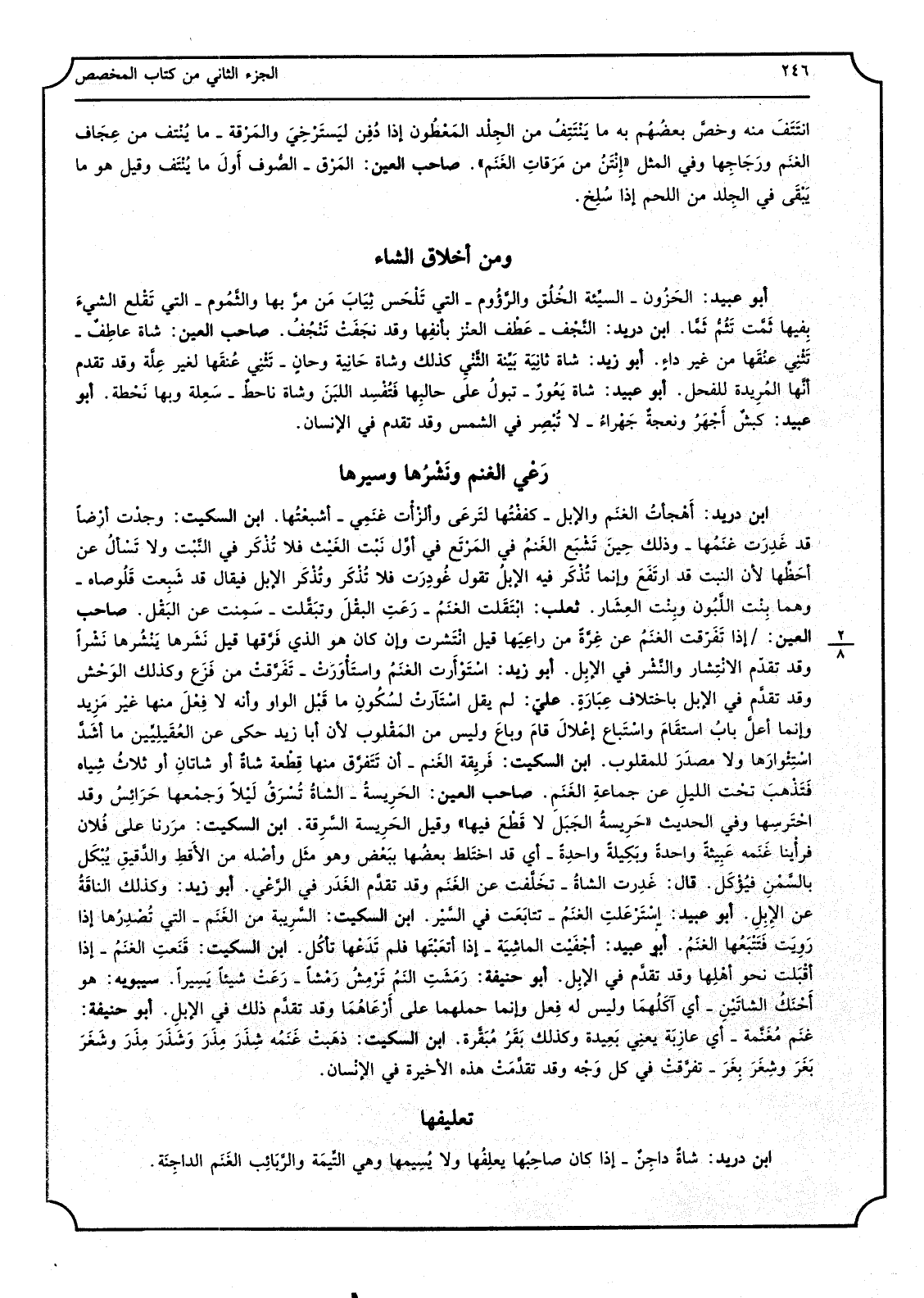 ابْن دُرَيْد أَهُجأتُ الغنَم وَالْإِبِل كففْتُها لتَرعَى وألزْاْت غَنَمِي أشْبعْتُها ابْن السّكيت وجدْت أرْضاً قد غَدِرَت غَنَمُها وَذَلِكَ حِينَ تَشْبَع الغَنمُ فِي المَرْتَع فِي أوَّل نَبْت الغَيْث فَلَا تُذْكَر فِي النَّبْت وَلَا تَسْألُ عَن أحَظَّها لِأَن النبت قد ارتَفَعَ وَإِنَّمَا تُذْكر فِيهِ الأبل تَقول غُودِرَت فَلَا تُذْكَر وتُذْكرَ الْإِبِل فَيُقَال قد شَبِعت قَلوصاه وهما بِنْت اللَّبُون وبِنْت العِشَار ثَعْلَب ابْتَقَلت الغنَمُ رَعَتِ البقْل وتبَقَّلت سَمِنت عَن البَقْل صَاحب الْعين إِذا تَقَرّقت الغنَمُ عَن غِرَّةً من راعِيَها قيل انْتَشرت وَإِن كَانَ هُوَ الَّذِي فَرَّقها قيل نَشَرها يَنْشُرها نَشْراًوقد تقدّم الانْتِشار والنَّشْر فِي الإبِل أَبُو زيد اسْتَوْأَرت الغنَمُ واستأْوَرَتْ تَفَرْقتْ من فَزَع وَكَذَلِكَ الوَحْش وَقد تقدَّم فِي الْإِبِل باخْتلَاف عِبَارةِ عليّ لم يقل اسْتآرتْ لسُكُونِ مَا قَبْل الْوَاو وَأَنه لَا فِعْلَ مِنْهَا غيْر مَزيد وَإِنَّمَا أعلَّ بابُ استقَام واسْتَباع قامَ وباعَ وَلَيْسَ من المَقْلوب لِأَن أَبَا زيد حكى عَن العُقَيلِيِّين مَا أشَدَّ اسْتِئْوارَها وَلَا مصدَرَ للمقلوب ابْن السّكيت فَريقة الغَنم أَن تَتَفرَّق مِنْهَا قِطْعة شاةٌ أَو شاتانِ أَو ثلاثُ شِياه فَتَذْهبَ تحْت الليلِ عَن حماعةِ الغَنَم صَاحب الْعين الحَرِيسةُ الشاةُ تُسْرَقُ لَيْلاً وَجمُعها حَرَائِس وَقد احْتَرسِها وَفِي الحَدِيث حَرِيسةُ الجَبَلَ لَا قَطْعَ فِيهَا وَقيل الحَرِيسة السَّرقة ابْن السّكيت مرَرنا على فُلان فرأْينا غَنَمة عَبِيثةً وَاحِدَة وبَكِيلةً واحدِةً أَي قد اختَلط بَعْضهَا بَبْعض وَهُوَ مثَل وأصْله من الأَقطِ والدَّقيقِ يُبْكَل بالسَّمْن فيُؤْكَل قَالَ غَدِرت الشاةُ تخَلَّفت عَن الغَنَم وَقد تقدَّم الغَدَر فِي الرَّعْي أَبُو زيد وَكَذَلِكَ الناقَةُ عَن الإبِلِ أَبُو عبيد اسْتَرْعَلتِ الغنَمُ تتابَعَت فِي السَّيْر ابْن السّكيت السَّرِيبة من الغَنَم الَّتِي تُصْدِرُها إِذا رَوِيَت فَتَتْبَعُها الغنَمُ أَبُو عبيد أجْفَيْت الماشِيَة إِذا أتعَبْتَها فَلم تَدَعْها تأكُل ابْن السّكيت فَنَعتِ الغنَمُ إِذا أقَبَلت نَحْو أهُلِها وَقد تقدَّم فِي الْإِبِل بو حنيفَة رَمَشَتِ النَمُ تَرْمِشُ رَمْشاً رَعَتْ شَيْئا يَسِيراً سِيبَوَيْهٍ هُوَ أَحْنَكُ الشاتَيْنِ أَي آكَلُهمَا وَلَيْسَ لَهُ فِعل وَإِنَّمَا حملهما على أَرْعَاهُمَا وَقد تقدَّم ذَلِك فِي الْإِبِل أَبُو حنيفَة غنَم مُغَنَّمة أَي عازبَة يعنِي بَعِيدة وَكَذَلِكَ بَقَرُ مُبَقَّرة ابْن السّكيت ذهَبتُ غَنَمُه شِذَرَ مِذَرَ وشَغَرَ بَغَرَ وشِغَرَ بِغَرَ تفرَّقتْ فِي كل وَجْه وَقد تقدَّمَتْ هَذِه الْأَخِيرَة فِي الْإِنْسَان