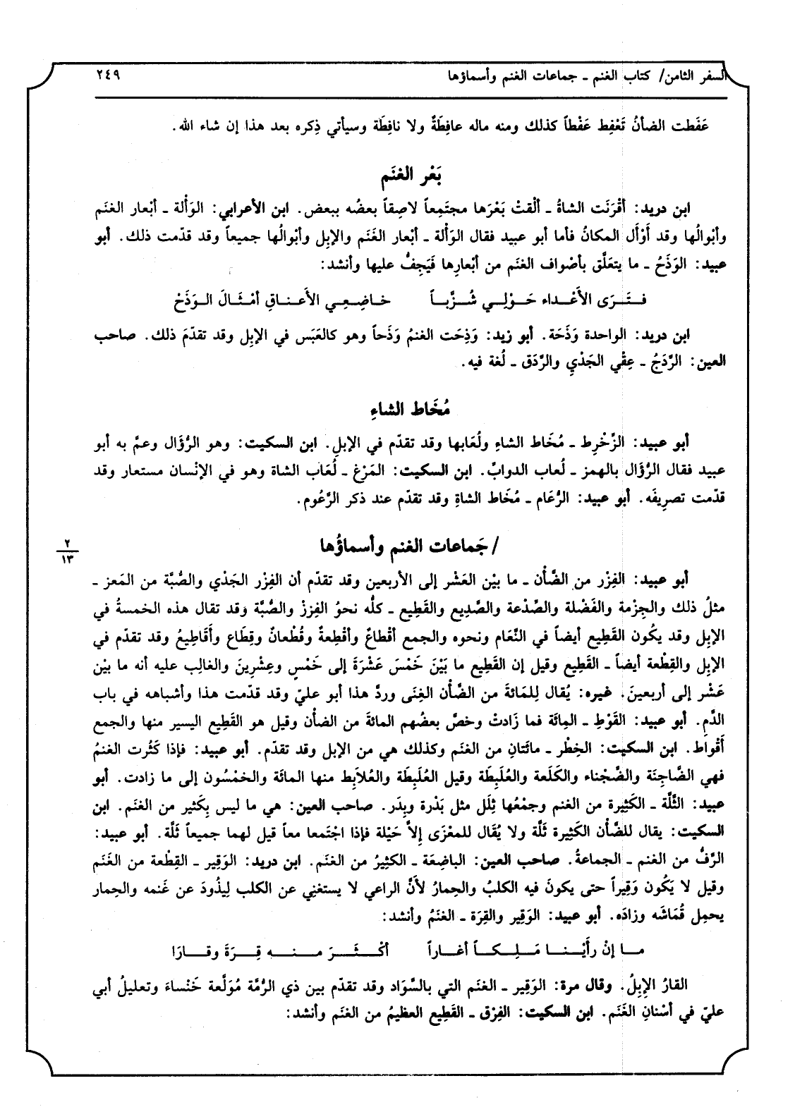 أَبُو عبيد الفِزْر من الضَّأْن مَا بيْن العَشْر إِلَى الْأَرْبَعين وَقد تقدّم أَن الفِزْز الجَدْي والصُّبُّة من المَعز مثلُ ذَلِك والجِزْمة والفَضْلة والصِّدْعة والصِّدِيع والقَطِيع كلُّه نحوُ الفِززْ والصُّبَّة وَقد تقال هَذِه الخمسةُ فِي الْإِبِل وَقد يكُون القَطِيع أَيْضا فِي النَّعَام وَنَحْوه وَالْجمع أقْطاعٌ وأقْطِعةٌ وقُطعانٌ وقِطَاع وأَقَاطِيعُ وَقد تقدّم فِي الْإِبِل والقِطْعة أَيْضا القَطِيع وَقيل أَن القطيع مَا بَيْنَ خَمْسَ عَشرَةَ إِلَى خمْسٍ وعِشْرِينَ والغالِب عَلَيْهِ أَنه مَا بيْن عَشْر إِلَى أربعينَ غَيره يُقال للِمَائةَ من الضَّّأْن الغِنَى وردَّ هَذَا أَبُو عَليّ وَقد قدّمت هَذَا وأشباهه فِي بَاب الدَّم أَبُو عبيد القَوْط المِائَة فَمَا زَادتْ وخصِّ بعضُهم المائةَ مِن الضَّأْن وَقيل هُوَ القَطِيع الْيَسِير مِنْهَا وَالْجمع أقْواط ابْن السّكيت الخِطُر مائَتانِ من الغنَم وَكَذَلِكَ هِيَ من الْإِبِل وَقد تقدّم أَبُو عبيد فَإِذا كَثُرت الْغنم فَهِيَ الضَّاجِنَة والضَّجْناء والكَلَعة والعُلّبِطَة وَقيل العُلَبِطَة والعُلاَبِط مِنْهَا الْمِائَة والخمْسُون إِلَى مَا زَادَت أَبُو عبيد الثَّلَّة الكَثِيرة من الْغنم وجمْعُها ثَلََك مثل بَدْرَة وبِدَر صَاحب الْعين هِيَ مَا لَيْسَ بكَثير من الغَنَم ابْن السّكيت يُقَال للضَّأْن الكَثِيرة ثَلَّة وَلَا يُقَال للمعْزى إِلاَّ حَيْلة فَإِذا اجْتََمعا مَعًا قيل لَهما حميعاً ثَلَّة أَبُو عبيد الرَّفُّ من الْغنم الجماعةُ صَاحب الْعين الباضِعَة الكثِيرُ من الغنَم ابْن دُرَيْد الوَقِير القِطعْة من الغَنَم وَقيل لَا يَكُون وَقِيراً حَتَّى يكونَ فِي هالكلبُ والحِمارُ لأنَّ الرَّاعِي لَا يستغنِي عَن الْكَلْب لِيذُودَ عَن غَنمه والحِمار يحمِل قُمَاشَه وزادَه أَبُو عبيد الوَقِير والقِرَة الغنَمُ وَأنْشد
