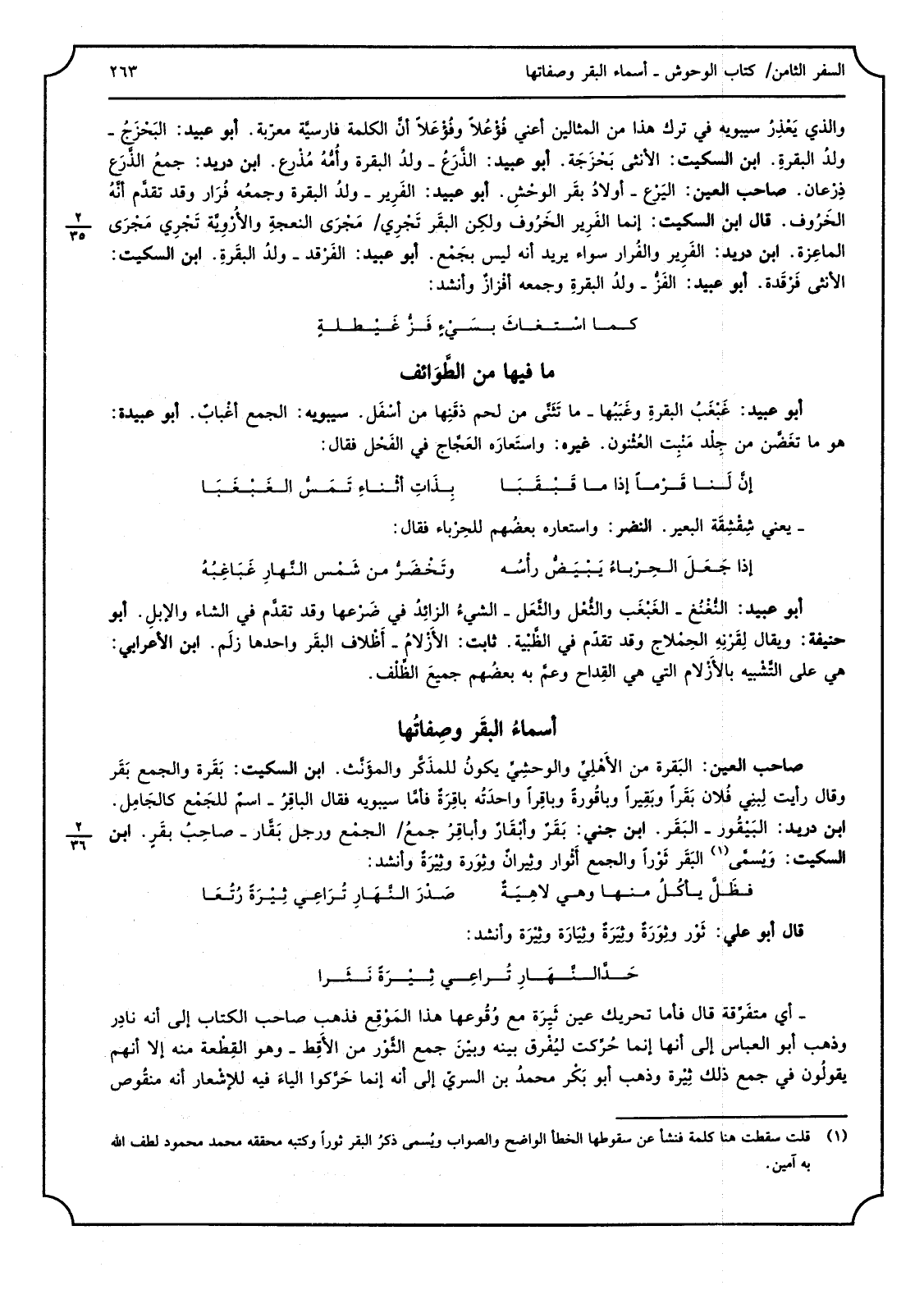 وَالَّذِي يَعْذِرُ سِيبَوَيْهٍ فِي ترك هَذَا من المثالين أَعنِي فُوْعُلاً وفنُؤْعَلاً أنَّ الْكَلِمَة فارسيَّة معرَبة أَبُو عبيد البَحْزَجُ ولدُ الْبَقَرَة ابْن السّكيت الْأُنْثَى بَحْزَجَة أَبُو عبيد الذَّرَعُ ولدُ الْبَقَرَة وأُمُّهُ مُذْرع ابْن دُرَيْد جمعُ الذَّرَع ذِرْعان صَاحب الْعين اليَرْع أولادُ بقَر الوحْشِ أَبُو عبيد الفَرِير ولدُ الْبَقَرَة وجمعُه فُرضار وَقد تقدَّم أنَّهُ الخَرُوف قَالَ ابْن السّكيت إِنَّمَا الفَرِيرالخَرُوف ولكِن البقَر تَجْرِي مَجْرَى النعجةِ والأُرْويَّة تَجْرِي مَجْرَى الماعِزة ابْن دُرَيْد الفَرِير والفُرار سَوَاء يُرِيد أَنه لَيْسَ بجمْع أَبُو عبيد الفَرْقد ولدُ البقَرةِ ابْن السّكيت الْأُنْثَى قَرْقَدة أَبُو عبيد الفَرُّ ولدُ البقرةِ وَجمعه أفْزازُ وَأنْشد