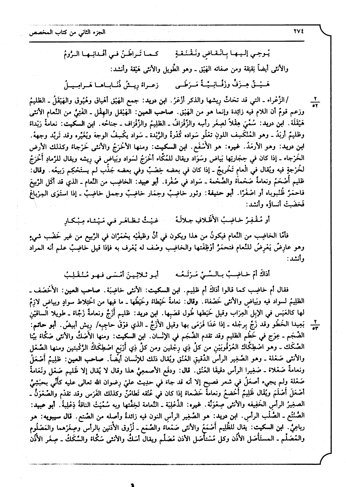 فَقَالَ أم خاضِب كَمَا قَالُوا أذاكَ أم ظلِيم ابْن السّكيت الْأُنْثَى خاضِبَة صَاحب الْعين الأَخْصَف الظليمُ لسواد فِيهِ وبَياض وَالْأُنْثَى خَصْفاءُ وَقَالَ نعامةُ خَيْطاءُ وخَيَطُها مَا فِيهَا من اخْتِلاط سوادٍ وَبَيَاض لازِمُ لَهَا كالعَيَس فِي الإبِل العِرَاب وَقيل خَيَطها طُول قصَبِها ابْن دُرَيْد ظليم أَزَجُّ ونعامةث زَجَّاءُ طَويلا الساقيْنِ بَعِيداً الخَطْو وَقد زَجَّ بِرجْله إِذا عَدَا فَرَمَى بهَا وَقيل الأَزَجُّ الَّذِي فوْقَ حاجِبِه ريش أبيضُ أَبُو حَاتِم الضَّجَم عِوَج فِي خَطْم الظليم وَقد تقدم الضَّجَم فِي الإنْسان ابْن السّكيت وَمِنْهَا الأَصَكُّ وَالْأُنْثَى صَكَّاءُ بيِّنا الصَّكَك وَهُوَ اصْطِكَّاك العُرْقُوبَيْنِ من كلِّ ذِي رِجْلين وَمن كلِّ ذِي أَرْبَعٍ اصْطِكَاكُ الرَّكْبتين وَمِنْهَا لاصَّعْل وَالْأُنْثَى صَعْلة وَهُوَ الصَّغير الرَّأْس الدَّقيق العُنُق ويُقال ذَلِك للإنْسان أَيْضا صَاحب الْعين ظلِيمُ أصْعَلُ ونعامةُ صَعْلاءُ صَغِيرا الرَّأْس دقيقَا العُنُق قَالَ ودفَع الأصمعِيُّ هَذَا وَقَالَ لَا يُقال إِلَّا ظَلِيم صَعْل ونَعَامةُ صَعْلة وَلم يَجِيء أصعَلُ فِي شعر فصيح إِلَّا أَنه قد جاءَ فِي حدِيث عليّ رِضوان الله تَعَالَى عَلَيْهِ كأَنِّي بحبَشِيِّ أصْعَلَ أَصْلَمَ ويُقَال ظَلِيمُ أَخْضعُ ونعامةث خَضْعاءث إِذا كَانَ فِي عُنُقه تَطامُنُ وَكَذَلِكَ الفَرَس وَقد تقدّم والصِّعْوَنُّ الصغِيرُ الرأسِ الخَفِيفة وَالْأُنْثَى صِعْوَنَّة غَيره الذِّعْلِبَة النَّعامة لخِفَّتها وَبِه سُمِّيَتْ الناقةُ ذِعْلِبةُ أَبُو عبيد الصُّنْتُع الصُّلْب الرأسِ ابْن دُرَيْد هُوَ الصَّغِير الرأسِ النُّون فِيهِ زائدةُ وَأَصله من الصَّتع قَالَ سِيبَوَيْهٍ هُوَ رباعِيُّ ابْن السّكيت يُقَال للظَّلِيم أَصْمَعُ وَالْأُنْثَى صَمْعاءُ والصَّمَع لُزُوق الأذُنين بِالرَّأْسِ وصِغَرُهما والمَصْلُوم والمُصَلَّ المستَأْصَل الأُذُن وكل مُسْتأْصَل الْأذن مُصَلَّم وَيُقَال أسَكُّ وَالْأُنْثَى سَكَّاءُ والسَّكَكُ صِغَر الأُذُن