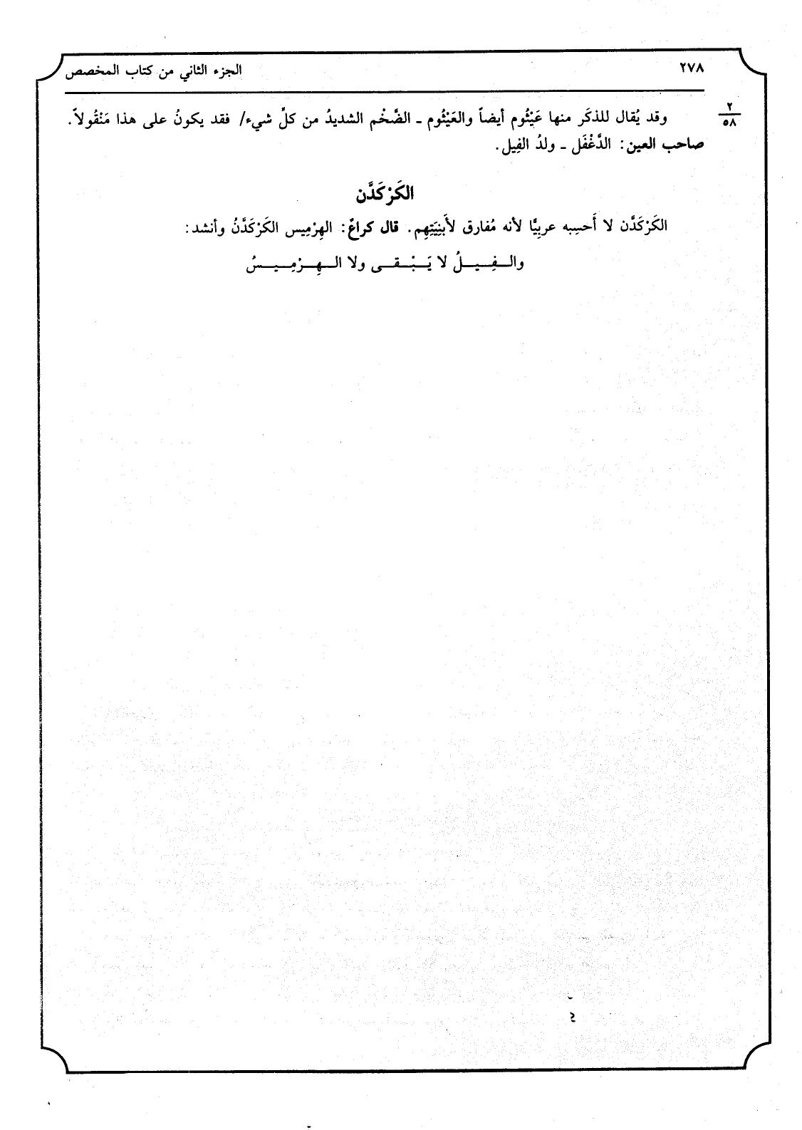 3 - الكَرْكَدَّن لَا أَحسِبه عربِيَّا لِأَنَّهُ مُفارق لأبنِيَتِهِم قَالَ كراعُ الهِرْمِيس الكَرْكَدَّنُ وَأنْشد