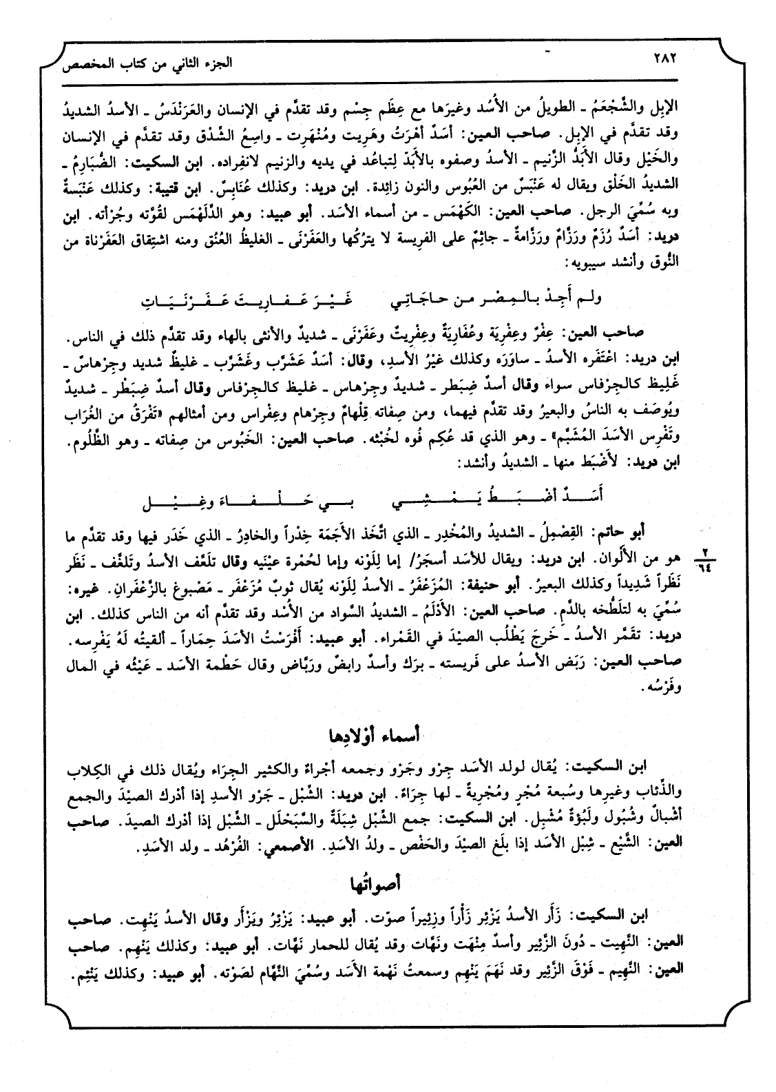 الإبِل والشَّجْعَمُ الطويلُ من الأُسُد وغيرَها مَعَ عِظَم جِسْم وَقد تقدَّم فِي الْإِنْسَان والعَرَنْدَسُ الأسدُ الشديدُ وَقد تقدَّم فِي الإبِل صَاحب الْعين أسَدُ أهْرَتُ وهَرِيت ومُنْهَرِت واسِعُ الشِّدْق وَقد تقدَّم فِي الْإِنْسَان والخَيْل وَقَالَ الأَبَدُّ الزَّنيم الأسدُ وصفوه بالأَبَدّ لِتباعُد فِي يَدَيْهِ والزنيم لانفِراده ابْن السّكيت الضُّبَارِمُ الشديدُ الخَلْق وَيُقَال لَهُ عَنْبَسُ من العُبُوس وَالنُّون زائِدة ابْن دُرَيْد وَكَذَلِكَ عُنَابِسُ ابْن قُتَيْبَة وَكَذَلِكَ عَنْبَسةُ وَبِه سُمِّيَ الرجل صَاحب الْعين الكَهْمَس من أَسمَاء الأسَد أَبُو عبيد وَهُوَ الدَّلَهْمَس لقُوَّته وجُرْأته ابْن دُرَيْد أسَدُ رُزَمُ ورَزَّامُ ورَزَّامةُ جائِمُ على الفرِيسة لَا يترُكُها والعَفَرْنَى الغليظُ العثنُق وَمِنْه اشتِقاق العَفَرْناة من النُّوق وَأنْشد سِيبَوَيْهٍ