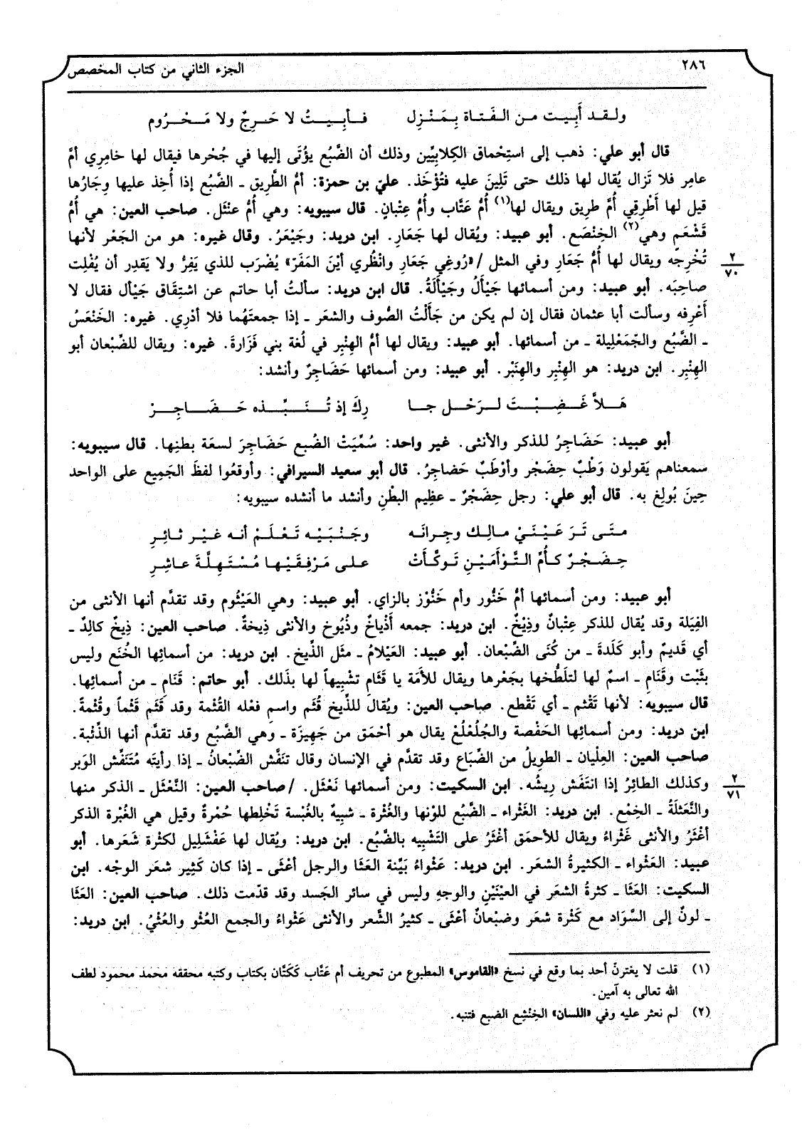 أَبُو عبيد وَمن أسمائها أمُّ خَنُّور وَأم خَنُّوْز بالزاي أَبُو عبيد وَهِي العَيْثُوم وَقد تقدَّم أَنَّهَا النثى من الفِيَلة وَقد يُقال للذّكر عِتْبانُ وذِيخُ ابْن دُرَيْد جمعه أَذْياخُ وذُيُوخ وَالْأُنْثَى ذِيخةُ صَاحب الْعين ذِيخُ كالِدّ أَي قَديمُ وَأَبُو كَلَدةَ من كُنَى الضِّبْعان أَبُو عبيد العَيْلامُ مثَل الذِّيخ ابْن دُرَيْد من أسمائِها الخُنَع وَلَيْسَ بثَبْت وقَنَامِ اسمُ لَهَا لتلَطُّخها بجَعْرها وَيُقَال للأَمَة يَا قَثَام تشْبِيهاً لَهَا بذلك أَبُو حَاتِم قَنَام من أسمائِها قَالَ سِيبَوَيْهٍ لِأَنَّهَا تَقْثم أَي تَقْطع صَاحب الْعين ويُقالَ للذِّيخ قُثَم وَاسم فعْله القُثْمة وَقد قَثَم قَثْماً وقُثْمةً ابْن دُرَيْد وَمن أسمائِها الحَفْصة والجُلُعْلُعْ يُقَال هُوَ أحْمَق من جَهِيزَة وَهِي الضَّبثع وَقد تقدَّم أَنَّهَا الذِّنْبة صَاحب الْعين العِلْيان الطويلُ من الضِّبَاع وَقد تقدَّم فِي الْإِنْسَان وَقَالَ تَنَفَّش الضَّبْعانُ إِذا رأيتَه مُتَنَفِّش الوَبر والنَّعَثلَةُ الجِمْع ابْن دُرَيْد الغَثْراء الضَّبُع للوْنها والغُثْرة شبِيهُ بالغُبْسة تخْلِطها حُمْرةُ وَقيل هِيَ الغُبْرة الذّكر أغْثَرُ وَالْأُنْثَى غَثْراءُ وَيُقَال للأحمَق أغْثَرُ على التَشْبِيه بالضَّبُع ابْن دُرَيْد ويُقال لَهَا عَفْشَلِيل لكثْرة شَعَرها أَبُو عبيد الغَثْواء الكثيرةُ الشعَر ابْن دُرَيْد عَثْواءُ بَيِّنة العَثَا وَالرجل أعْثَى إِذا كَانَ كَثِير شعَر الوجْه ابْن السّكيت العَثَا كثرةُ الشعَر فِي العيْنَيْنِ ولاوجهِ وَلَيْسَ فِي سَائِر الجَسد وَقد قدّمت ذَلِك صَاحب الْعين العَثَا لونُ إِلَى السَّوَاد مَعَ كَثْرة شعَر وضبْعانُ أعْثَى كثيرُ الشَّعر وَالْأُنْثَى عَثْواءُ وَالْجمع العثثْو العُثْيُ ابْن دُرَيْد