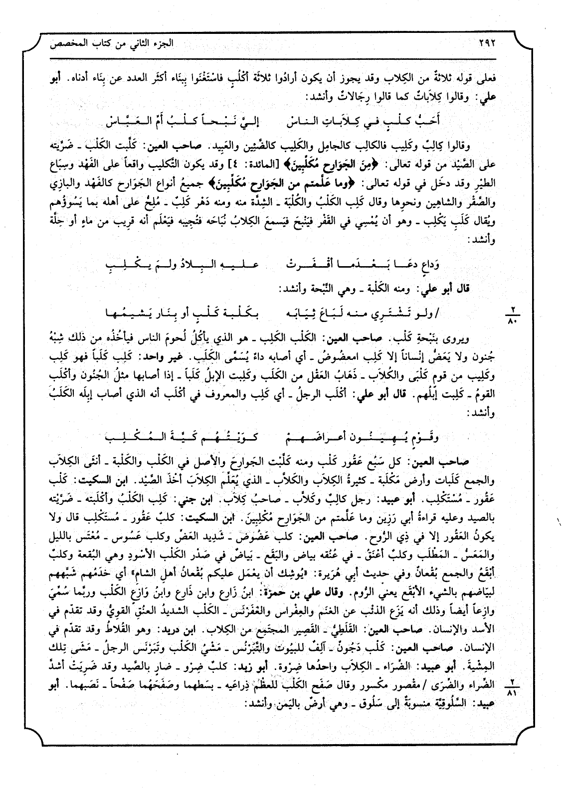 صَاحب الْعين كل سَبُع عَقُور كَلْب وَمِنْه كَلَّبْت الجَوارِحَ وَالْأَصْل فِي الكَلْب والكَلْبة أنثَى الكِلاَب وَالْجمع كَلَبات وَأَرْض مَكْلَبة كثيرةُ الكِلاَب والكَلاَّب الَّذِي يُعَلِّم الكِلاَبَ أخْذَ الصَّيْد ابْن الكسيت كَلْب عَقُور مُسْتَكْلِب أَبُو عبيد ردل كالِبُ وكَلاَّب صاحبُ كِلاَب ابْن جني كَلِب الكَلْبُ وأكْلَبته ضَرَّيْته بالصيد وَعَلِيهِ قراءةُ أبي رَزِين وَمَا عَلَّمتم من الجَوَارِح مُكْلِبِينَ ابْن السّكيت كلبُ عَقُور مُستَكْلِب قَالَ وَلَا يكونُ العَقُور إِلَّا فِي ذِي الرُّوح صَاحب الْعين كلب عَضُوض شَدِيد العَضِّ وكلب عَسُوس مُعْتَس بِاللَّيْلِ والمَعَسُّ المَطْلَب وكلبُ أعْنَقُ فِي عُنُقه بَيَاض والبَعَع بَياضُ فِي صَدْر الكَلْب الأسْودِ وَهِي البُقعة وكلبُ أبْقَعُ وَالْجمع بُقْعانُ وَفِي حَدِيث أبي هُرَيرة يُوشِك أَن يعْمَل عَلَيْكُم بُقْعانُ أهلِ الشَّام أَي خدَمُهم شَبَّههم لبيَاضهم بالشَّيْء الأبْقَع يَعْنِي الرُّوم قَالَ عَليّ بن حَمْزَة ابنُ زَارع وَابْن ذَارع وابنُ وَازَعٍ الكَلْب وربَّما سثمِّيَ وازِعاً أَيْضا وَذَلِكَ أَنه يَزَع الذئْب عَن الغنَم ولاعِفْراس والعَفَرْنَس الكَلْب الشديدُ العنُق القويُّ وَقد تقدّم فِي لأسد وَالْإِنْسَان صَاحب الْعين القَلَظِيًّ القَصِير المجتَمِع من الكِلاب ابْن دُرَيْد وَهُوَ القُلاطُ وَقد تقدّم فِي الْإِنْسَان صَاحب الْعين كَلْب دَجُونُ آلِفُ للبيُوت والتَّبَرْنُس مَشْيُ الكَلْب وتَبَرْنَس الرجلُ مَشَى تِلك المِشْيةَ أَبُو عبيد الضِّرَاء الكِلاَب واحدُها ضِرْوة أَبُو زيد كلبُ ضِرْو ضارٍ بالصَّيد وَقد ضَرِيَتْ أشدَّ الضَّراء والضِّرَى مقْصور مكْسور وَقَالَ صَفَح الكَلْب للعظْم ذِراعَيه بسَطهما وصَفَحَهُما صَفْحاً نَصَبهما أَبُو عبيد السَّلُوقِيَّة منسوبَةُ إِلَى سَلُوق وَهِي أرضُ باليَمن وَأنْشد