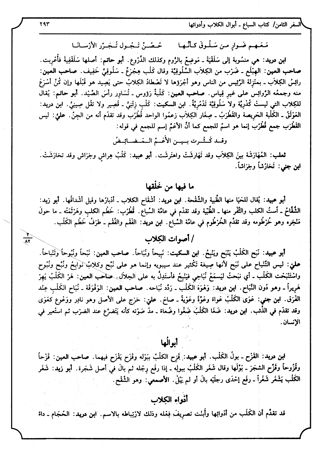 ابْن دُرَيْد هِيَ منسُوبة إِلَى سَلَقْيَةَ مَوضِعُ بالرُّوم وَكَذَلِكَ الدُّرُوع أَبُو حَاتِم أَصْلهَا سَلَقْفِيةَ فأُعْرِبت صَاحب الْعين الهِبْلَع ضَرْب من الكِلاَب السَّلُوقِيَّة وَقَالَ كَلْب هِجْرَعُ سَلُوقِيُّ خَفِيف صَاحب الْعين رائِسُ الكِلاَب بمنْزلة الرَّئِيس من النَّاس وَهُوَ أجْرَؤها لَا تَصْطادُ الكِلابُ حَتَّى يَصِيد هُوَ قَبْلَها وَإِن كُنَّ أسْرَعَ مِنْهُ وجمعُه الرَّوائِس على غير قِياس صَاحب الْعين كَلْبةُ رَؤوس تُسَاوِر رأسَ الصَّيْد أَبُو حَاتِم يُقال للكلاب الَّتِي ليستْ كُدْرِيَّة وَلَا سَلُوقِيَّة تَدْمُرِيَّةُ ابْن السّكيت كَلْبِ زِئْنِيُّ قصِير وَلَا تقُل صِينِيُّ ابْن دُرَيْد العَوْلَقُ الكَلْبة الحَرِيصة والقَطْرَبُ صِغَار الكِلاَب زعمُوا الْوَاحِد قُطْرُب وَقد تقدّم أَنه من الجِنِّ عَليّ لَيْسَ القَطْرَب جمع قُطْرُب إِنَّمَا هُوَ اسمُ للْجمع كَمَا أنَّ الأعَمَّ إسم للْجمع فِي قَوْله