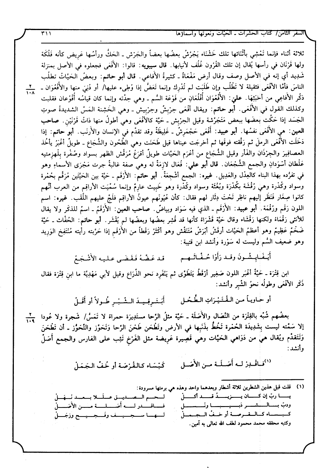 ثَلَاثَة أثْنَاء فَإِنَّمَا تَمْشِي بأثْنَائها تِلْكَ خَشْنَاء يَجْرُشُ بعضُها بَعْضًا والجَرْش الحَكُّ ورأسُها عَرِيض كَأَنَّهُ فَلْكَة وَلها قَرْنَان فِي رَأسهَا يُقال إِن تِلْكَ القُرُون غُلُف لأنيابها قَالَ سِيبَوَيْهٍ قَالُوا فجعلوه فِي الأَصْل بِمَنْزِلَة شَدِيد أَي إِنَّه فِي الأَصْل وصف وَقَالَ أَرض مَفْعَاةٌ كَثِيرَة الأفاعي أَبُو حَاتِم وبعضُ الحَيَّاتُ تطلبُ الناسَ فأمَّا الأفْعَى فثقيلة لَا تَطْلُب وَإِن طَلَبَت لم تُدْرِك وَإِنَّمَا تَعَضُّ إِذا وُطِىء عَلَيْهَا أَو دُنِيَ مِنْهَا والأُفْعُوَان ذكُر الأَفاعِي من أخْبَثِهَا عليّ الأُفْعُوَان أُفْلُعَانِمن فَوْعَة السُّم وَهِي حِدَّته وَإِنَّمَا كَانَ قياسُه أُفْوُعان فقلبت وَكَذَلِكَ القَوْل فِي الأَفْعَى أَبُو حَاتِم وَيُقَال أفْعَى حِرْبِشٌ وحِرْبِيشٌ وَهِي الخَشِنة المَسِّ الشديدةُ صوتِ الجَسَد إِذا حَكَّت بعضَها بِبَعْض مَتَجَرِّشة وَقيل الحِرْبِش حَيَّة كالأفْعَى وَهِي أطولُ مِنْهَا ذاتُ قَرْنَيْنِ صَاحب الْعين هِيَ الأَفْعَى نفسُها أَبُو عبيد أَفْعَى حَجْمَرِشٌ غَلِيظَةٌ وَقد تقدَّم فِي الْإِنْسَان والأَرنَب أَبُو حَاتِم إِذا دَخَلَت الأَفْعَى الرملَ ثمَّ رَقَّقته فوقَها ثمَّ أخرجَت عَيناهَا قيل طَحَنَت وَهِي الطَّحُون والشُّجَاع طويلٌ أغْبَرُ يأخُذ العصافِيرَ والجِرْذَان والفَأر وَقيل الشُّجَاع من أعْرَم الحَيَّات طويلٌ أقرَعُ مُرَقَّش الظّهْر بسواد وصُفْرة بِلْهزِمتيه عَلْطان أسْوَدانِ وَالْجمع الشُّجْعَان أَبُو عَليّ فُعَال لازِمَةٌ لَهُ وَهِي صفة غالبةٌ جرت مَجْرَى الأسماءِ وَهُوَ فِي تفرُّده بِهَذَا الْبناء كالعِدْل والعَدِيل غَيره الْجمع أشْجِعَةٌ أَبُو حَاتِم الأَرْقَم حَيَّة بَين الحَيَّتَيْن مُرَقَّم بحُمْرة وَسَوَاد وكُدْرة وَهِي رُف \ قْشَة بكُدْرَة وبُغْثَة وَسَوَاد وكُدْرَة وَهُوَ خَبِيث عارِمٌ وَإِنَّمَا سُمِّيَت الأراقِم من الْعَرَب أنَّهم كَانُوا صِغَار فَنَظَر إِلَيْهِم ناظِر تَحْتَ دِثَار لَهُم فَقَالَ كَأَن عُيُونَهم عيونُ الأراقمِ فلَجَّ عَلَيْهِم اللَّقَب غَيره اسْم اللَّوْن رَقَم ورُقْمَة أَبُو عبيد الأَرْقَم الَّذِي فِيهِ سَوَاد وبياضٌ صَاحب الْعين الأَرْقَمُ اسمٌ للذكَرِ وَلَا يُقَال للْأُنْثَى رَقْمَاءُ وَلكنهَا رَقْشَاء وَقَالَ حَيَّة قَشْرَاءُ كَأَنَّهَا قد قُشِر بعضُها وبعضُها لم يُقْشَر أَبُو حَاتِم الحُفَّاث حَيَّة ضَخْمٌ عَظِيمٌ وَهُوَ أعظمُ الحَيَّات أرقَشُ أبْرَشُ مُتَنَقِّش وَهُوَ أكْثَرُ رَقَطاً من الأَرْقَم إِذا حَرَّبته رَأَيْته مُنْتَفِخ الوَرِيد وَهُوَ ضَعِيف السُّم وَلَيْسَت لَهُ سَوْرة وَأنْشد ابْن قُتَيْبَة