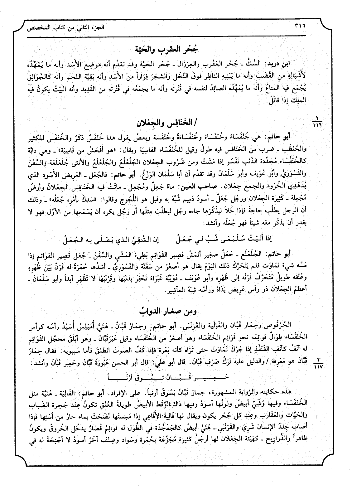 هَذِه حكايته والرّواية الْمَشْهُورَة حِمارَ قَبَّانَ يَسُوقُ أرنباً على الْإِفْرَاد أَبُو حَاتِم الفَالِيَة هُنَيِّة مثل الخُنْفَسَاء وفيهَا وَشْيٌ أبيضُ ولونُها أسودُ وفيهَا ذَاك الرَّقَط الْأَبْيَض طويلةُ العُنُق تكونُ عِنْد جَحِرة الضِّباب والحَيَّات والعَقَارب وعِند كل جُحْر يكون وَيُقَال لَهَا فَالِية الأَفَاعِي إِذا مَسِستَها نَضَحَتْ بِمَاء حارٍّ من أسْتِها فَإِذا أصَاب جِلدَ الْإِنْسَان شَرِيَ والقَرَنْبَي هُنَيُّ أبيضُ كالجْدْجُدَة فِي الطُّول لَهُ قوائِمُ قُصَارٌ يدخُل الخُروقَ ويكونُ ظَاهرا والذَّرارِيح كهَيْئة الجِعْلان لَهَا أرجُلُ كَثِيرَة مُجَزَّعَة بحُمْرة وسَواد وصِنْف آخَرُ أسودُ لَا أجْنِحَةَ لَهُ فِي