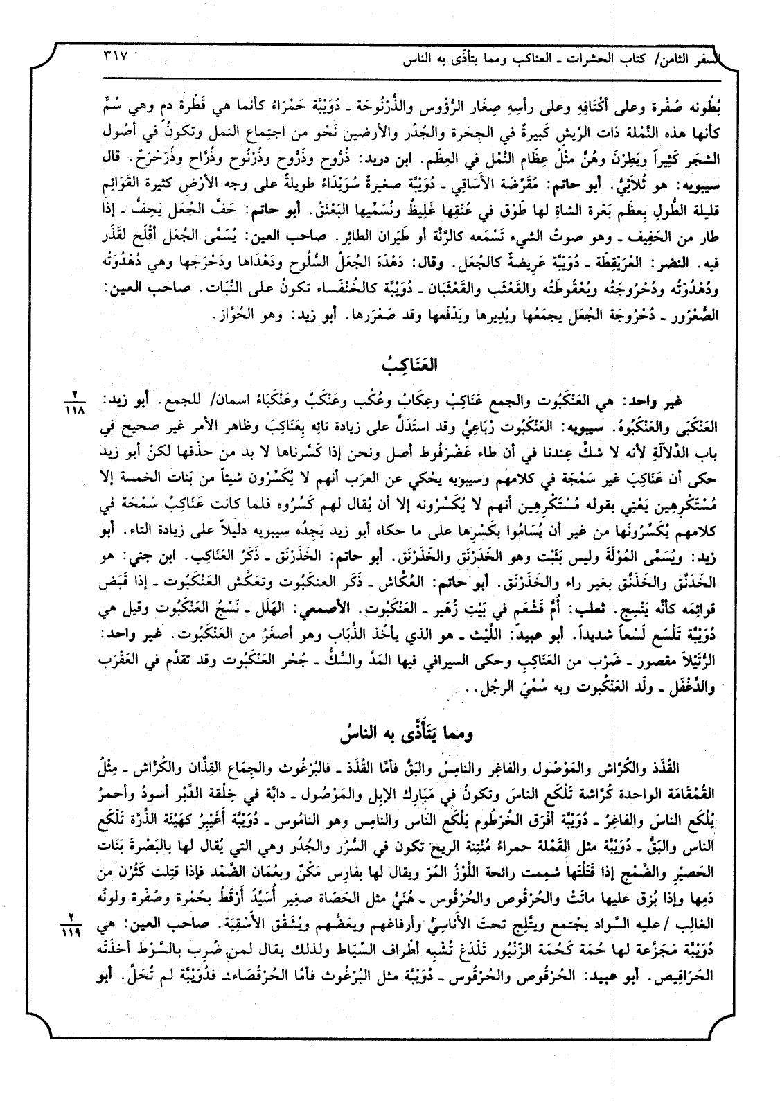 القُذَذ والكُرَّاش والمَوْصُول والفاغِر والنامِسُ والبَقُّ فأمَّا القُذَذ فالبُرْغُوث والجِمَاع القِذَّان والكُرَّاش مِثْلُ القُمْقَامَة الْوَاحِدَة كُرَّاشة تَلْكَع الناسَ وتكونُ فِي مَبَارِك الإبِل والمَوْصُول دابَّة فِي خَلْقه الدَّبْر أسودُ وأحمرُ يُلْكَع الناسَ والفاغِرُ دُوَيْبَّة مثل القَمْلة حمراءُ مُنْتِنة الرّيح تكون فِي السُّرُر والجُدُر وَهِي الَّتِي يُقال لَهَا بالبَصْرةَ بَنَات الحَصيْرِ والضَّمْج إِذا قَتَلْهَا شمِمت رَائِحَة اللَّوْزُ المُرّ وَيُقَال لَهَا بفارِس مَكْنٌ وبعُمَان الضَّمد فَإِذا قتِلت كَثُرْن من دَمِها وَإِذا بُزق عَلَيْهَا مَاتَتْ والحُرْقُوص والحُرْقُوس هُنَيُّ مثل الحَصَاة صغِير أُسَيِّدُ أَرْقَطُ بحُمْرة وصُفْرة ولونُه الغالِب عَلَيْهِ السَّواد يجْتمع ويتَّلِج تحتَ الأَناسِيُّ وأرفاغهم ويعَضُّهم ويُشَقَّق الأَسْقِيَة صَاحب الْعين هِيَ دُوَيْبَّة مَجَزَّعة لَهَا حُمَة كَحُمَة الزّنْبُور تَلْدَغ تُشْبِه أطْاف السِّيَاط ولذل يُقَال لمن ضُرِب بالسَّوْط أخذَتْه الحَرَاقِيص أَبُو عبيد الحُرْقُوص والحُرْقُوس دُوَيْبَّة مثل البُرْغُوث فأمَّا الحُرْقُصَاء فدُوَيْبَّة لم تُحَلَّ أَبُو