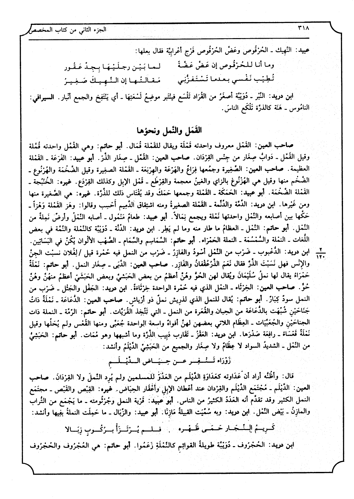 صَاحب الْعين القَمْل مَعْرُوف واحدته قَمْلَة وَيُقَال للقَمْلة قُمَال أَبُو حَاتِم وَهِي القُمَّل واحدته قُمَّلة وَقيل القُمَّل دَوابُّ صِغَرا من جِنْس القِرْدَان صَاحب الْعين القُمَّل صِغَار الذَّرّ أَبُو عبد الفَرَعَة القَمْلة الْعَظِيمَة صَاحب الْعين الصَّغِيرة وجمُعها فِرَاعٌ والهَرْعَة والهِرْيْعَة القَمْلة الصغِيرة وَقيل الضَّخْمَة والهُرْنُوع الضَّخْم مِنْهَا وَقيل هِيَ الهُزْنُوغ بالزاي والغينُ مُعْجمَة والقِرْطَع قَمْل الإبِل وَكَذَلِكَ القِرْدَع غَيره الخُنْبُجَة القَمْلة الضَّخْمَة أَبُو عبيد الحَمَكَة القَملة وَجَمعهَا حَمَك وَقد يُقْتَاس ذَلِك للذَّرَّة غَيره هِيَ الصَّغيرة مِنْهَا وَمن غَيْرها ابْن دُرَيْد الدِّمَّة والدِّنَّمة القَمْلة الصغيرةُ وَمِنْه اشتِقاق الدَّمِيم اَحْسِب وَقَالُوا وهَز القَمْلة وَهْزاً حَكَّها بَين أَصَابِعه والنَّمْل واحدتها نَمْلة وَيجمع نِمَالاً أَبُو عبيد طعامٌ مَنْمُول أَصَابَهُ النَّمْلُ وأرضٌ نَمِلةٌ من النَّمْل أَبُو حَاتِم النَّمْل العظامُ مَا طَار مِنْهُ وَمَا لم يَطِر ابْن دُرَيْد الدِّنَّة دُوَيْبَّة كالنَّمْلة والنِّمَّة فِي بعض اللُّغات النمْلة والسُّمْسُمَة النملة الحَمْرَاء أَبُو حَاتِم السَّمَاسِم والسَّمَام الصُّهْب الألْوان يُكُنَّ فِي البَسَاتِين ابْن دُرَيْد الدُّعْبوب ضَرْب من النَّمْل أسْودُ والفازِرُ ضَرْب من النَّمْل فِيهِ حُمْرة قيل لِفُلان نسبْت الجَنَّ والإنْس فَهَل نَسَبْتَ الدَّرَّ فَقَالَ نَعَمَ الذَّرُعُقْفانُ والفَازِر صَاحب الْعين الدَّبَى صِغَار النَّمْل أَبُو حَاتِم نَمْلَةٌ حَمْرَاءُ يُقَال لَهَا نملُ سُلَيْمَانَ ويُقال لَهُنَّ الحُوُّ وهُنَّ أعظمُ من بعض الحَبَشيَّ وَبَعض الحَبَشَيّ أعظمُ من بعض الحَبَشيَّ وَبَعض الحَبَشَيّ أعظمُ منهُنَّ وهُنَّ حُوٌّ صَاحب الْعين الخِرْثَاء النمْل الَّذِي فِيهِ حُمْرة الْوَاحِدَة خِرْثَاءَةٌ ابْن دُرَيْد الجَفْل والجَثْل ضَرْب من النَّمْل سودٌ كِبَارٌ أَبُو حَاتِم يُقال للنمل الَّذِي لذرِيش نملٌ ذُو أرْياشٍ صَاحب الْعين الدُّعَاعَة نَمْلَةٌ ذاتُ جَنَاحَيْنِ شُبِّهَت بالدُّعَاعَة من الحِبان والقُعَرة من النَّمْل الَّتِي تَتَّخِذ القُرَيَّات أَبُو حَاتِم الرِّمَّة النملة ذَات الجناحَيْنِ والجُعَيَّبَات العِظَام اللَّاتِي بَعضهنَّ لهنَّ أفواهٌ وَاسِعَة الْوَاحِدَة جُعَبَّى وَمِنْهَا القُعْس وَلم يُحَلِّها وَقيل نَمْلَةٌ قَعْسَاءُ رافِعَة صَدْرَها ابْن دُرَيْد العَقْزُ تَقَارب دَبِيب الذَرَّة وَمَا أشبههَا وَهُوَ مُمَات أَبُو حَاتِم الحَبَشِيُّ من النَّمْل الشديدُ السوَاد لَا عِظَامٌ وَلَا صِغَار والجميع من الحَبَشِيِّ الدَّيْلَمُ وَأنْشد