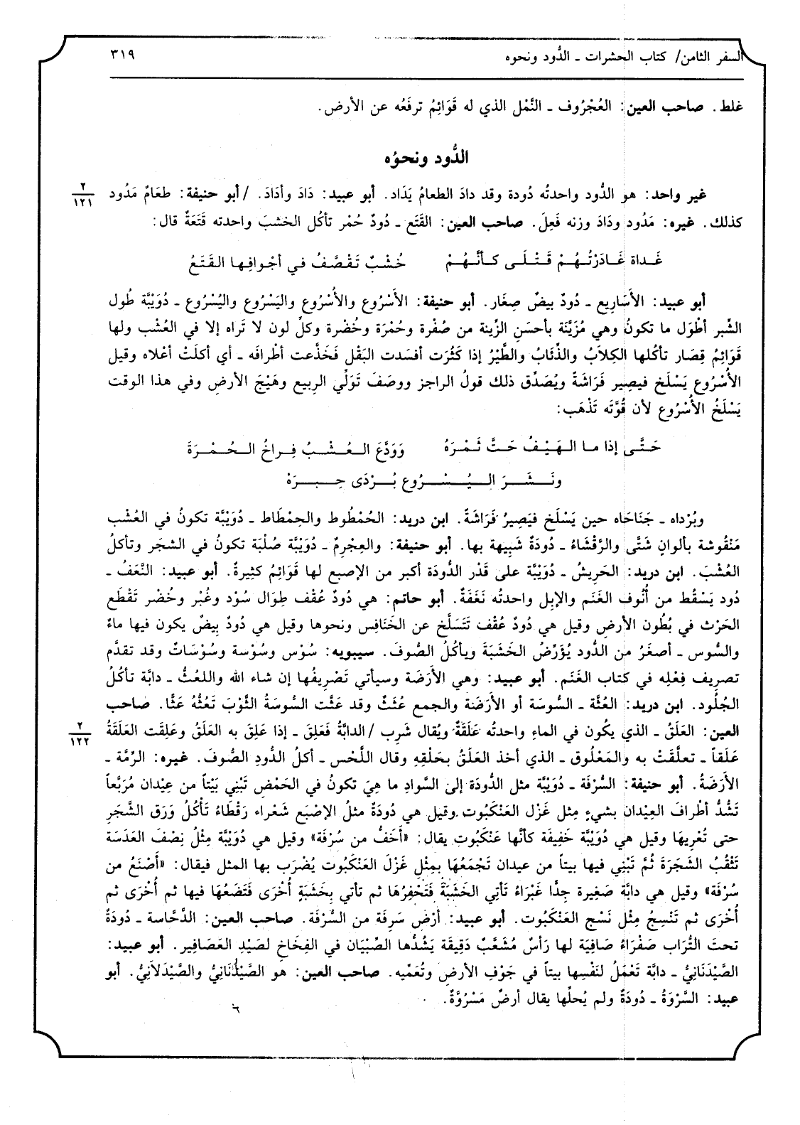 وبُرْداه جَنَاحَاه حِين يَسْلَخ فيَصِيرُ فَرَاشَةً ابْن دُرَيْد الحُمْطُوط والحِمْطَاط دُوَيْبَّة تكونُ فِي العُشْب مَنْقُوشة بألوانٍ شَتَّى والرَّقْشَاءُ دُودَةٌ شَبِية بهَا أَبُو حنيفَة والعِجْرِمٌ دُوَيْبَّة صُلْبَة تكونُ فِي الشجَر وتأكلُ العُشْبَ ابْن دُرَيْد الحَرِيشُ دُوَيْبَّة على قَدْر الدُّودَة أكبر من الإصبع لَهَا قَوَائِمُ كثيرةٌ أَبُو عبيد النَّعَفُ دُود يَسْقُط من أُنُوف الغَنَم والإبِل واحدتُه نَغَفَةٌ أَبُو حَاتِم هِيَ دُودٌ عُقْف طِوَال سُوْد وغُبْر وخُضْر تَقْطَع الحَرْث فِي بُطُون الأرضِ وَقيل هِيَ دُودٌ عُقْف تَتَسَلَّخ عَن الخَنَافِس وَنَحْوهَا وَقيل هِيَ دُودٌ بِيضٌ يكون فِيهَا ماءٌ والسُّوس أصغَرُ من الدُّود يُؤَرِّضُ الخَشَبَةَ ويأكُلُ الصُّوفَ سِيبَوَيْهٍ سُوْس وسُوْسة وسُوْسَاتٌ وَقد تقدَّم تصرِيف فِعْلِه فِي كتاب الغَنَم أَبُو عبيد وَهِي الأَرَضَة وَسَيَأْتِي تَصْرِيفُها إِن شَاءَ الله واللعُثُّ دابَّة تاكُلُ الجُلُود ابْن دُرَيْد العُثَّة السُّوسَة أَو الأَرَضَة وَالْجمع عُثَثٌ وَقد عَثَّت السُّوسَةُ الثَّوْبُ تَعُثُّهُ عَثّاً صَاحب الْعين العَلَقُ الَّذِي يكُون فِي الماءِ واحدتُه عَلَقَةٌ ويُقال شَرِب الدابَّةُ فَعَلِقَ إِذا عَلِقَ بِهِ العَلَقُ وعَلِقَت العَلَقَةُ عَلَقاً تعلَّقَتْ بِهِ والمَعْلُوق الَّذِي أَخذ العَلَقُ بحَلْقِهِ وَقَالَ اللَّحْس أكلُ الدُّودِ الصُّوفَ غَيره الرِّمَّة الأَرَضَةُ أَبُو حنيفَة السُّرْفَة دُوَيْبَّة مثل الدُّودَة إِلَى السَّوادِ مَا هِيَ تكونُ فِي الحَمْضِ تَبْنِي بَيْتاً من عِيْدان مُرَبَّعاً تَشُّدُّ أطْرافَ العِيْدان بشيءٍ مِثل غَزْل العَنْكَبُوت وَقيل هِيَ دُودَةٌ مثلُ الإصْبَع شَعْراس رَقْطَاءُ تَأْكُلُ وَرَق الشَّجَرِ حَتَّى تعْرِيهَا وَقيل هِيَ دُوَيْبَّة خَفِيفَة كأنَّها عَنْكَبُوت يُقَال أَخَفُّ من سُرْفَة وَقيل هِيَ دُوَيْبَّة مِثْلُ نِصْفَ العَدَسَة تَثْقُبُ الشَجَرَةَ ثُمَّ تَبْنِي فِيهَا بَيْتا من عيدَان تَجْمَعُهَا بمِثْلِ غَزْلَ العَنْكَبُوت يُضْرَب بهَا الْمثل فَيُقَال أَصْنَعُ من سُرْفَة وَقيل هِيَ دابَّة صَغِيرة جِداًّ غَبْرَاءُ تَأتِي الخَشَبَةَ فَتَحْفِرُها ثمَّ تاتي بِخَشَبَةٍ أُخْرَى فَتَضَعُها فِيهَا أخْرَى ثمَّ أخُرَى ثمَّ تَنْسِجُ مِثْل نَسْج العَنْكَبُوت أَبُو عبيد أرْض سَرِفَة من السُّرْفَة صَاحب الْعين الدَّحَّاسة دُودَةٌ تحتَ التُّرَاب صَفْرَاءُ صَافِيَة لَهَا رَأسٌ مُشَعَّبٌ دَقِيقَة يَشُدُّها الصِّبْيان فِي الفِخَاح لصَيْد العَصَافِير أَبُو عبيد الصَّيْدَنَانِيُّ دابَّة تَعْمَلُ لنَفْسِها بَيْتا فِي جَوْفِ الأرضِ وتُعَمِّيه صَاحب الْعين هُوَ الصَّيْدَنَانِيُّ والصَّيْدَلاَنِيُّ أَبُو عبيد السَّرْوَةُ دُودَةٌ وَلم يُحلِّها يُقَال أرضٌ مَسْرُوَّةٌ