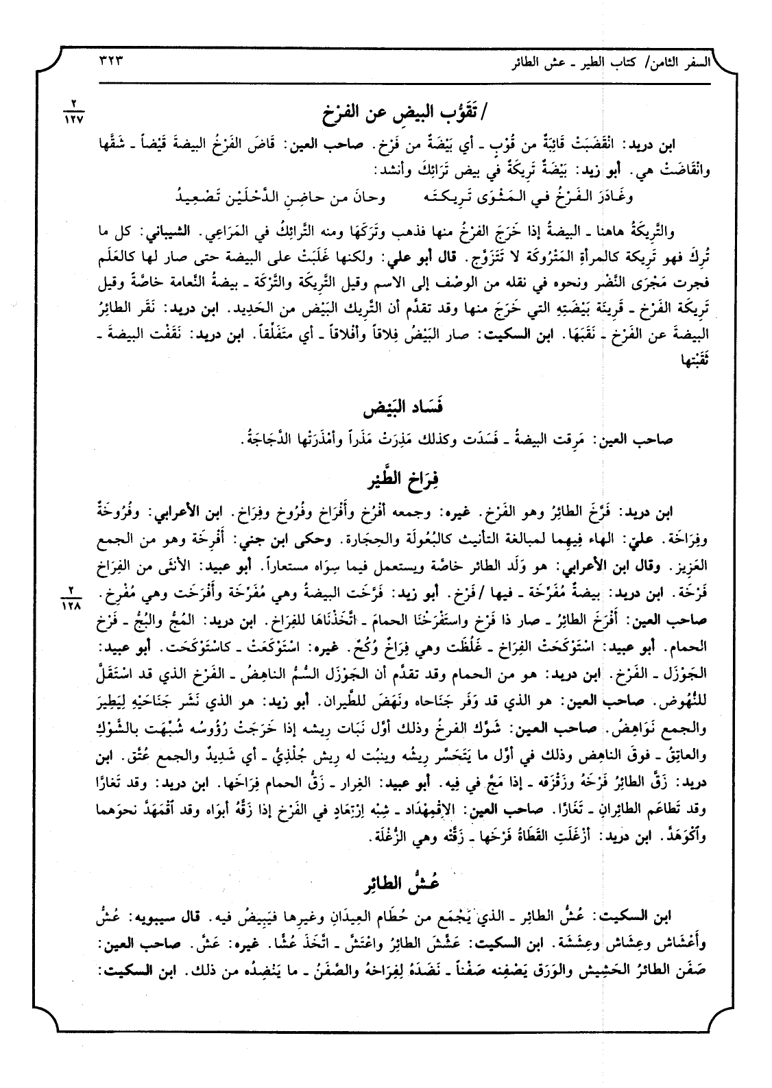 ابْن دُرَيْد فَرَّخَ الطائِرُ وَهُوَ الفَرْخ غَيره وَجمعه أفْرُخ وأَفْرَاخ وفُرُوخ وفِرَاخ ابْن الْأَعرَابِي وفُرُوخَةٌ وفِرَاخَة عَليّ الْهَاء فيهِما لمبالغة التَّأْنِيث كالبُعُولَة والحِجَارة وَحكى ابْن جني أَفْرِخَة وَهُوَ من الْجمع العَزِيز وَقَالَ ابْن الْأَعرَابِي هُوَ وَلَد الطَّائِر خاصَّة وَيسْتَعْمل فِيمَا سِوَاه مستعاراً أَبُو عبيد الأنثَى من الفِرَاخ فَرْخَة ابْن دُرَيْد بيضةٌ مُفَرِّخَة فِيهَا فَرْخ أَبُو زيد فَرَّخَت البيضةُ وَهِي مُفَرِّخَة وأَفْرَخَت وَهِي مُفْرِخ صَاحب الْعين أَفْرَخَ الطائِرُ صَار ذَا فَرْخ واستَفْرَخْنَا الحمامَ اتَّخَذْنَاهَا للفِرَاخ ابْن دُرَيْد المُجُّ والبُجُّ فَرْخ الْحمام أَبُو عبيد اسْتَوْكَحَتْ الفِرَاخ غَلُظَت وَهِي فِرَاخٌ وُكُحٌ غَيره اسْتَوْكَعَتْ كاسْتَوْكَحَت أَبُو عبيد الجَوْزَل الفَرْخ ابْن دُرَيْد هُوَ من الحما م وَقد تقدَّم أَن الجَوْزَل السُّمُّ الناهِضُ الفَرْخ الَّذِي قد اسْتَقَلَّ للنُّهُوض صَاحب الْعين هُوَ الَّذِي قد وَفَر جَناحَاه ونَهَضَ للطَّيران أَبُو زيد هُوَ الَّذِي نَشَر جَنَاحَيْهِ لِيَطِيرَ وَالْجمع نَوَاهِضُ صَاحب الْعين شَوَّك الفرخُ وَذَلِكَ أوَّل نَبَات رِيشه إِذا خَرَجَتْ رُؤُوسُه شُبِّهَت بالشَّوْكِ والعاتِقُ فوقَ الناهِض وَذَلِكَ فِي أوَّل مَا يَتَحَسَّر رِيشُه وينبُت لَهُ رِيش جُلْذِيُّ أَي شَدِيدٌ وَالْجمع عُتَّق ابْن دُرَيْد زَقَّ الطائِرُ فَرْخَهُ وزَقْزَقه إِذا مَجَّ فِي فِيه أَبُو عبيد الغِرار زَقُّ الْحمام فِرَاخَها ابْن دُرَيْد وَقد تَغارَّا وَقد تَطاعَم الطائِرَانِ تَغَارَّا صَاحب الْعين الاقْمهْدَاد شِبْه ارْتِعَادٍ فِي الفَرْخ إِذا زَقَّهُ أبوَاه وَقد اقْمَهَدَّا نحوَهما واكْوَهَدَّ ابْن دُرَيْد أزْغَلَتِ القَطَاةُ فَرْخَها زَقَّتْه وَهِي الزُّغْلَة