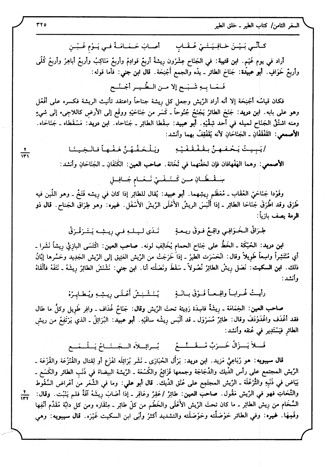 ابْن دُرَيْد الحُبْكَة الخَطُّ على جَنَاح الْحمام يُخَالِفِ لَونه صَاحب الْعين اكْتَسَى البازِيُّ رِيشاً نَشَرا أَي مُنْتَشِراً واسِعاً طَوِيلاً وَقَالَ انْحَسَرَت الطيرُ إِذا خَرَجَتْ من الرِّيش العَتِيق إِلَى الرِّيش الجَدِيد وحَسَّرها إبَّانُ ذَلِك ابْن السّكيت نَصَل رِيشُ الطائِرُ نُصُولاً سَقَطَ ونَصَلْته أَنا ابْن جني نَشْنَشَ الطائِرُ رِيشَهُ نَتَفَهُ فألْقَاهُ وَأنْشد