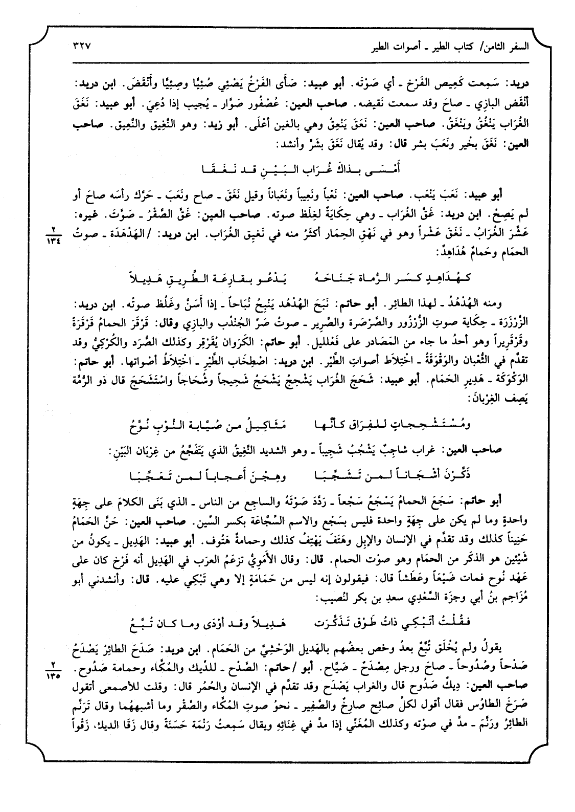 دُرَيْد سَمِعت كَعِيص الفَرْخ أَي صَوْتَه أَبُو عبيد صَأى الفَرْخُ يَصْئي صُئيًّا وأنْقَضَ ابْن دُرَيْد أنْقَض البازِي صاحَ وَقد سَمِعت نَقيضه صَاحب الْعين عُصْفُور صَوَّار يُجيب إِذا دُعِيَ أَبُو عبيد نَغَقَ الغُرَاب يَنْغُقُ ويَنْغَقُ صَاحب الْعين نَعَقَ يَنْعِقُ وَهِي بالغين أعْلَى أَبُو زيد وَهُوَ النَّغِيق والنَّعِيق صَاحب الْعين نَغَقَ بخْير ونَعَبَ بشر قَالَ وَقد يُقال نَغَقَ بشَرٍّ وَأنْشد