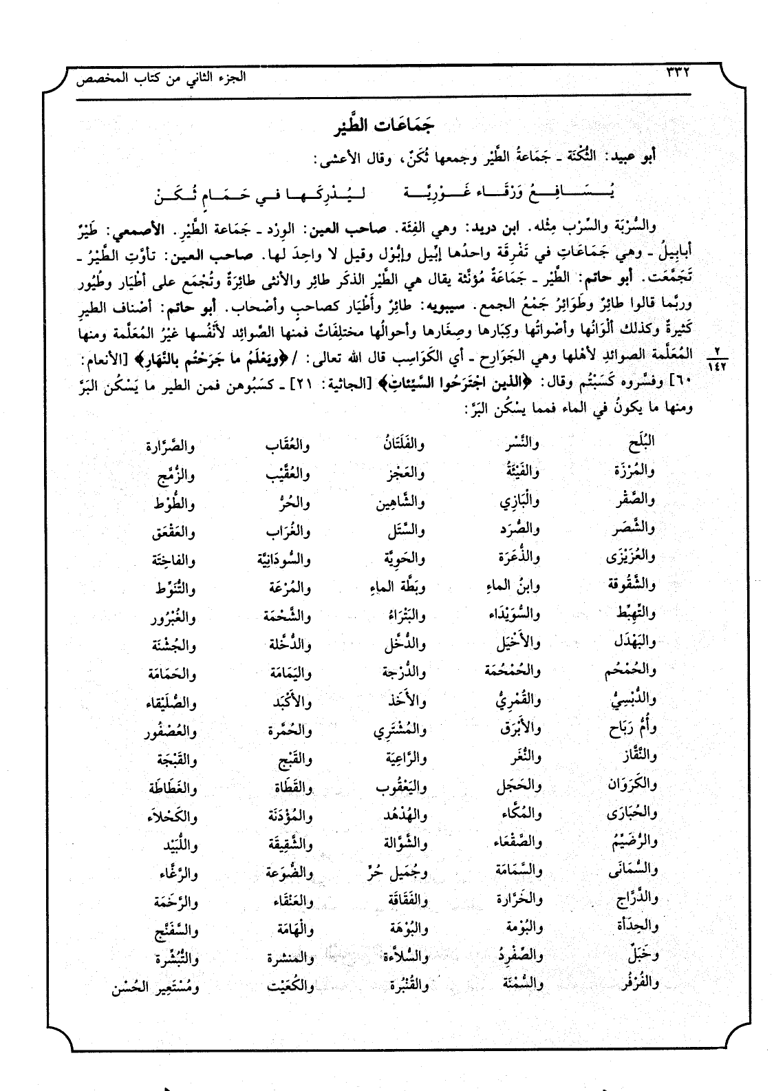 والسُّرْبَة والسِّرْب مِثْله ابْن دُرَيْد وَهِي الفِئَة صَاحب الْعين الوِرْد جَمَاعة الطَّيْرِ الْأَصْمَعِي طَيْرٌ أبابيلُ وَهِي جَمَاعَاتٍ فِي تَفْرِقَة واحدُها إبِّيل وإبُّوْل وَقيل لَا واحِدَ لَهَا صَاحب الْعين تأوَّت الطَّيْرُ تَجَمَّعَت أَبُو حَاتِم الطَّيْر جَمَاعةٌ مُؤنَّثة يُقَال هِيَ الطَّيْر الذكَر طائِر وَالْأُنْثَى طائِرَةٌ وتُجْمَع على أطْيَار وطُيُور وربَّما قَالُوا طائِرٌ وطَوَائِرُ جَمْعُ الْجمع سِيبَوَيْهٍ طائِرٌ وأَطْيَار كصاحبٍ وأصْحاب أَبُو حَاتِم أصْناف الطيرِ كَثِيرةٌ وَكَذَلِكَ ألْوَانُها وأصْواتثها وكِبَارها وصِغَارها وأحوالُها مختلِفَاتٌ فَمِنْهَا الصَّوائِد لأَنفُسها غيْرُ المُعَلَّمة وَمِنْهَا المُعَلَّمة الصوائِد لأهْلها وَهِي الجَوَارح أَي الكَوَسِب قَالَ الله تَعَالَى {ويَعْلَمُ مَا جَرَحْتُم بالنَّهَارِ} {الْأَنْعَام 60} وفسَّروه كَسِبْتُم وَقَالَ {الَّذين اجْتَرَحُوا السَّيِّئاتِ} {الجاثية 21} كسَبُوهن فَمن الطير مَا يَسْكُن البَرَّ وَمِنْهَا مَا يكونُ فِي المَاء فمما يسْكُن البَرَّ والصَّرَّارة والعُقَاب والفَلَتَانُ والنَّسْر البُلَح والزُّمَج والعُقَّيْب والعَجْز والفَيْئَةُ والمُرْزَة والطُّوْط والحُرُّ والشَّاهِين والْبَازِي والصَّقْر والعَقْعَق والغُرَاب والسَّتَل والصُّرَد والشَّصَر والفاخِتَة والسُّودَانِيًّة والحَوِيَّة والذُعَرَة والعُزَيْزَى والتُّنَوِّط والمُرْعَة وبَطَّة الماءِ وابنُ الماءِ والشَّقُوقة والغُبْرُور والشَّحْمَة والبَتْراءُ والسُّوَيْدَاء والتِّهِبَّط والجُشْنَة والدُّخَّلة والدُّخَّل والأخْيَل والبَهْدَل والحَمَامة واليَمَامَة والدُّرْجة والحُمْحُمَة والحُمْحُم والصُّلَيْقاء والأكْبَد والأخَذَ والقُمْرِيُّ والدُّبْسِيُّ والعُصْفُور والحُمَّرة والمُشْتَرِي والأَبْرَق وأُمُّ رَبَاح والقَبْجَة والقَبْج والرَّاعِيَة والنُّغَر والنَّقَّاز والغَطَاطَة والقَطَاة واليَعْقُوب والحَجَل والكَرَوَان والكَحْلاَء والمُؤْدَنَة والهُدْهُد والمُكَّاء والحُبَارَى واللُّبَيْد والشَّقِيقة والشَّوَّالة والصَّقْعَاء والرُّضَيِّمُ والرَّغَّاء والضُّوَعة وجُمَيل حُرٍّ والسَّمَامَة والسُّمَانَى والرَّخَمَة والعَنْقَاء والفَقَاقَة والخَرَّارة والدَّرَّاج والسَّفَنَّج والْهَامَة والبُوْهَة والبُوْمة والحَدَأة والتُّبُشِّرة والمنشرة والسُّلاَّءَة والصِّفْرِدُ وخَيَلٌ ومُسْتِعِير الحُسْن والكُعَيْت والقُنْبُرة والسُّمْنَة والفُرْفُر