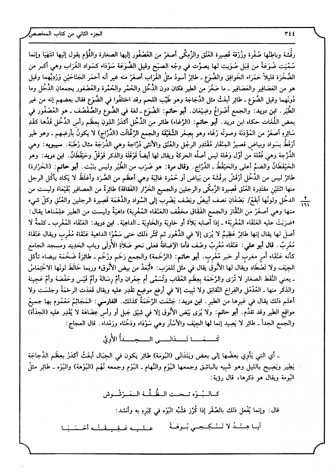 رقُشة وباطِنُها صُفْرة وزُرْقة قَصِيرة العُنُق والزِّمِكَّى أصغرُ من العُصْفُور إِلَيْهَا الصغارة واللُّؤْم يَقُول إِلَيْهَا انتَهَيَا وَإِنَّمَا سُمِّيَت ضُوَعَةً من قِبَل صُوَيت فِي وجْه الصبْح وَقيل الضُّوَعَة سَوْدَاء كَسَواد الغُرَاب وَهِي أكبر من الضُّخْرَة قَلِيلا حَمْرَاء الخَوافِق والضُّوَع طائِرُ أسودُ مثلُ الغُرَاب أصغَرُ مِنْهُ غير أَنه أحمَر الجَنَاحَيْنِ وَرْدِيُّهما وَقيل هُوَ من العَصَافِير والعَصَافِير مَا صَغُرَ من الطير فَكَانَ دون الدُّخَّل والحُمَّر والعُصْفور يجمعان الدُّخَّل وَمَا دُونَهما وَقيل الضُّوَع طائِر أبغَثُ مثل الدَّجَاجَة وَهُوَ طَيِّب اللَّحْم وَقد اختلفُوا فِي الضُّوَع فَقَالَ بَعضهم إِنَّه من غير الطَّيْر ابْن دُرَيْد وَالْجمع أضْواعٌ وضِيْعَان أَبُو حَاتِم الضِّوَع لُغَة فِي الضُّوع والصُّفْعُف هُوَ العُصْفُور فِي بعض اللُّغَات حَكَاهُ ابْن دُرَيْد أَبُو حَاتِم (الرَّغاء) طَائِر من الدُّخَّل أكدَرُ اللونِ بِعِظَم رأسِ الدُّخَّل قَدُّها كقَدِ سَائِرِهِ أصغَرُ من المُؤْدَنَة وصوتُه رُغَاء وَهُوَ بِصِغَر الشَّقَيِّقَة وَالْجمع الرَّغَّاآت (الدُّرَّاج) لَا يكونُ بأرضِهم وَهُوَ طير أرْقَطُ بسَواد وبياضٍ قصيرُ المِنْقَار مُقْتَدِر الرجْل والعُنُق وَالْأُنْثَى دُرَّاجة وَهِي الدُّرَجَة مِثَال رُطَبَة سِيبَوَيْهٍ وَهِي الدُّرَّجة وَهِي فُعَّلة من أوَّل وَهْلة لَيْسَ أصلُه الحركةَ وَيُقَال لَهَا أَيْضا قَوْقَلَة وَالذكر قَوْقَلٌ وحَيْقُطَانٌ ابْن دُرَيْد وَهُوَ الحَيْقَطَانُ والضمُّ أَعلَى والحَيْقُطُ الدُّرَّاج وَقَالَ مرّة هُوَ ضَرْب من الطَّيْر وَلَيْسَ بنَبْت أَبُو حَاتِم (الخَرَّارة) طائرٌ لَيْسَ من الدُّخَّل أرْقَشُ برقْشَة من بَياض أَو حُمْرة غَالِبَة وَهِي أعظَم من الصُّرَد وأغلَظُ لَا يَكاد يأكُل الرجل مِنْهَا اثنَتَيْنِ مقتَدِرة العُنُق قَصِيرة الزَّمِكَّى وَالرّجلَيْنِ والجميع الخَرَّار (الفَقاقة) طائِرةٌ من العصافير بُقَيْعَاءُ وَلَيْسَت من الدخَّل ولونُها أبقَعُ نِصْفَانِ نصف أبيضُ ونِصْف يَضْرِ إِلَى السَّواد والدُّهْمَة قَصِيرة الرجلَيْن والعُنُقِ وكلّ شَيْء مِنْهَا وَهِي أصغَرُ من النُّقَّاز وَالْجمع الفَقَاق مخفَّف (العَنْقَاء المُغْرِبة) داهيَةٌ وَلَيْسَت من الطير علِمْناها يُقَال ضرَبَتْ عَلَيْهِ العَنْقَاء المُغْرِب كلمةٌ لَا أصلَ لَهَا يُقَال إِنَّهَا طائِرٌ عَظِيمٌ لَا يُرَى إِلَّا فِي الدُّهُور ثمَّ كَثُر ذَلِك حَتَّى سَمَّوْا الداهية عَنْقَاءُ مُغْرب وَيُقَال عَنْقَاءُ مُغْرِبٌ قَالَ أَبُو عَليّ عَنْقَاء مُغْرِبٌ وصْف فَأَما الإضافةُ فعلى نَحْو صَلاَةِ الأُولَى وبابِ الحَدِيد ومسج الْجَامِع كَأَنَّهُ عَنْقَاء أَمرٍ مغربٍ أَو خبر مُغْرِبٍ أَبُو حَاتِم (الرَّخَمة) وَالْجمع رَخَم ورُخْم طائِرَةٌ ضَخْمَة بَيْضَاء تَأْكُل الجِيَف وَلَا تَصْطَاد وَيُقَال لَهَا الأَنُوق يُقَال فِي مثَل للعَرَب أَبَعَدُ من بيض الأَنُوق وَرُبمَا خَالَطَ لونَها الاخْتَمَاسُ يَعْنِي النُّقَط الصغار لَا تُرَى والرَّخَمَة بِعِظَم العُقَاب وتُسَمَّى أم جِعْران وأمَّ رِسَالةَ وأمَّ قَيْس وحَفْصَة وأمَّ عَجِيبة والذكَر مِنْهَا العُدْمُل والفِراخ النَّقانِق وَلَا تَبِيت إِلَّا فِي أرفع موضِع تقْدِر عَلَيْهِ وَيُقَال قَعَدَت الرخمَةُ وجلسَت وَلَا أعلم ذَلِك يُقَال فِي غَيرهَا من الطيرِ ابْن دُرَيْد جَثَمَت الرَّخَمَةُ كَذَلِك الْفَارِسِي المَجَاثِمُ مَعْمُوم بهَا جميعُ مواقِع الطير وَقد تقدَّم أَبُو حَاتِم وَلَا يُرَى بَيْض الأَنُوق إِلَّا فِي شِيْق جَبل أَو رأسِ عِضَاهَة لَا يُقْدِر عَلَيْهِ (الحِدَأة) وَالْجمع الحِدأ طائِر لَا يَصِيد إِنَّمَا لَهَا الجِيَف والأسْآر وَهِي سَوْدَاء ودَخْنَاء ورَمْداء قَالَ العجاج