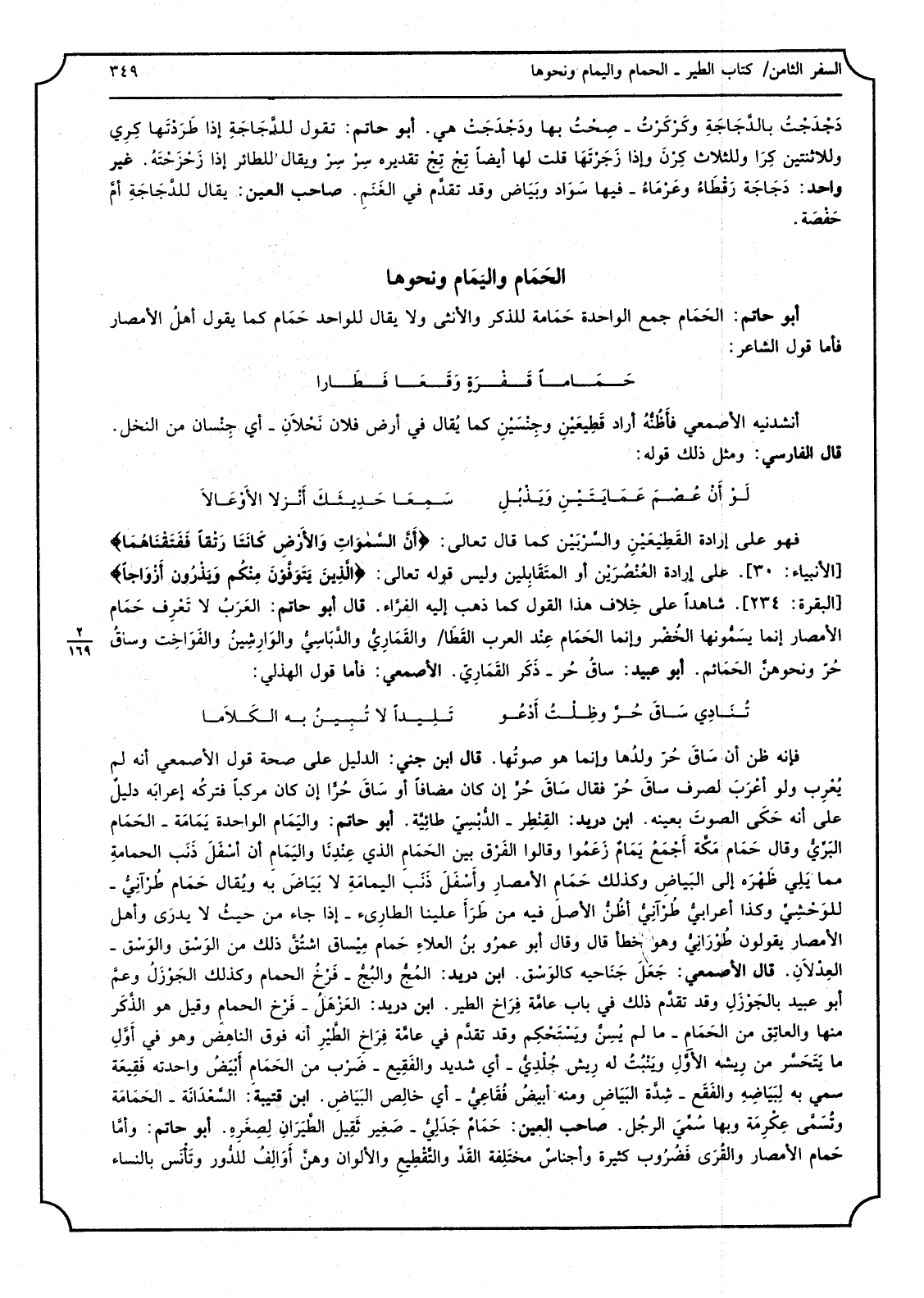 فَهُوَ على إِرَادَة القَطِيعَيْنِ والسِّرْبَيْن كَمَا قَالَ تَعَالَى {أَنَّ السَّمَواتِ والأَرْضِ كَانَتَا رَتْقاً فَفَتَقنَاهُما} {الْأَنْبِيَاء 30} على إِرَادَة العُنْصُرَيْن أَو المتَقَابِلين وَلَيْسَ قَوْله تَعَالَى {الَّذِينَ يَتَوَفَّوْن مِنْكُم وَيَذْرُون أْزْواجاً} {الْبَقَرَة 234} شَاهدا على خَلاف هَذَا القَوْل كَمَا ذهب إِلَيْهِ الفرَّاء قَالَ أَبُو حَاتِم العَرَبُ لَا تَعْرِف حَمَام الْأَمْصَار إِنَّمَا يسَمُّونها الخُضْر وَإِنَّمَا الحَمَام عِنْد الْعَرَب القَطَا والقَمَارِيُّ والدَّبَاسِيُّ والوَارِشِينُ والفَوَاخِت وساقُ حُرّ ونحوهنَّ الحَمَائم أَبُو عبيد ساقُ حُر ذَكَر القَمَارِيّ فَأَما قَول الْهُذلِيّ