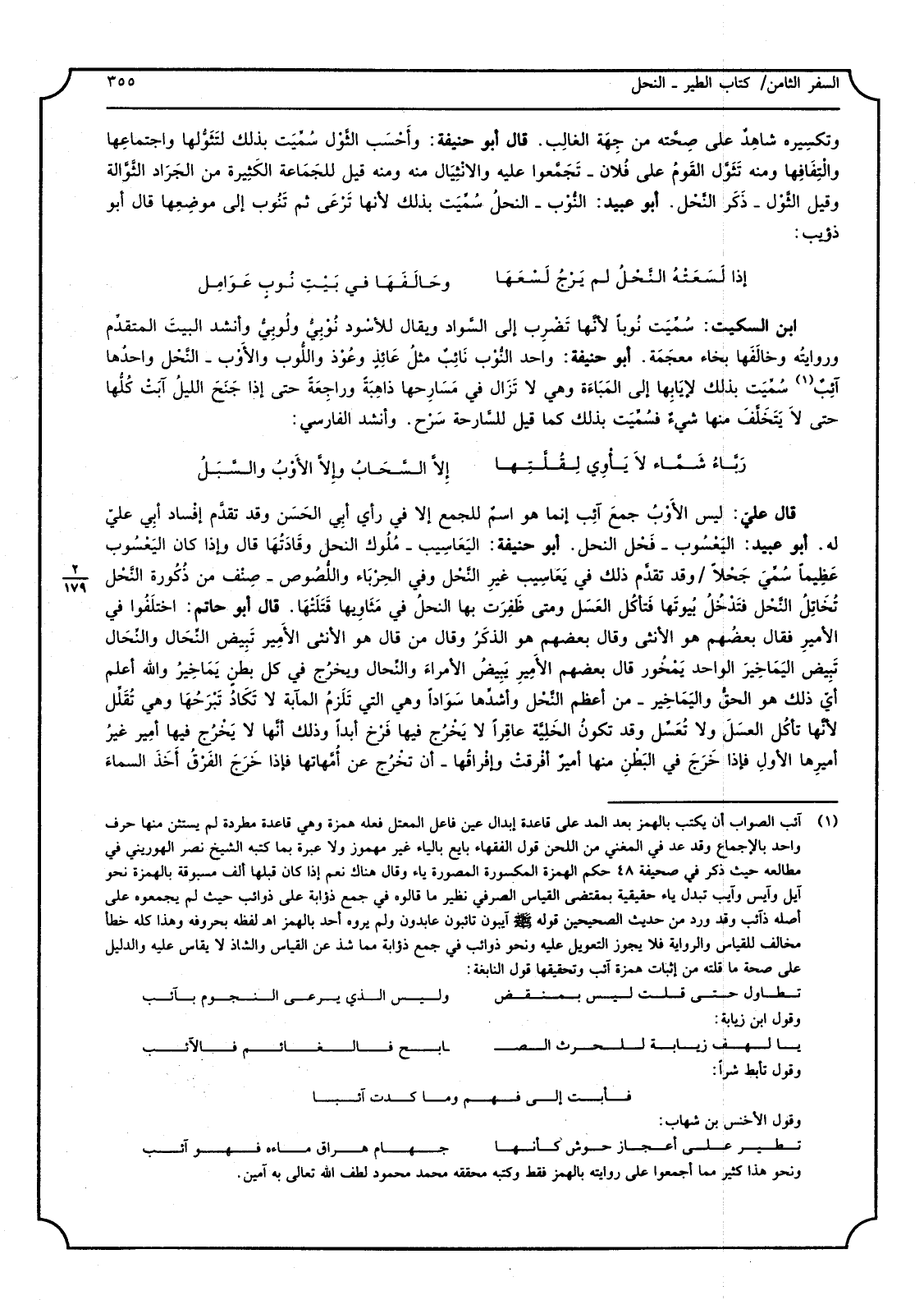 قَالَ عليّ لَيْسَ الأوْبُ جمعَ آئِب إِنَّمَا هُوَ اسمٌ للْجمع إِلَّا فِي رَأْي أبِي الحَسَن وَقد تقدَّم إفْساد أبِي عليّ لَهُ أَبُو عبيد اليَعْسُوب فَحْل النَّحْل أَبُو حنيفَة اليَعَاسِيب مُلُوك النَّحْل وقّادَتُهَا قَالَ وَإِذا كَانَ اليَعْسُوب عَظِيمًا سُمِّيَ جَحْلاً وَقد تقَّدم ذَلِك فِي يَعَاسِيب غيرِ النَّحْل وَفِي الحِرْبَاء واللُّصُوص صِنْف من ذُكُورة النَّحْل فتّدْخُلُ بُيوتَها فَتأكُل العَسَل وَمَتى ظَفِرَت بهَا النحلُ فِي مَثَاوِيها قَتَلَتْهَا قَالَ أَبُو حَاتِم اختلَفُوا فِي الأميرِ فَقَالَ بعضُهم هُوَ الْأُنْثَى وَقَالَ بَعضهم هُوَ الذكَرُ وَقَالَ من قَالَ هُوَ الْأُنْثَى الأمِير تَبيض النَّحَال والنَّحَال تَبِيض اليَمَاخِيرَ الْوَاحِد يَمْخُور قَال بَعضهم الأمِيرِ يَبِيضُ الأمراءَ والنِّحال ويخرُج فِي كل بطنٍ يَمَاخِيرُ وَالله أعلم أيّ ذَلِك هُوَ الحقُّ واليَمَاخِير - من أعظم النَّحْل وأشدِّها سَوَادًا وَهِي الَّتِي تَلَزمُ المآبة لَا تَكَادُ تَبْرَحُها وَهِي تُقَلَّل لأنَّها تأكُل العَسَل وَلَا تُعَسِّل وَقد تكونُ الخَلِيَّة عاقِرًا لَا يَخْرُج فِيهَا فَرْخ أبدا وَذَلِكَ أنَّها لَا يَخْرُج فِيهَا أمِير غيرُ أميرِها الأولِ فَإِذا خَرَجَ فِي البَطْنِ مِنْهَا أميرٌ أفْرقتْ وإفْراقُها - أَن تخْرُج عَن أُمَّهاتها فَإِذا خَرَجَ الفَرْقُ أّخَذَ السماءَ