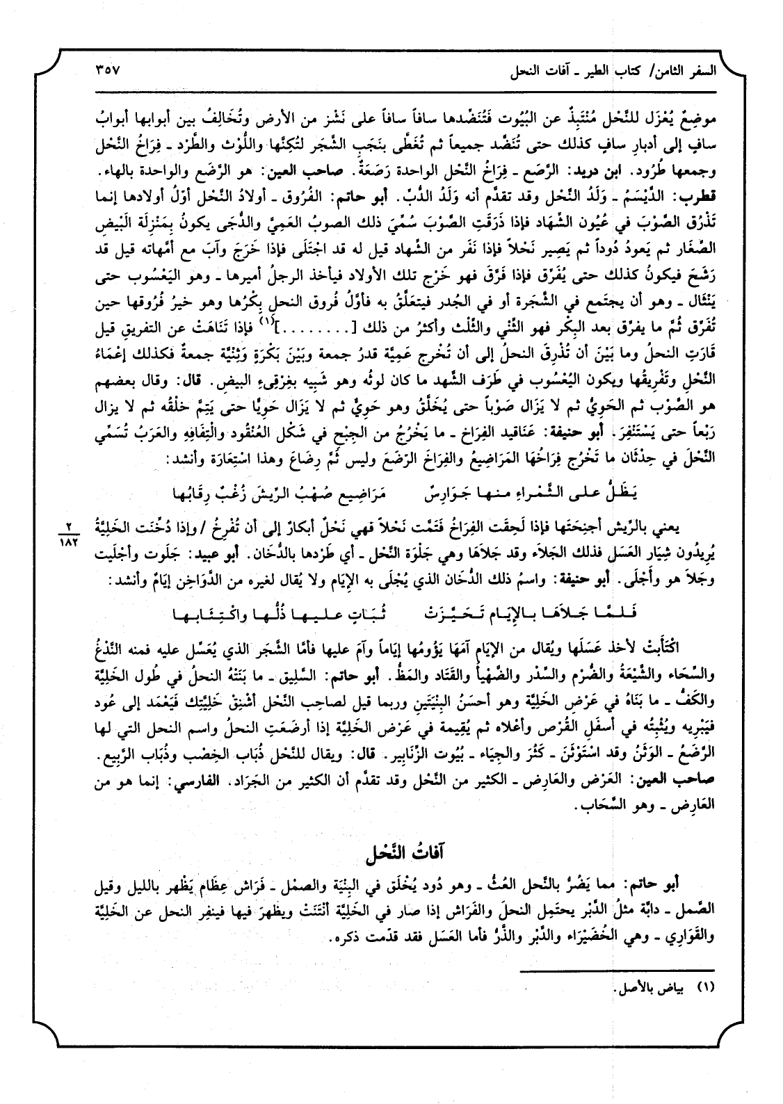 اكْتَأَبتْ لأخذ عَسَلَها ويُقال من الإيَام آمَهَا إيَامًا وآمَ عَلَيْهَا فأمَّا الشَّجَر الَّذِي يُعَسِّل عَلَيْهِ فَمِنْهُ النَّدْغُ والسَّحاء والشَّيْعَةُ والضُّرْم والسَّدر والضَّهْيأ والقَتَاد والمَظُّ أَبُو حَاتِم السَّلِيق مَا بَنَتْهُ النحلُ فِي طُول الخَلِيَّة والكَفُّ مَا بَنَاهُ فِي عَرْضِ الخَلِيَّة وَهُوَ أحسَنُ البِنْيَتَينِ وَرُبمَا قيل لصاحِب النَّحْل أشْنِقْ خَلِيَّتِك فَيَعْمَد إِلَى عُود فيَبْريه ويُثْبِتُه فِي أسفَل القُرص وَأَعلاهُ ثمَّ يُقِيمه فِي عَرْض الخَلِيَّة إِذا أرضَعَتِ النحلَ وَاسم النَّحْل الَّتِي لَهَا الرَّضَعُ الوَثّنُ كَثُرَ والجِيَاء بُيُوت الزَّنابِير قَالَ وَيُقَال للنَّحْل ذُبَاب الخَصْب وذُبَاب الرَّبِيع صَاحب الْعين العَرْض والعَارَض الْكثير من النَّحْل وَقد تقدَّم أَن الْكثير من الجَرَاد الْفَارِسِي إِنَّمَا هُوَ من العَارِض وَهُوَ السَّحَاب