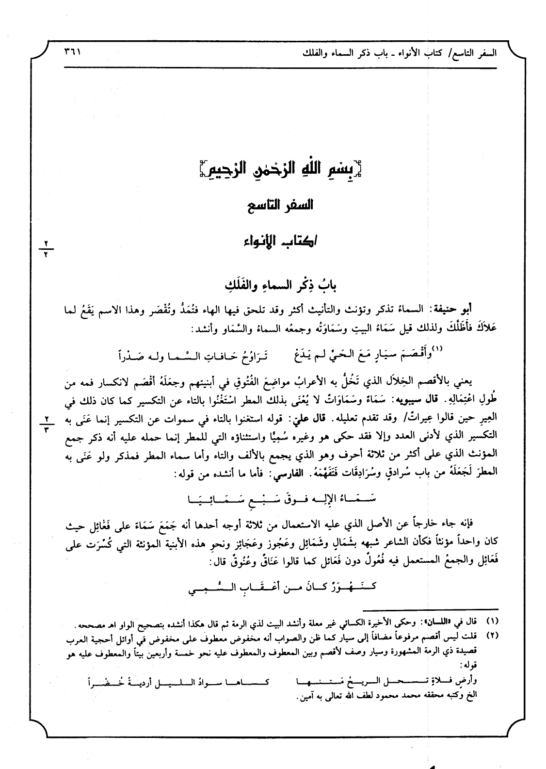 فَإِنَّهُ جَاءَ خَارِجا عَن الأَصْل الَّذِي عَلَيْهِ الِاسْتِعْمَال من ثَلَاثَة أوجه أَحدهَا أَنه جَمَعَ سَمَاءً على فَعَائِل حَيْثُ كَانَ وَاحِدًا مؤنثاً فَكَأَن الشَّاعِر شبهه بشَمَالٍ وشَمَائِل وعَجُوز وعَجَائِز ونحوِ هَذِه الْأَبْنِيَة المؤنثة الَّتِي كُسِّرَت على فَعَائِل والجمعُ الْمُسْتَعْمل فِيهِ فُعُولٌ دون فَعَائل كَمَا قَالُوا عَنَاقٌ وعُنُوقٌ قَالَ
