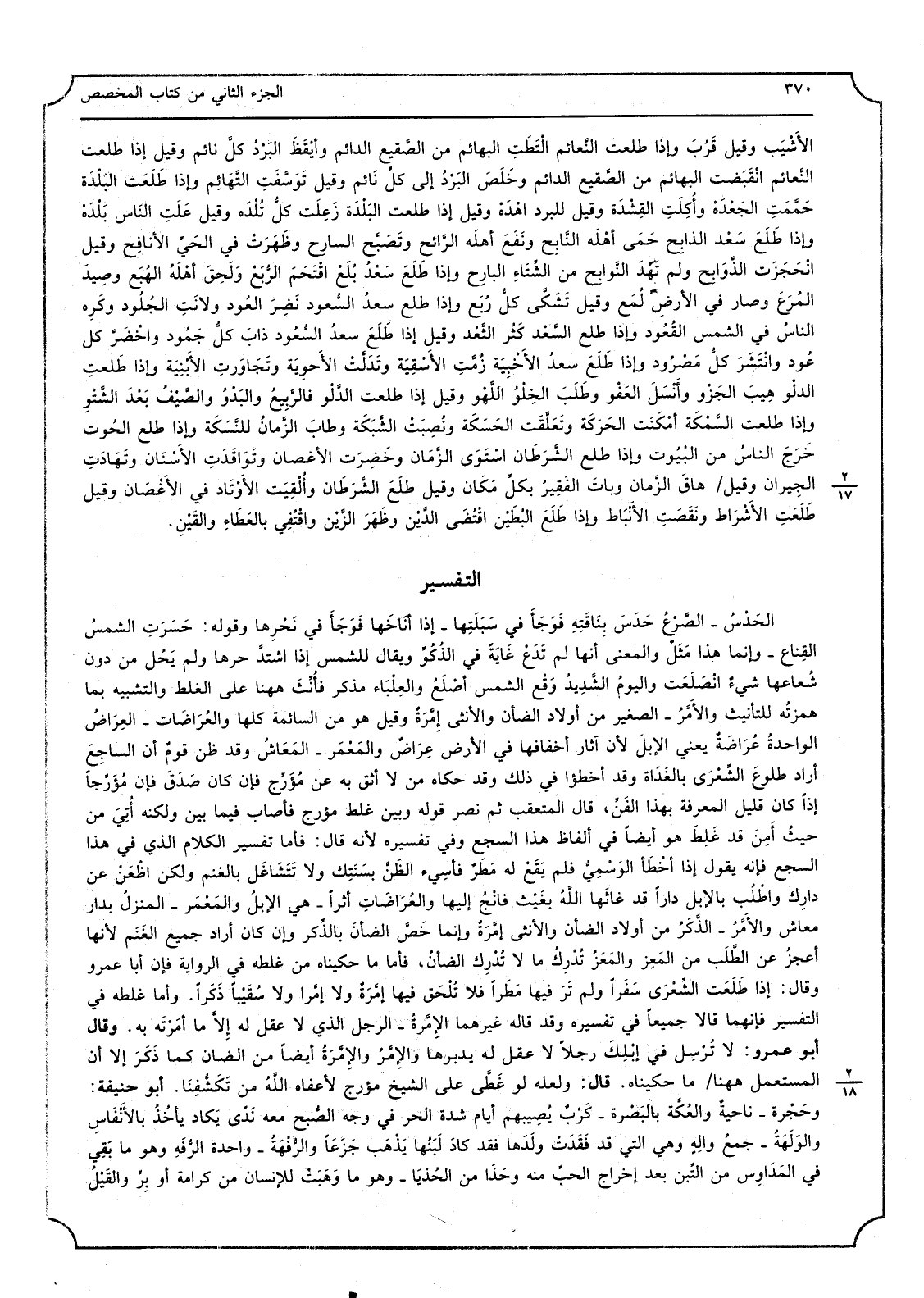 الحَدْسُ الصَّرْعُ حَدَسَ بِنَاقَتِهِ فَوَجَأ فِي سَبَلَتِها إِذا أنَاخَها فَوَجَأَ فِي نَحْرِها وَقَوله حَسَرَتِ الشمسُ القِناع وَإِنَّمَا هَذَا مَثَلٌ وَالْمعْنَى أَنَّهَا لم تَدَعْ غَايَةً فِي الذُكُوِّ وَيُقَال للشمس إِذا اشتدَّ حرهَا وَلم يَحُل من دون شُعاعها شيءٌ انْصَلَعَت واليومُ الشَّدِيدُ وَقع الشَّمْس أصْلَعُ والعِلْبَاء مُذَكّر فأُنِّثَ هَهُنَا على الْغَلَط والتشبيه بِمَا همزتُه للتأنيث والأَمَّرُ الصَّغِير من أَوْلَاد الضَّأْن وَالْأُنْثَى إِمَّرَةٌ وَقيل هُوَ من السَّائِمَة كلهَا والعُرَاضَات العِرَاضُ الواحدةُ عُرَاضَةٌ يَعْنِي الإبلَ لِأَن آثَار أخفافها فِي الأَرْض عِرَاضٌ والمَعْمَر المَعاشُ وَقد ظن قومٌ أَن الساجِعَ أَرَادَ طلوعَ الشِّعْرَى بالغَدَاة وَقد أخطؤا فِي ذَلِك وَقد حَكَاهُ من لَا أَثِق بِهِ عَن مُؤَرِّج فَإِن كَانَ صَدَقَ فَإِن مُؤَرِّجِاً إِذا كَانَ قَلِيل الْمعرفَة بِهَذَا الفَنِّ، قَالَ المتعقب ثمَّ نصر قَوْله وَبَين غلط مؤرج فَأصَاب فِيمَا بَين وَلكنه أُتِيَ من حيثُ أَمِنَ قد غَلِطَ هُوَ أَيْضا فِي أَلْفَاظ هَذَا السجع وَفِي تَفْسِيره لِأَنَّهُ قَالَ فَأَما تَفْسِير الْكَلَام الَّذِي فِي هَذَا السجع فَإِنَّهُ يَقُول إِذا أخْطَأ الوَسْمِيُّ فَلم يَقَع لَهُ مَطَرٌ فأسِيء الظَنَّ بسَنَتِك وَلَا تَتَشَاغَل بالغنم وَلَكِن اظْعَنْ عَن دارِك واطْلُب بِالْإِبِلِ دَارا قد غاثَها اللَّهُ بغَيْث فانْجُ إِلَيْهَا والعُرَاضَاتِ أثرا هِيَ الإبلُ والمَعْمَر الْمنزل بدار معاش والأمَّرُ الذَّكَرُ من أَوْلَاد الضَّأْن وَالْأُنْثَى إمَّرَةٌ وَإِنَّمَا خَصَّ الضأنَ بالذَّكر وَإِن كَانَ أَرَادَ جَمِيع الغَنَم لِأَنَّهَا أعجزُ عَن الطَّلَب من المَعِز والمَعَزُ تُدْرِكُ مَا لَا تُدْرِكُ الضأنُ، فَأَما مَا حكيناه من غلطه فِي الرِّوَايَة فَإِن أَبَا عَمْرو وَقَالَ إِذا طَلَعَت الشِّعْرَى سَفَراً وَلم تَرَ فِيهَا مَطَراً فَلَا تُلْحَق فِيهَا إمَّرَةٌ وَلَا إمَّرا وَلَا سُقَيْباً ذَكَراً وَأما غلطه فِي التَّفْسِير فَإِنَّهُمَا قَالَا جَمِيعًا فِي تَفْسِيره وَقد قَالَه غَيرهمَا الإمَّرةُ الرجل الَّذِي لَا عقل لَهُ إلاَّ مَا أمَرْتَه بِهِ وَقَالَ أَبُو عَمْرو لَا تُرْسِل فِي إبْلِكَ رجلا لَا عقل لَهُ يدبرها والإِمَّرُ والإِمَّرَةُ أَيْضا من الضان كَمَا ذَكَرَ إِلَّا أَن الْمُسْتَعْمل هَهُنَا / مَا حكيناه قَالَ وَلَعَلَّه لَو غَطَّى على الشَّيْخ مؤرج لأعفاه اللَّهُ من تَكَشُّفِنا أَبُو حنيفَة وحَجْرة - ناحيةٌ والعُكَّة بالَصْرة - كَرْبٌ يُصِبهم أَيَّام شدَّة الْحر فِي وَجه الصُّبح مَعَه نَدّى يَكاد يأخُذُ بالأَنْفَاسِ والوَلَهَةُ - جمعُ والِهٍ وَهِي الَّتِي قد فَقَدَتْ ولَدَها فقد كادَ لَبَنُها يَذْهَب جَزَعَاً والرُّفْهَةُ - وَاحِدَة الرُّفَهِ وَهُوَ مَا بَقِي فِي المَدَاوِس من التَّين بعد إِخْرَاج الحبِّ مِنْهُ وحَذَا من الحُذَيَا - وَهُوَ مَا وَهَبَتْ للْإنْسَان من كَرَامَة أَو بِرٍّ والقَيْلُ