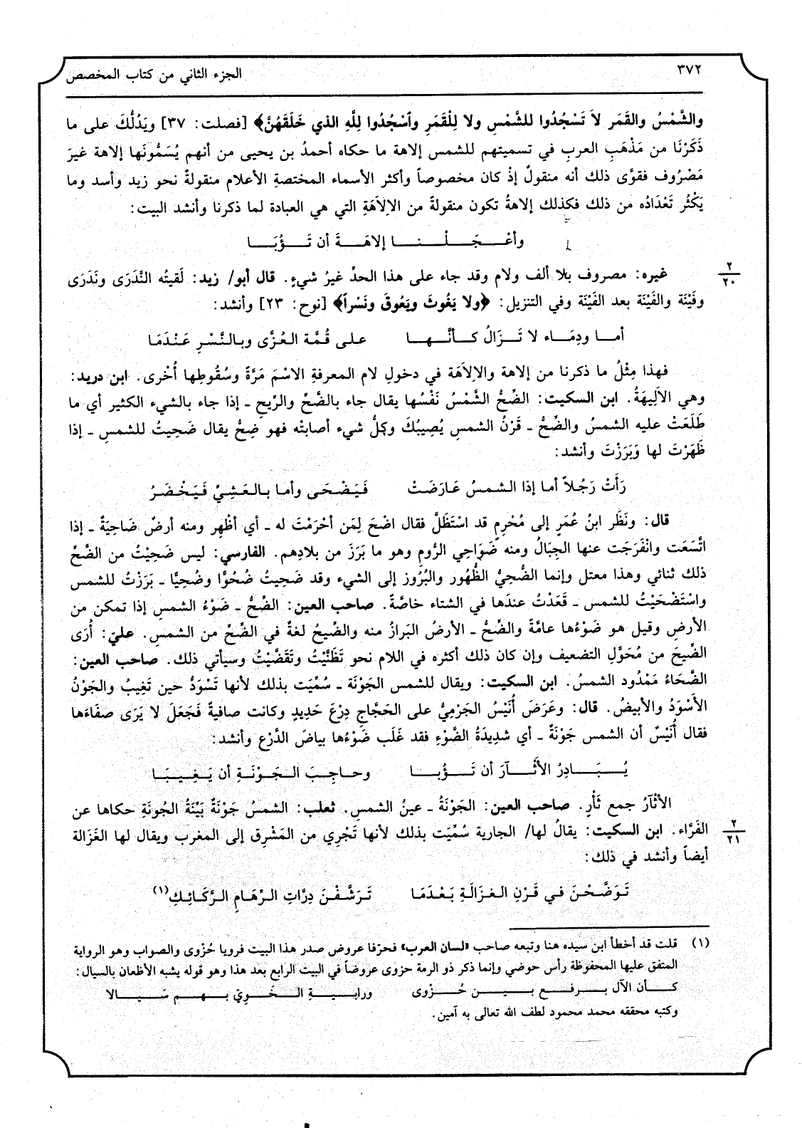 {وَمِن آياتِه الليلُ والنهارُ والشَّمسُ والقَمَر لَا تَسْجُدوا للشّمْسِ وَلَا لِلْقَمِرِ واسْجُدوا للهِ الَّذِي خَلَقَهُنَّ} {فصلت 37} ويَدُلُّكَ على مَا ذَكَرْنَا من مَذْهبِ العربِ فِي تسميتهم للشمس إلاهة مَا حَكَاهُ أحمدُ بن يحي من أَنهم يُسَمُّونَها إلاهة غيرض مَصْرُوف فقوَّى ذَلِك أَنه منقولٌ إذْ كَانَ مَخْصُوصًا وَأكْثر الْأَسْمَاء المختصةِ الْأَعْلَام منقولةٌ نَحْو زيد وَأسد وَمَا يَكْثُر تَعْدَادُه من ذَلِك فَكَذَلِك إلاهةُ تكون منقولةٌ من الاِلاَهَةِ الَّتِي هِيَ الْعِبَادَة لما ذكرنَا وَأنْشد الْبَيْت ( ... وأعْجلْنا إلاهَةَ أَن تَؤُبَا ... )