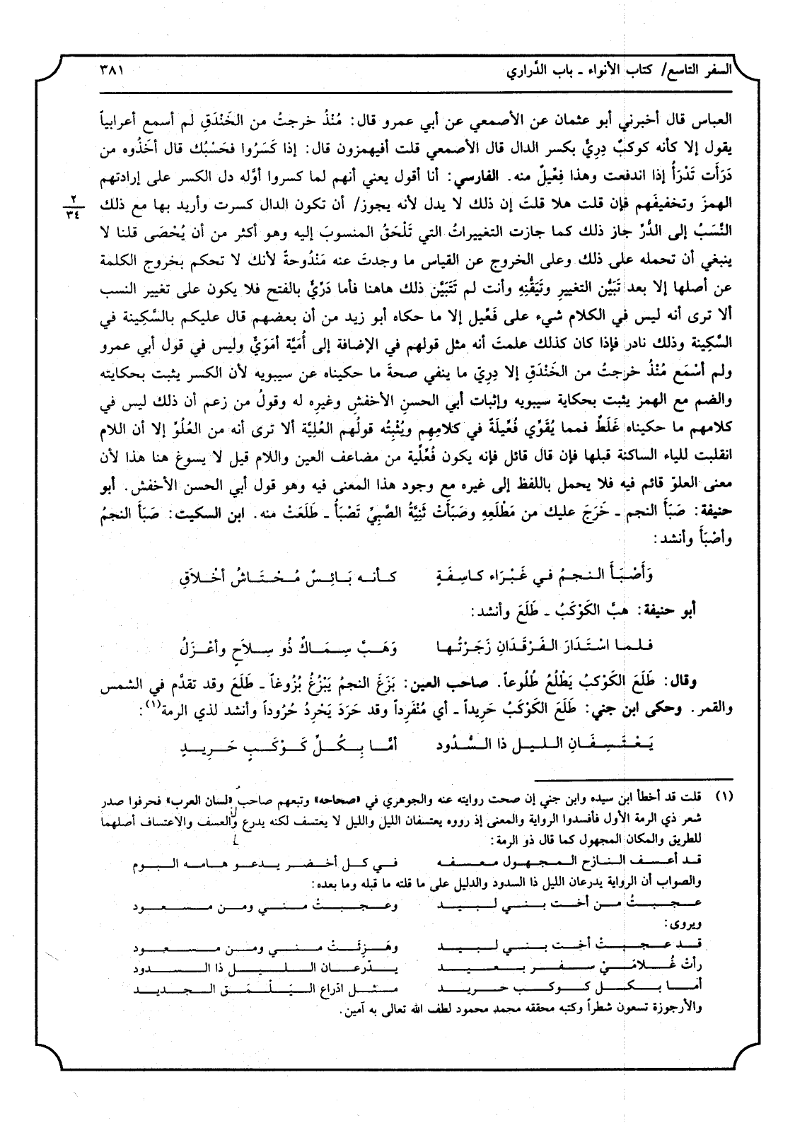 قَالَ أَخْبرنِي أَبُو عُثْمَان عَن الْأَصْمَعِي عَن أبي عَمْرو قَالَ مُنْذُ خرجتُ من الخَنْدَقِ لم أسمع أَعْرَابِيًا يَقُول إِلَّا كَأَنَّهُ كوكبٌ دِرِيٌّ بِكَسْر الدَّال قَالَ الْأَصْمَعِي قلت أفيهمزون قَالَ إِذا كَسَرُوا فحَسْبُك قَالَ أخَذُوه من دَرَأَت تَدْرَأُ إِذا اندفعت وَهَذَا فَعِّيلٌ مِنْهُ الْفَارِسِي أَنا أَقُول يَعْنِي أَنهم لما كسروا أوَّله دلّ الْكسر على إرادتهم الهمزَ وتخفيفَهم فَإِن قلت هلا قلتَ إِن ذَلِك لَا يدل لِأَنَّهُ يجوز / أَن تكون الدَّال كسرت وَأُرِيد بهَا مَعَ ذَلِك النَّسَبُ إِلَى الدُّرِّ جَازَ ذَلِك كَمَا جَازَت التغييراتُ الَّتِي تَلْحَقُ المنسوبَ إِلَيْهِ وَهُوَ أَكثر من أَن يُحْصَى قُلْنَا لَا يَنْبَغِي أَن تحمله على ذَلِك وعَلى الْخُرُوج عَن الْقيَاس مَا وجدتَ عَنهُ مَنْدُحةً لِأَنَّك لَا تحكم بِخُرُوج الْكَلِمَة عَن أَصْلهَا إِلَّا بعد تَبَيُّن التغييرِ وتَيَقُّنِهِ وَأَنت لم تَتَبَيَّن ذَلِك هَاهُنَا فَأَما دَرِّيٌّ بِالْفَتْح فَلَا يكون على تَغْيِير النّسَب أَلا ترى أَنه لَيْسَ فِي الْكَلَام شَيْء على فَعِّيل إِلَّا مَا حَكَاهُ أَبُو زيد من أَن بَعضهم قَالَ عَلَيْكُم بالسِّكِينة فِي السَّكينة وَذَلِكَ نَادِر فَإِذا كَانَ كَذَلِك علمتَ أَنه مثل قَوْلهم فِي الْإِضَافَة إى أُمَيَّة أمَوَيٌّ وَلَيْسَ فِي قَول أبي عَمْرو وَلم أسْمَع مُنْذُ خرجتُ من الخَنْدَقِ إِلَّا دِرِيّ مَا يَنْفِي صحةَ مَا حكيناه عَن سِيبَوَيْهٍ لِأَن الْكسر يثبت بحكايته وَالضَّم مَعَ الْهَمْز يثبت بحكاية سِيبَوَيْهٍ وَإِثْبَات أبي الحسنِ الأخفشِ وغيرِه لَهُ وقولُ من زعم أَن ذَلِك لَيْسَ فِي كَلَامهم مَا حكيناه غَلَطٌ فمما يُقَوِّي فُعِّيلَةً فِي كلامِهِم ويُثْبِتُه قولُهم العُلِيَّة أَلا ترى أَنه من العُلُوِّ إِلَّا أَن اللَّام انقلبت للياء الساكنة قبلهَا فَإِن قَالَ قَائِل فَإِنَّهُ يكون فُعِّلِّية من مضاعف الْعين وَاللَّام قيل لَا يسوغ هُنَا هَذَا لِأَن معنى العلّ قَائِم فِيهِ فَلَا يحمل بِاللَّفْظِ إِلَى غَيره مَعَ وجود هَذَا الْمَعْنى فِيهِ وَهُوَ قَول أبي الْحسن الْأَخْفَش أَبُو حنيفَة صَبَأَ النَّجْم - خَرجَ عَلَيْك من مَطْلَعِهِ وصَبَأَتْ ثَنِيَّةُ الصَّبِيِّ تَصْبَأُ - طَلَعَتْ مِنْهُ ابْن السّكيت صَبَأَ النجمُ وأصْبَأَ وَأنْشد