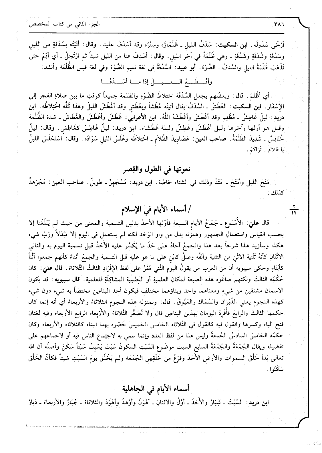 قَالَ عَليّ الأًسْبُوع - جُمَاعُ الْأَيَّام السَّبْعَة فأوَّلها الأحدُ بِدَلِيل التَّسْمِيَة وَالْمعْنَى من حَيْثُ لم يَبْلُغْنَا إِلَّا بِحَسب الْقيَاس وَاسْتِعْمَال الْجُمْهُور وهمزته بدل من وَاو الوَحَد لكنه لم يسْتَعْمل فِي الْيَوْم إِلَّا مَبْدَلاً ورُبَّ شَيْء هَكَذَا وسأزيد هَذَا شرحا بعد هَذَا والجمعُ آحادٌ على حَدِّ مَا يُكُسِّر عَلَيْهِ الأحَدُ قبل تَسْمِيَة الْيَوْم بِهِ وَالثَّانِي الاثْنَانِ كأنَّهُ تَثْنِية الاثْنِ من التَّثْنِيَة وألفُه وصلٌ كابْنِ على مَا هُوَ عَلَيْهِ قبل التَّسْمِيَة والجمعُ أثناءٌ كَأَنَّهُمْ جمعُوا أثْناً كأبْنَاءٍ وَحكى سِيبَوَيْهٍ أَن من الْعَرَب من يقولُ الْيَوْم الثِّني مُقَرٌّ على لفظ الإفْرادِ الثالثُ الثَّلاثاء قَالَ عليّ كَانَ حُكْمُه الثالثَ وَلَكنهُمْ صاغُوه هَذِه الصِّيغَة لمكانِ العلمية أَو الجِنْسِية المشاكِلَةِ للعلمية قَالَ سِيبَوَيْهٍ قد يكون الاسمانِ مشتقين من شَيْء ومعناهما وَاحِد وبناؤهما مُخْتَلف فَيكون أحد البناءين مُخْتَصًّا بِهِ شَيْء دون شَيْء كهذه النُّجُوم يَعْنِي الدَّبَران والسِّمَاك والعَيُّوقَ قَالَ وبمنزلة هَذِه النُّجُوم الثلاثاءُ والأربعاءُ أَي أَنه إِنَّمَا كَانَ حكمهَا الثالثَ والرابعَ فأُفْرِدَ اليومان بِهَذَيْنِ البناءين قَالَ وَلَا تُصَغَّر الثَّلاثاءُ والأرْبِعاء الرَّابِع الْأَرْبَعَاء وَفِيه لُغَتَانِ فتح الْبَاء وَكسرهَا وَالْقَوْل فِيهِ كالقول فِي الثَّلاثاء الْخَامِس الْخَمِيس خَصّوه بِهَذَا الْبناء كالثلاثاء وَالْأَرْبِعَاء وَكَانَ حكمُه الخامسَ السادسُ الجُمعَةُ وَلَيْسَ هَذَا من لفظ الْعدَد وَإِنَّمَا سمي بِهِ لِاجْتِمَاع النَّاس فِيهِ أَو لاجماعهم على تفضيله وَيُقَال الجُمْعَةُ والجُمُعَةُ السَّابِع السبت موضُوع السَّبْتِ السكونُ سَبَتَ يَسْبِتُ سَبْتاً سَكَنَ واصلُ أَن الله تَعَالَى بَدأ خَلْقَ السمواتِ والأرضِ الأحَدَ وفَرَغَ من خَلْقِهن الجُمعة وَلم يَخْلُق يَوْم السَّبْت شَيْئا فكأنَّ الخَلْق سَكَنُوا