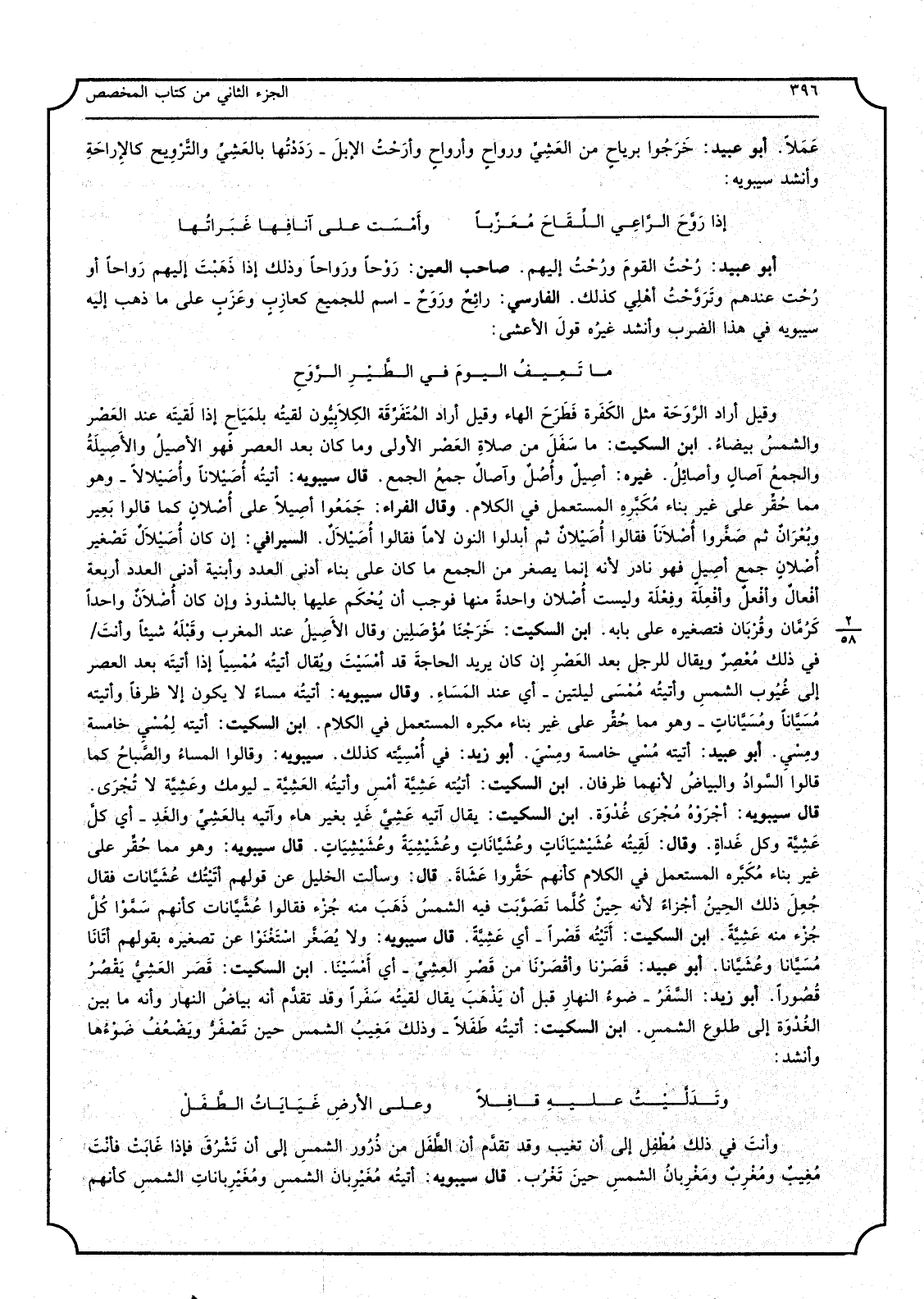 وَقيل أَرَادَ الرَّوَحَة مثل الكَفَرة فَطَرَحَ الْهَاء وَقيل أَرَادَ المُتَفَرِّقَة الكَلاَبِيُّون لقيتُه بلمَيَاح إِذا لَقيته عِنْد العَصْر والشمسُ بيضاءُ ابْن السّكيت مَا سَفَلَ من صلاةِ العَصْر الأولى وَمَا كَانَ بعد الْعَصْر فَهُوَ الأصيلُ والأَصِيلَةُ والجمعُ آصالٍ وأصائِلُ غَيره أصِيلٌ وأُصُلٌ وآصالٌ جمعُ الْجمع قَالَ سِيبَوَيْهٍ أتيتُه أُصَيْلاناً وأُصَيْلالاً وَهُوَ مِمَّا حُقِّر على غير بِنَاء مُكَبَّرِهِ الْمُسْتَعْمل فِي الْكَلَام وَقَالَ الْفراء جَمَعُوا أصَيلاً على أُصْلانٍ كَمَا قَالُوا بَعِير وبُعْرَانٌ ثمَّ ضَغَّروا أُصْلاَناً فَقَالُوا أُصَيْلانٌ ثمَّ أبدلوا النُّون لاماً فَقَالُوا أُصَيْلاَلٌ السيرافي إِن كَانَ أُصَيْلاَلٌ تَصْغير أُصْلانٍ جمع أصِيل فَهُوَ نَادِر لِأَنَّهُ إِنَّمَا يصغر من الْجمع مَا كَانَ على بِنَاء أدنى الْعدَد وأبنية أدنى الْعدَد أَرْبَعَة أفْعالٌ وأفْعلٌ وأفْعِلَة وفِعْلَة وَلَيْسَت أُصْلان وَاحِدَة مِنْهَا فَوَجَبَ أَن يُحْكَم عَلَيْهَا بالشذوذ وَإِن كَانَ أُصْلاَنٌ وَاحِدًا كَرُمَّان وقُرْبَان فتصغيره على بَابه ابْن السّكيت خَرَجْنَا مُؤْصَلِين وَقَالَ الأَصيلُ عِنْد الْمغرب وقَبْلَهُ شَيْئا وأنتَ فِي ذَلِك مُعْصِرٌ وَيُقَال للرجل بعد العَصْرِ إِن كَانَ يُرِيد الحاجةَ قد أمْسَيْتَ ويُقال أتيتُه مُمْسِياً إِذا أتيتَه بعد الْعَصْر إِلَى غُيُوب الشمسِ وأتيتُه مُمْسَى لَيْلَتَيْنِ أَي عِنْد المَسَاءِ وَقَالَ سِيبَوَيْهٍ أتيتُه مسَاء لَا يكون إِلَّا ظرفا وأتيته مُسَيَّناً ومُسَيَّاناتٍ وَهُوَ مِمَّا حُقِّر على غير بِنَاء مكبره الْمُسْتَعْمل فِي الْكَلَام ابْن السّكيت أَتَيْته لِمُسْي خَامِسَة ومِسْيِ أَبُو عبيد أَتَيْته مُسْي خَامِسَة ومِسْيَ أَبُو زيد فِي أُمْسِيَّته كَذَلِك سِيبَوَيْهٍ وَقَالُوا المساءُ والصَّباحُ كَمَا قَالُوا السَّوادُ والبياضُ لِأَنَّهُمَا ظرفان ابْن السّكيت أتيتُه عَشِيَّة أمْسِ وأتيتُه العَشِيَّة ليومك وعَشِيَّة لَا تُجْرَى قَالَ سِيبَوَيْهٍ أجْرَوْهُ مُجْرَى غُدْوَة ابْن السيكت يُقَال آتيه عَشِيَّ غَدٍ بِغَيْر هَاء وآتيه بالعَشِيِّ والغَدش أَيْن كلَّ عَشِيَّة وكل غَداةٍ وَقَالَ لَقِيتُه عُشِيْشيَانَاتٍ وعُشَيَّانَاتٍ وعُشَيِشِيَةً وعُشَيْشِيَاتْ قَالَ سِيبَوَيْهٍ وَهُوَ مِمَّا حُقَّر على غير بِنَاء مُكَبَّره الْمُسْتَعْمل فِي الْكَلَام كَأَنَّهُمْ حَقَّروا عَشَاةَ قَالَ وَسَأَلت الْخَلِيل عَن قولمهم أتَيْتُك عُشَيَّانات فَقَالَ جُعِلَ ذَلِك الحِينُ أجْزاءً لِأَنَّهُ حِينٌ كُلَّما تَصَوَّبَت فِيهِ الشمسُ ذَهَبَ مِنْهُ جُزْء فَقَالُوا عُشَّيَّانات كَأَنَّهُمْ سَمَّوْا كُلَّ جُزْس مِنْهُ عَشِيَّةً ابْن السّكيت أتَيْتُه قَصْراً أَي عَشِيَّةً قَالَ سِيبَوَيْهٍ وَلَا يُصَغَّر اسْتَغْنَوْا عَن تصغيره بقَوْلهمْ أتَانَا مُسَيَّانا وعُشَيَّانا أَبُو عبيد قَصَرْنا وأقْصَرْنَا من قَصْرِ العِشِيِّ أَي أمْسَيْنَا ابْن السّكيت قَصَر العَشِيُّ يَقْصُرُ قُصُوراً أَبُو زيد السَّفَرُ ضوءُ النهارِ قبل أَن يَذْهِبَ يُقَال لقيتُه سَفَراً وَقد تقدَّم أَنه بياضُ النَّهَار وَأَنه مَا بَين الغُدْوَة إِلَى طُلُوع الشَّمْس ابْن السّكيت أتيتُه طَفَلاً وَذَلِكَ مَغِيبُ الشَّمْس حِين تَصْفَرُّ ويَضْعُفُ ضَوْءُها وَأنْشد