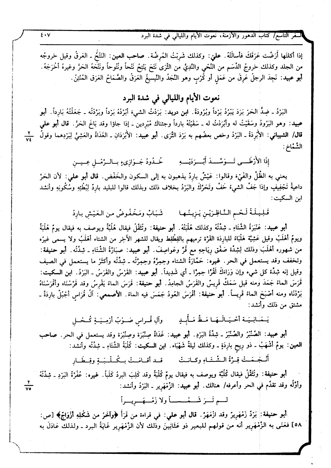 أَبُو عبيد عَنْبَرَةُ الشَّتَاءِ شِدَّتُهُ وَكَذَلِكَ هُلْبَتُهُ أَبُو حنيفَة وتُثَقَّلُ فَيُقَال هُلُبَّةٌ ويوصف بِهِ فَيُقَال يومٌ هُلْبَةٌ ويومٌ أهْلَبُ وَقيل عَشِيَّة هَلْبَاءُ للبارِدَة القَرَّة ترميهم بالقِطْقِط وَيُقَال للشهر الآخِر من الشتَاء أهْلَبُ وَلَا يُسمى غيرُه من شهوره أهْلَبَ وَذَلِكَ لِشِدَّة صَفْق رِيَاحِهِ مَعَ قُرِّ وعَواصِفَ أَبُو عبيد صبَارَّةُ الشِّتَاءٍ شِدَّتُه أَبُو حنيفَة وتخفف وَقد يسْتَعْمل فِي الْحر غَيره حَمَّارَةُ الشتَاء وحِمِرُّهُ وحِمِرَّتُه شِدَّتُه وأكثَرُ مَا يسْتَعْمل فِي الصَّيف وَقيل إِنَّه شِدَّة كل شَيْء وَإِن وَرَاءَكَ لَقُرّاً حِمِرّاً أَي شَدِيداً أَبُو عبيد القَرْسُ والقَرَسُ البَرْدُ ابْن السّكيت قَرَسَ الماءُ جَمَدَ وَمِنْه قيل سَمَكٌ قَرِيسٌ والقَرَسُ الجامِدُ أَبُو حنيفَة قَرَسَ الماءُ يَقْرِسُ وَقد قَرَّسْنَاه وأقْرَسْنَاهُ بَرَّدْنَاه وَمِنْه أصْبَحَ الماءُ قَرِيساً أَبُو حنيفَة أقْرَسَ العُودُ جَمَسَ فِيهِ الماءُ الْأَصْمَعِي آلُ قُرَاسٍ أجْبُلٌ بارِدَةٌ مُشْتَقّ من ذَلِك وَأنْشد