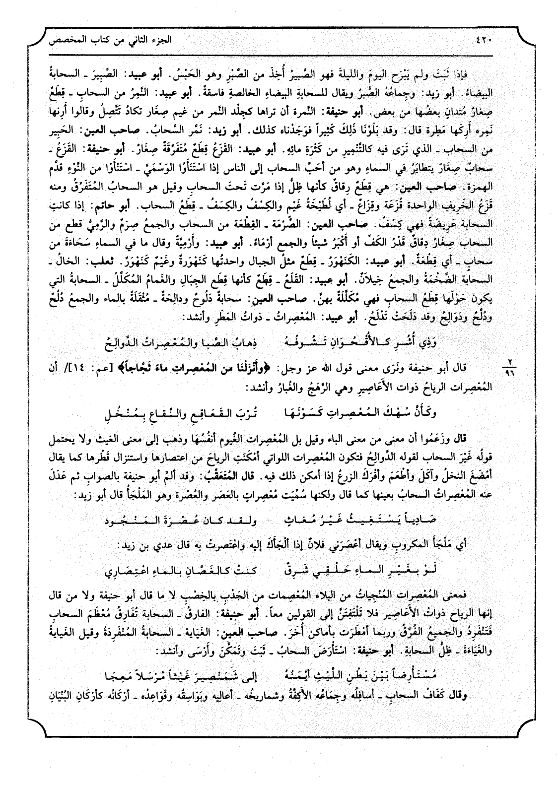 فَمَعْنَى المُعْصِرات المُنْجِياتُ من الْبلَاء المُعْصِيات من الجَدْبِ بالخِصْبِ لَا مَا قَالَ أَبُو حنيفَة وَلَا من قَالَ إِنَّهَا الرِّيَاح ذواتُ الأعَاصِير فَلَا تَلْتَفِتَنَّ إِلَى الْقَوْلَيْنِ مَعًا أَبُو حنيفَة الفارقُ السحابة تُفَارِقُ مُعْظَمَ السحابِ فَتَنْفَرِدُ والجميعُ الفُرَّقُ وَرُبمَا أمْطَرَت بأماكن أُخَرَ صَاحب الْعين الغَيَابة السحابةُ المُنْفَرِدَةُ وَقيل الغَيابةُ والغَيَاءَةَ ظِلُّ السحابةِ أَبُو حنيفَة اسْتَأْرَضَ السحابُ ثَبَتَ وتَمَكَّنَ وأَرْسَى وَأنْشد