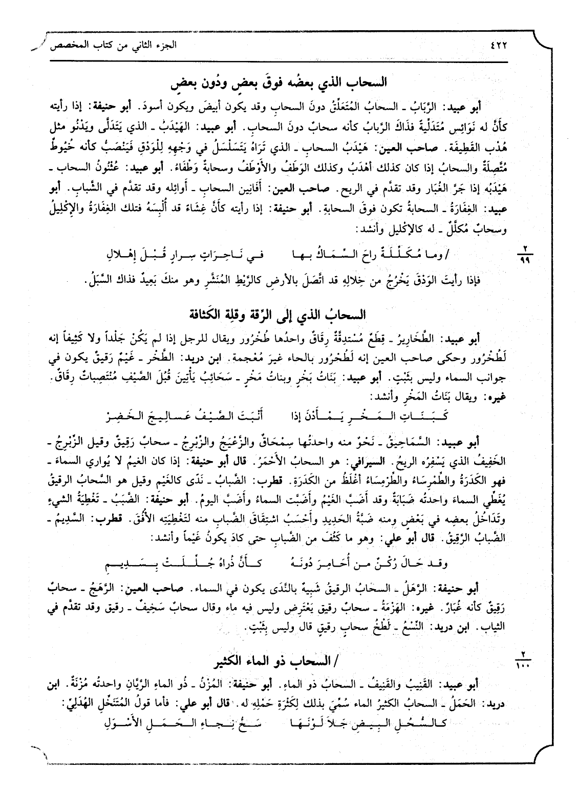 أَبُو عبيد الرَّبَابُ السحابُ المُتَعَلِّقُ دونَ السحابِ وَقد يكون أبيضَ وَيكون أسودَ أَبُو حنيفَة إِذا رَأَيْته كأَنَّ لَهُ نَوَائِس مُتَدَلِّيةً فذَاكَ الرَّبابُ كَأَنَّهُ سحابٌ دون السحابِ أَبُو عبيد الهَيْدَبُ الَّذِي يَتَدَلَّى ويَدْنُو مثل هُدْب القَطِيفَة صَاحب الْعين هَيْدَبُ السحابِ الَّذِي تَرَاهُ يَتَسَلْسَلُ فِي وجْهِهِ لِلْوَدقِ فَيَنْصَبُّ كَأَنَّهُ خُيُوطٌ مُتَّصِلَةٌ والسحابُ إِذا كَانَ كَذَلِك أهْدَبُ وَكَذَلِكَ الوَطَفُ والأَوْطَفُ وسحابةٌ وَطْفَاءُ أَبُو عبيد غُثْنثونُ السَّحَاب هَيْدَبُه إِذا جَرَّ الغُبَار وَقد تقدَّم فِي الرّيح صَاحب الْعين أَفَانِين السحابِ أوائِله وَقد تقدَّم فِي الشَّبابِ أَبُو عبيد الغِفَارَةُ السحابةُ تكون فوقَ السحابةِ أَبُو حنيفَة إِذا رَأَيْته كأَنِّ غِشَاءً قد أُلْبِسَهُ فَتلك الغَفَارَةُ والإِكْلِيلُ وسحابٌ مُكَلَّلٌ لَهُ كالإكْليل وَأنْشد