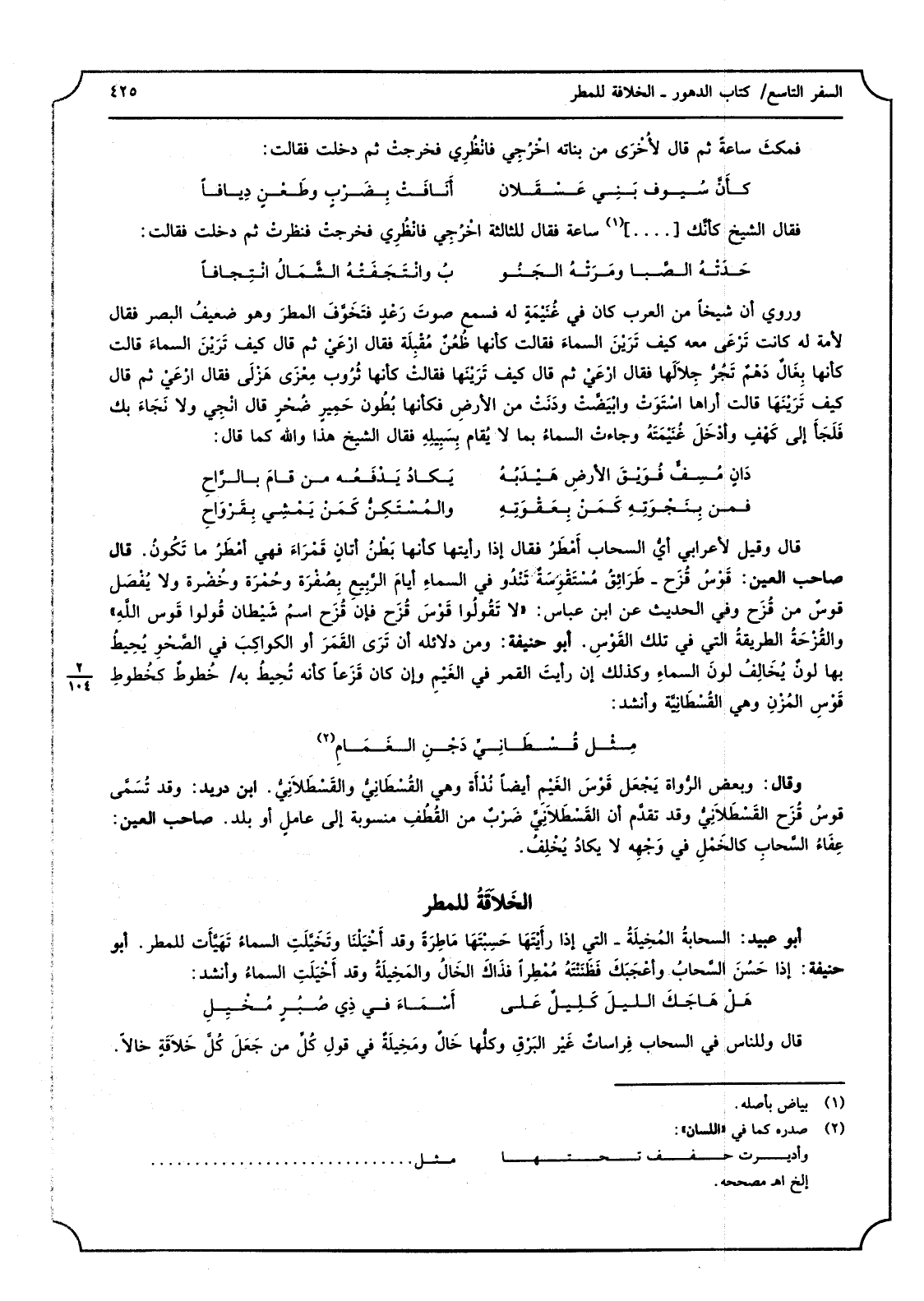 قَالَ وَقيل لأعرابي أيُّ السَّحَاب أَمْطَرُ فَقَالَ إِذا رَأَيْتهَا كَأَنَّهَا بَطْنُ أتانٍ قَمْرَاءَ فَهِيَ أمْطَرُ مَا تَكُونُ قَالَ صَاحب الْعين قَوْسُ قُزَح طَرَائِقُ مُسْتُقْوِسَةٌ تَنْدُو فِي السماءِ أيامَ الرَّبيعِ بَصُفْرَة وحُمْرَة وخَضْرة وَلَا يُفْصَل قوسٌ من قُزَح وَفِي الحَدِيث عَن ابْن عَبَّاس لَا تَقُولُوا قَوْسَ قُزَح فَإِن قُزَح اسمُ شَيْطان قُولوا قَوس اللهِ والقُزْحَةُ الطريقةُ الَّتِي فِي تِلْكَ القَوْسِ أَبُو حنيفَة وَمن دلائله أَن تَرَى القَمَرَ ? الكواكِبَ فِي الصَّحْوِ يُحِيطُ بهَا لونٌ يُخَالِفُ لونَ السماءِ وَكَذَلِكَ إِن رأيتَ الْقَمَر فِي الغَيْمِ وَإِن كَانَ قَزَعاً كَأَنَّهُ تُحِيطُ بِهِ خُطوطٌ كخُطوطِ قَوْسِ المُزْنِ وَهِي القُسْطَانِيَّة وَأنْشد