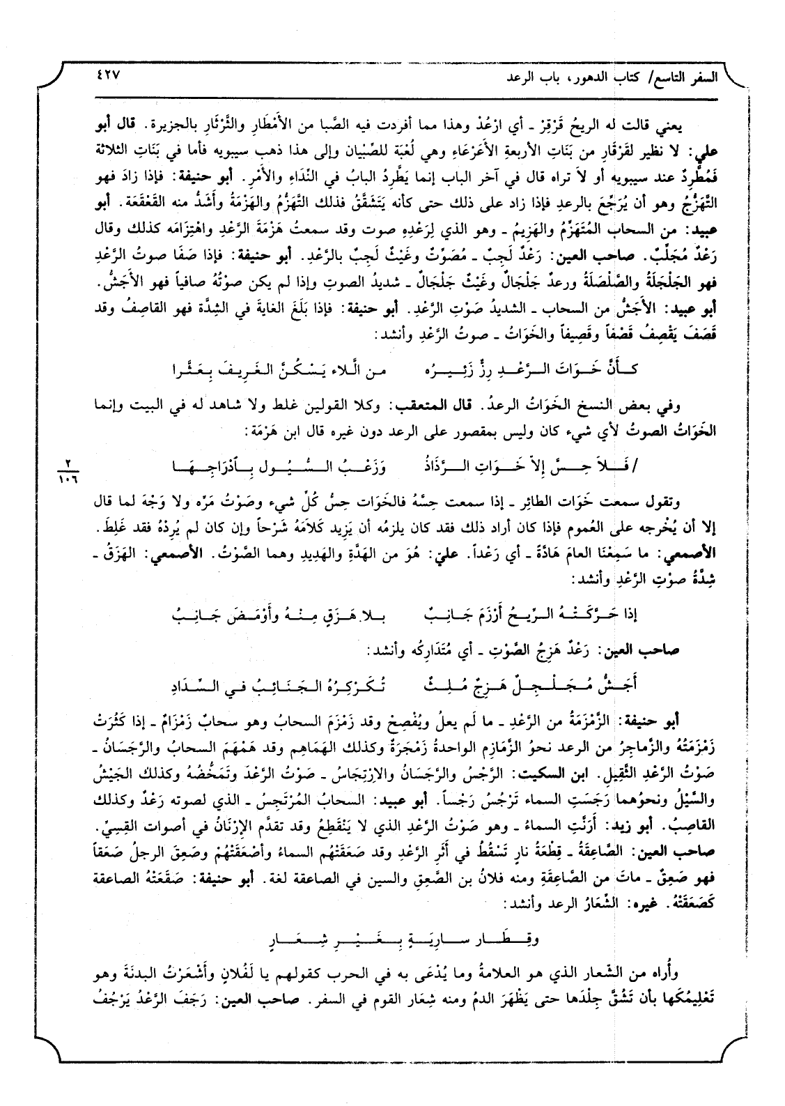 يَعْنِي قَالَت لَهُ الريحُ قَرْقِرْ أَي ارْعُدْ وَهَذَا مِمَّا أفردت فِيهِ الصَّبا من الأمْطَارِ والثَّرْثَارِ بالجزيرة أَبُو عَليّ لَا نَظِير لقَرْقَارِ من بَنَاتِ الأربعةِ الأَعَرْعَاءِ وَهِي لُعْبَة للصِّبْيان وَإِلَى هَذَا ذهب سِيبَوَيْهٍ فَأَما فِي بَنَاتِ الثَّلَاثَة فَمُطَّرِدٌ عِنْد سِيبَوَيْهٍ أَو لَا ترَاهُ قَالَ فِي آخر الْبَاب إِنَّمَا يَطَّرِدُ البابُ فِي النِّداءِ والأَمْرِ أَبُو حنيفَة فَإِذا زادَ فَهُوَ التَّهَزُّجُ وَهُوَ أَن يُرْجِّعَ بالرَّعدِ فَإِذا زَاد على ذَلِك حَتَّى كَأَنَّهُ يَتَشَقَّقُ فَذَلِك التَّهَزُّمُ والهَزْمَةُ وأَشَدُّ مِنْهُ القَعْقَعَة أَبُو عبيد من السَّحَاب المُتَهَزِّمُ والهَزِيمُ وَهُوَ الَّذِي لِرَعْدِهِ صَوت وَقد سمعتُ هَزْمَةَ الرَّعْدِ واهْتِزَامَه كَذَلِك وَقَالَ رَعْدٌ مُجَلِّبٌ صَاحب الْعين رَعْدٌ لَجِبٌ مُصَوِّتٌ وغَيْثٌ لَجِبٌ بالرَّعْدِ أَبُو حنيفَة فَإِذا صَفَا صوتُ الرَّعْدِ فَهُوَ الجَلْجَلَةُ والصَّلْصَلَةُ ورعدٌ جَلْجَالٌ وغَيْثٌ جَلْجَالٌ شديدُ الصَّوْت وَإِذا لم يكن صَوْتُهُ صافياً فَهُوَ الأَجَشُّ أَبُو عبيد الأَجَشُّ من السَّحَاب الشديدُ صَوْتِ الرَّعْدِ أَبُو حنيفَة فَإِذا بَلَغَ الغايةَ فِي الشِدَّة فَهُوَ القاصِفُ وَقد قَصَفَ يَقْصِفُ قَصْفاً وقَصِيفاً والخَوَاتُ صَوْتُ الرَّعْدِ وَأنْشد