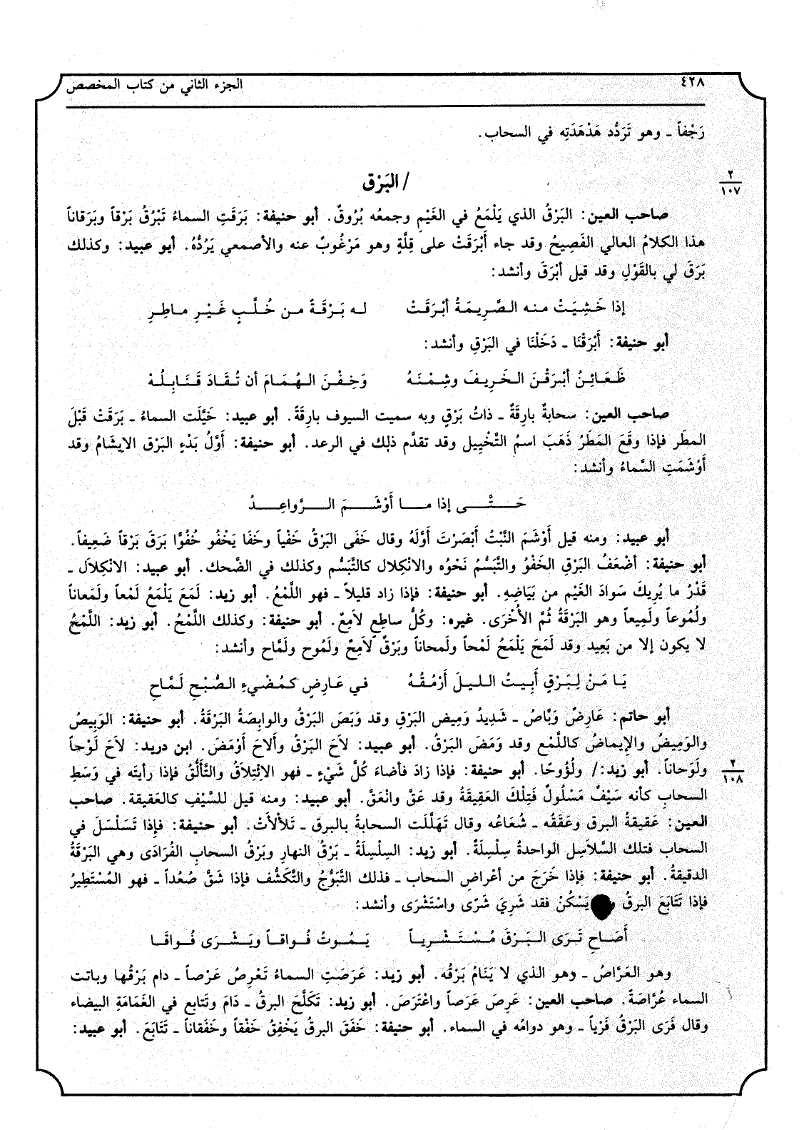 أَبُو حَاتِم عَارِضٌ وَبَّاصُ شَدِيدُ وَمِيض البَرْقِ وَقد وَبَصَ البَرْقُ والوابِصَةُ البَرْقَةُ أَبُو حنيفَة الوَبِيصُ والوَمِيضُ والإِيماضُ كاللَّمْع وَقد وَمَضَ البَرْقُ أَبُو عبيد لاَحَ البَرْقُ وأَلاَحَ أَوْمَضَ ابْن دُرَيْد لاَحَ لَوْحاً ولَوَحاناً أَبُو زيد ولُؤُوحاً أَبُو حنيفَة فَإِذا زادَ فأضاءَ كُلَّ شَيْءٍ فَهُوَ الائْتَلاَقُ والتَّأَلُّقُ فَإِذا رأيتَه فِي وَسَطِ السَّحَاب كَأَنَّهُ سَيْفٌ مَسْلُولٌ فَتِلْكَ العَقِيقَةُ وَقد عَقَّ وانْعَقَّ أَبُو عبيد وَمِنْه قيل للسَّيْفِ كالعَقيقة صَاحب الْعين عَقيقةُ الْبَرْق وعَقَقُه شُعَاعُه وَقَالَ تَهَلَّلَت السحابةُ بالبرق تَلاْلاَتْ أَبُو حنيفَة فَإِذا تَسَلْسَلَ فِي السَّحَاب فَتلك السَّلاَسِل الواحدةُ سِلْسِلَةٌ أبوزيد السِلْسِلَةُ بَرْقُ النهارِ وبَرْقُ السحابِ الفُرَادَى وَهِي البَرْقَةُ الدقيقة أَبُو حنيفَة فَإِذا خَرَجَ من أعْراضِ السَّحَاب فَذَلِك التَّبَوُّجُ والتَّكَشُّف فَإِذا شَقَّ صُعُداً فَهُوَ المُسْتَطِيرُ فَإِذا تَتَابَعَ البرقُ وَلم يَسْكُنْ فقد شَرِيَ شَرًى واسْتَشْرَى وَأنْشد