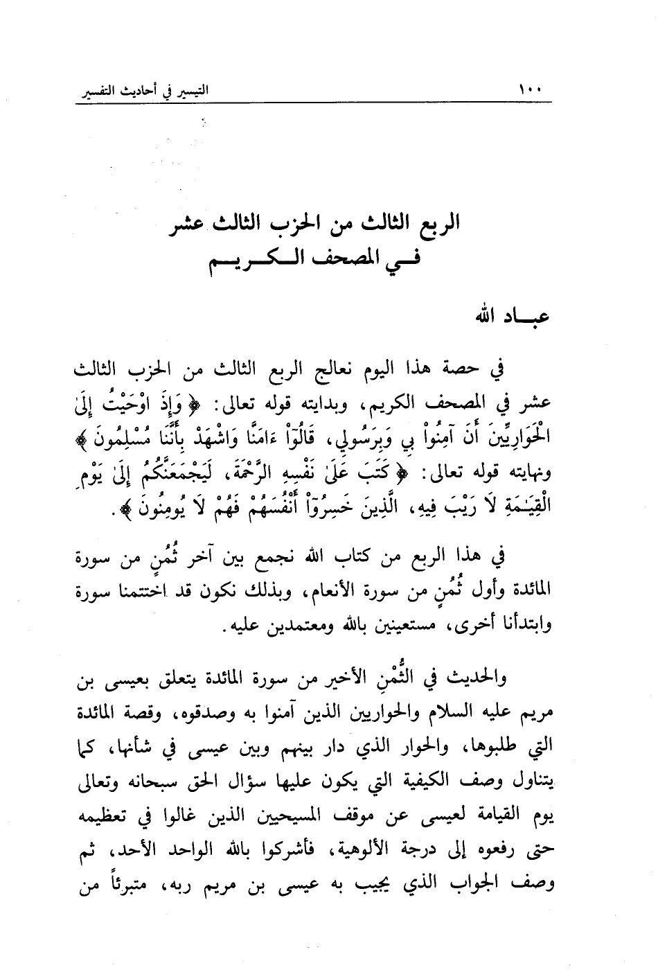 في حصة هذا اليوم نعالج الربع الثالث من الحزب الثالث عشر في المصحف الكريم، وبدايته قوله تعالى: {وَإِذْ أَوْحَيْتُ إِلَى الْحَوَارِيِّينَ أَنْ آمِنُوا بِي وَبِرَسُولِي قَالُوا آمَنَّا وَاشْهَدْ بِأَنَّنَا مُسْلِمُونَ} ونهايته قوله تعالى: {كَتَبَ عَلَى نَفْسِهِ الرَّحْمَةَ لَيَجْمَعَنَّكُمْ إِلَى يَوْمِ الْقِيَامَةِ لَا رَيْبَ فِيهِ الَّذِينَ خَسِرُوا أَنْفُسَهُمْ فَهُمْ لَا يُؤْمِنُونَ}.